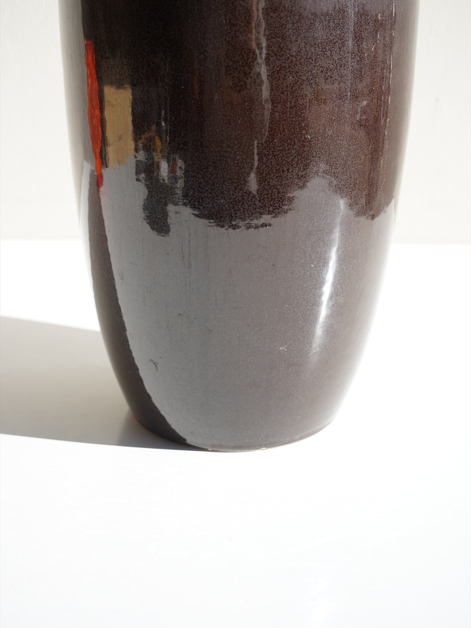 この作品の最大の魅力は、洗練されたフォルムと、大胆なツートンカラーのコントラストにあります。胴体の大部分は、深く艶やかなダークブラウンの釉薬で覆われており、落ち着いた重厚感があります。一方、口元から肩にかけては、当時のトレンドカラーであった鮮烈なオレンジのマット釉が水平に施され、シックなブラウンとの劇的な対比を生み出しています。
