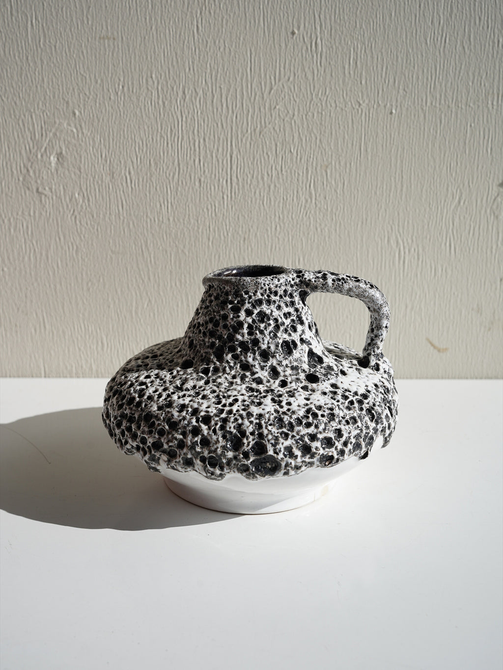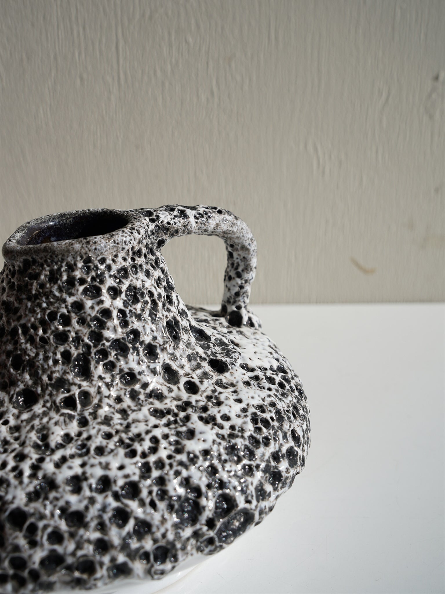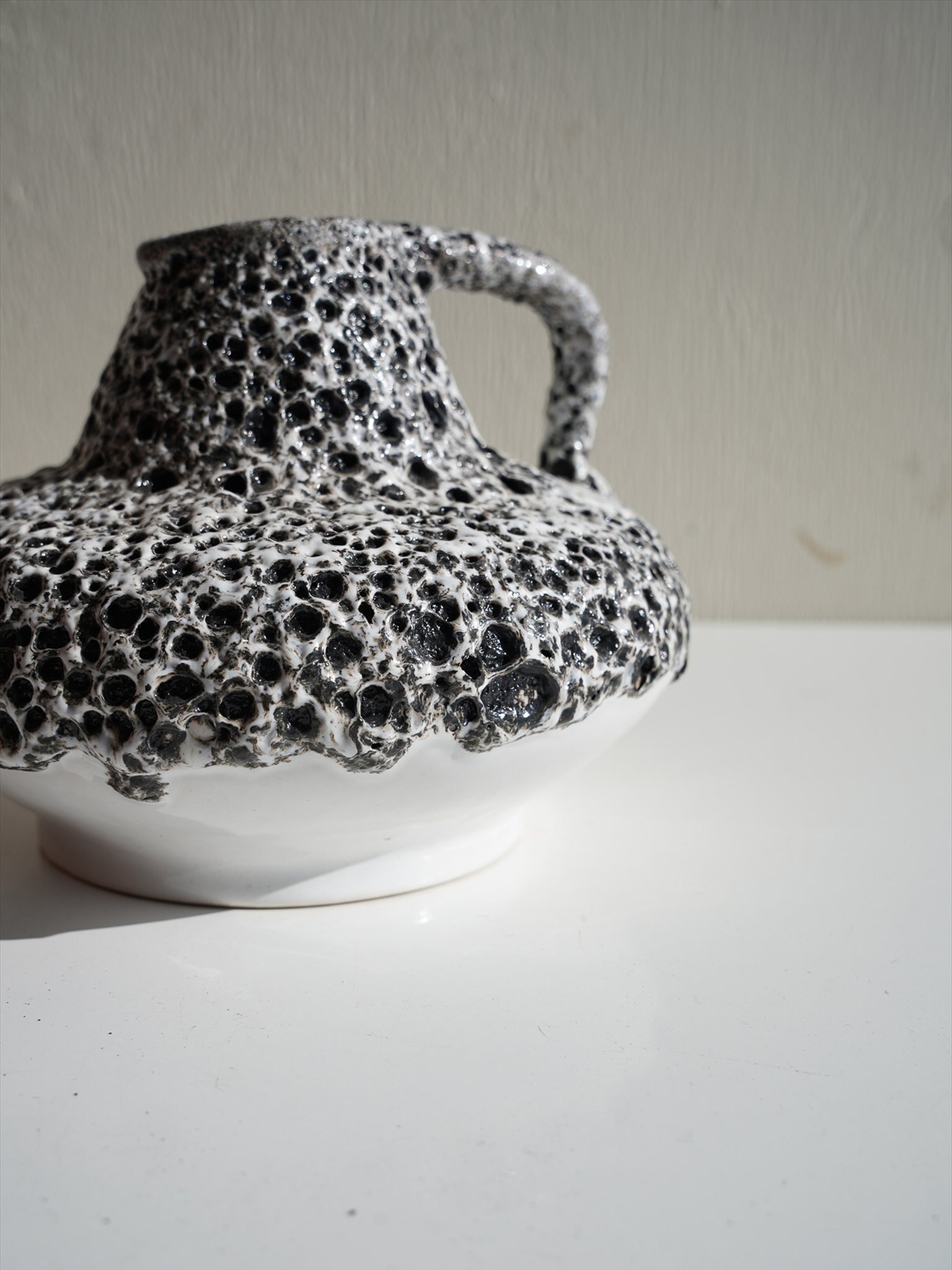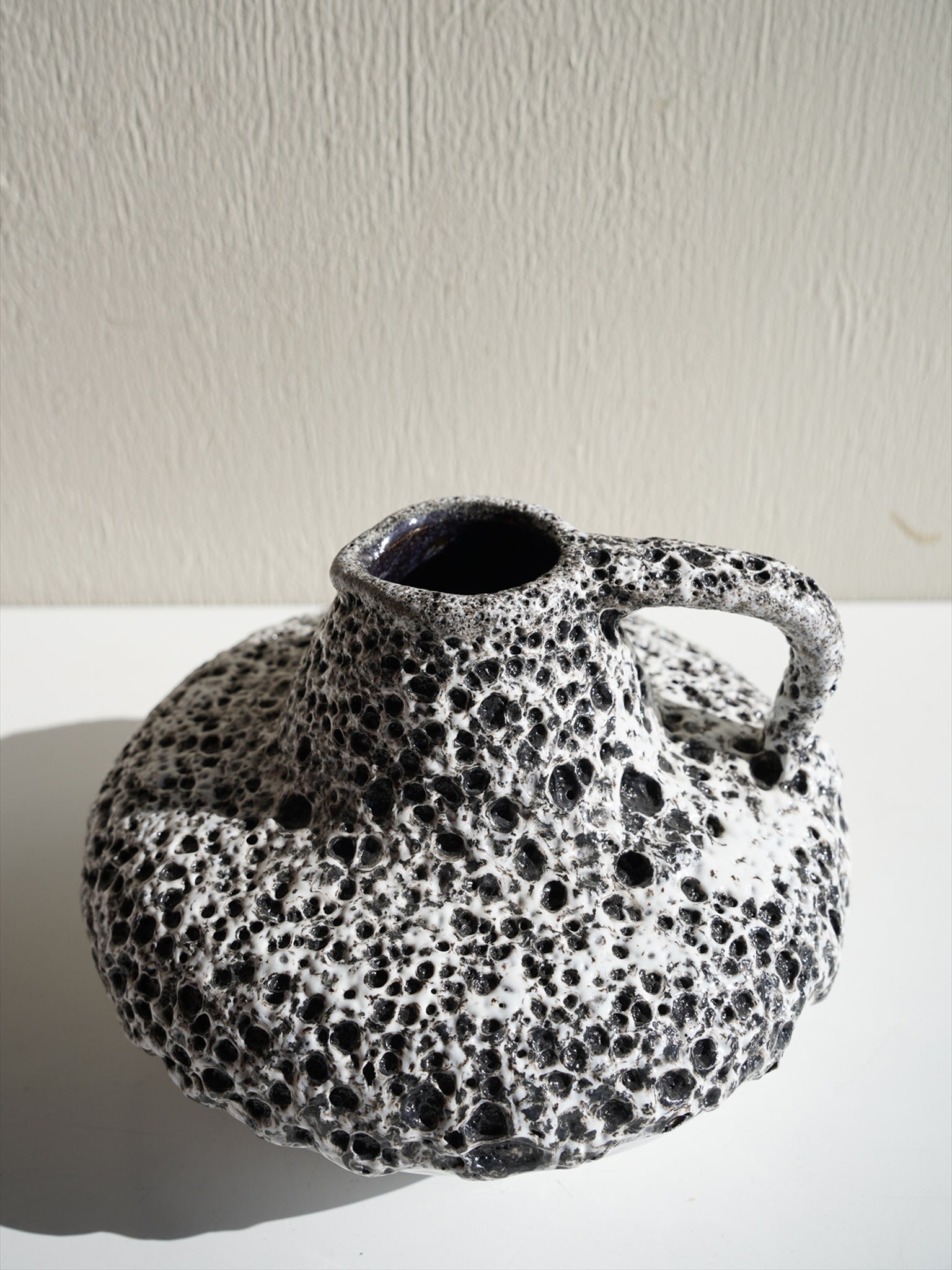 この作品の最大の魅力は、その圧倒的なテクスチャの迫力にあります。胴体全体と持ち手を覆うのは、白い釉薬の上に、黒い斑点が厚く、ゴツゴツと隆起した極端なFat Lava釉です。この荒々しい質感は、まるで月の表面や、冷却した火山岩を思わせる強烈な視覚的インパクトを放ちます。下部の滑らかな白い光沢釉との対比が、作品に彫刻的な深みを与えています。