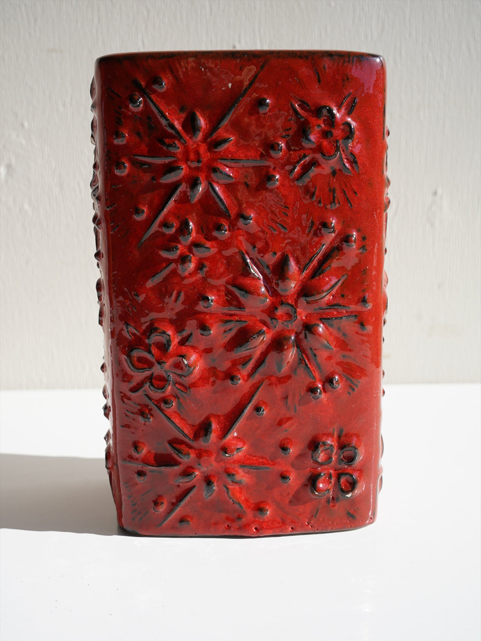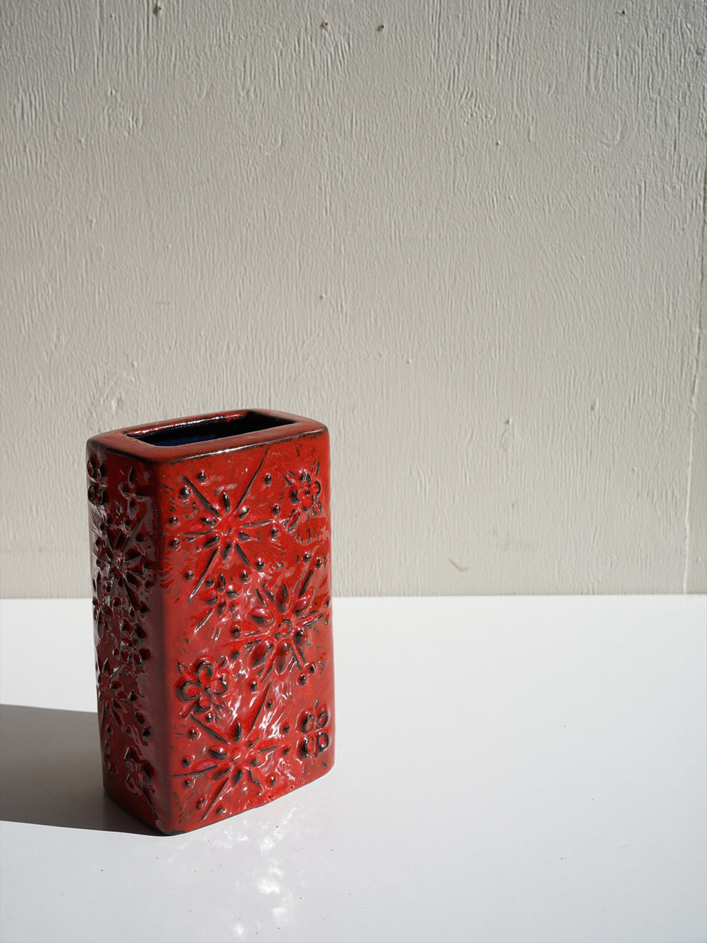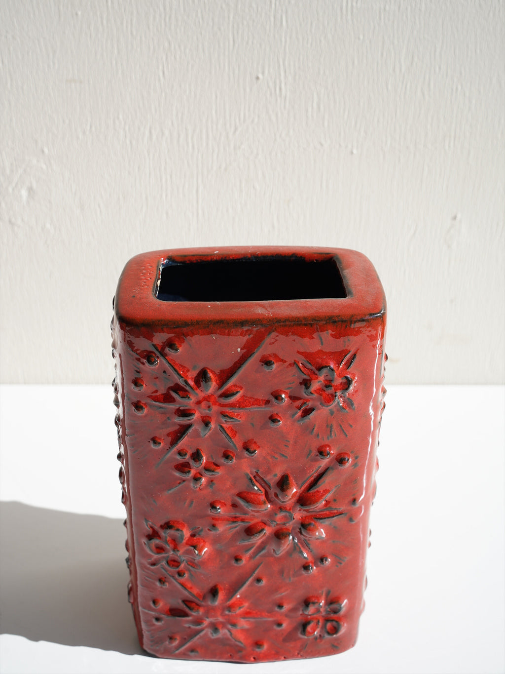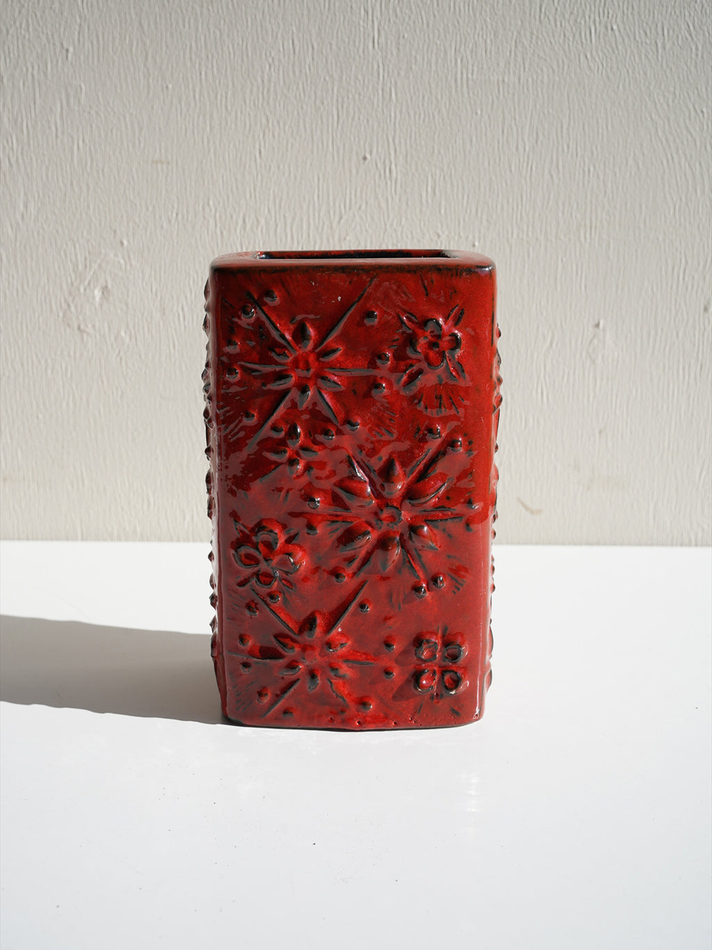 シャープでモダンな四角いフォルムと、高さ21cmという飾りやすいサイズ感も魅力です。Scheurichの数あるレリーフデザインの中でも特に人気の高いこのパターンは、ミッドセンチュリーモダンのインテリアに情熱的で洗練されたアクセントを加える、コレクターに人気の高い逸品です。