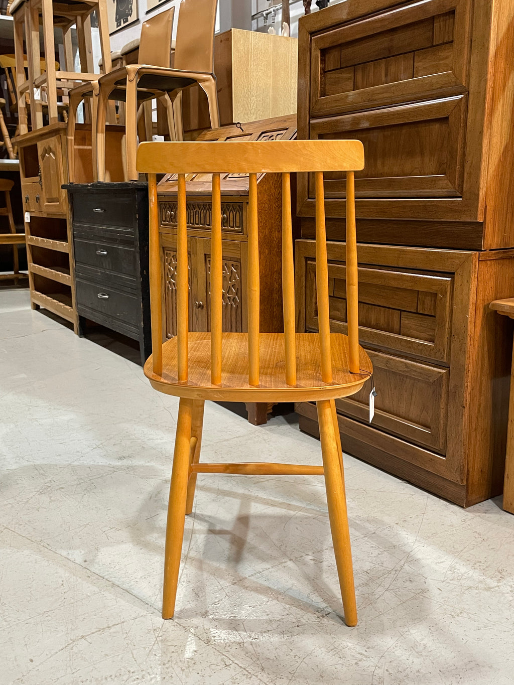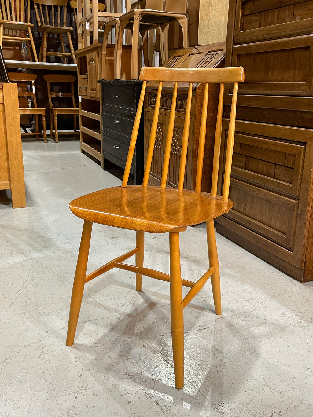 明るい木肌と、優雅な曲線が調和したヴィンテージダイニングチェアです。