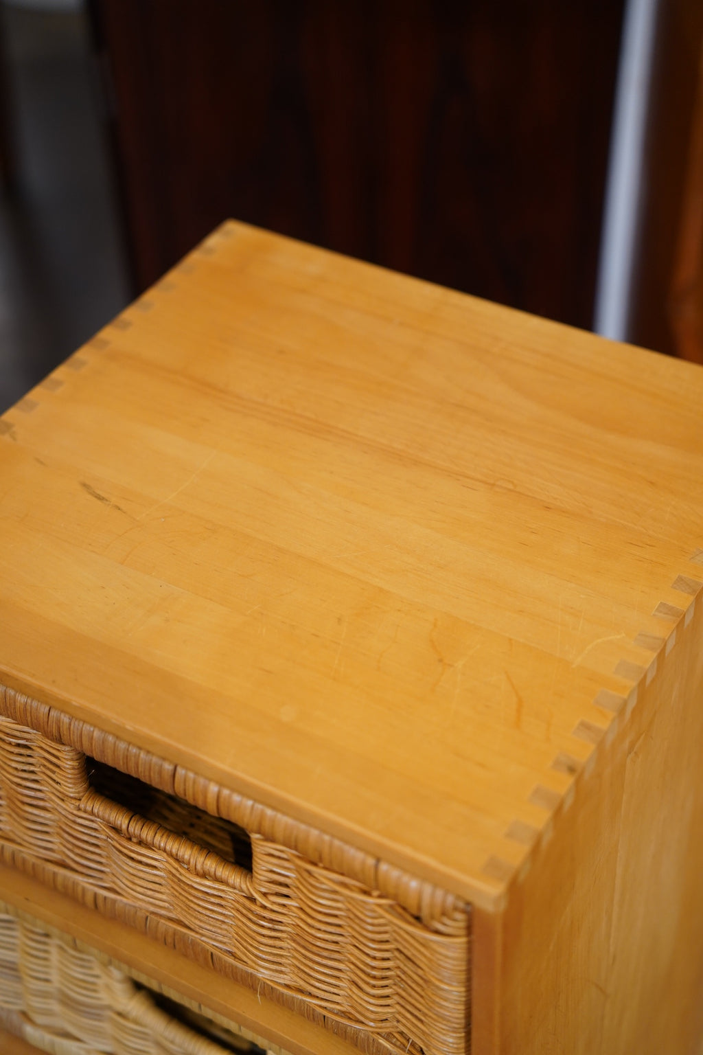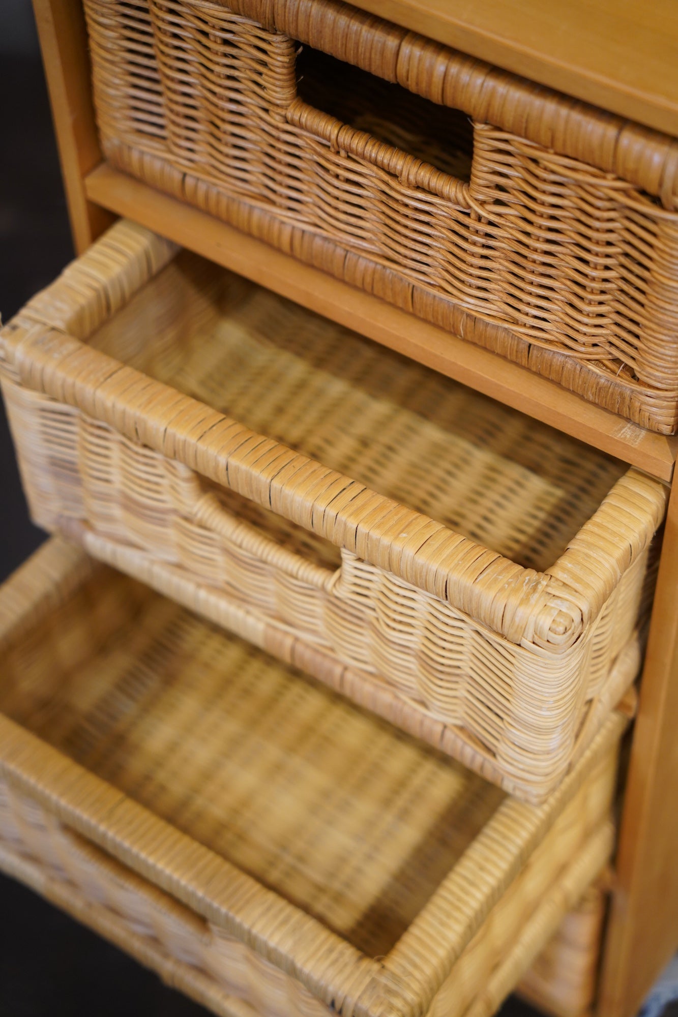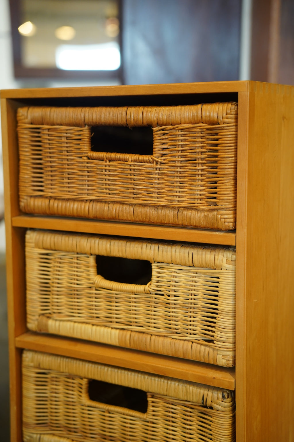 一方、引き出しには天然素材のラタンが使われており、素材のコントラストが際立っています。