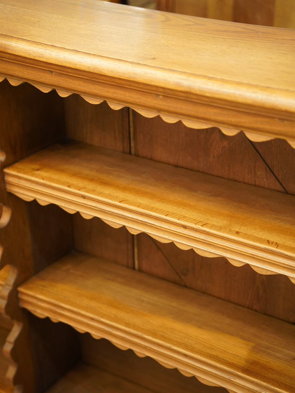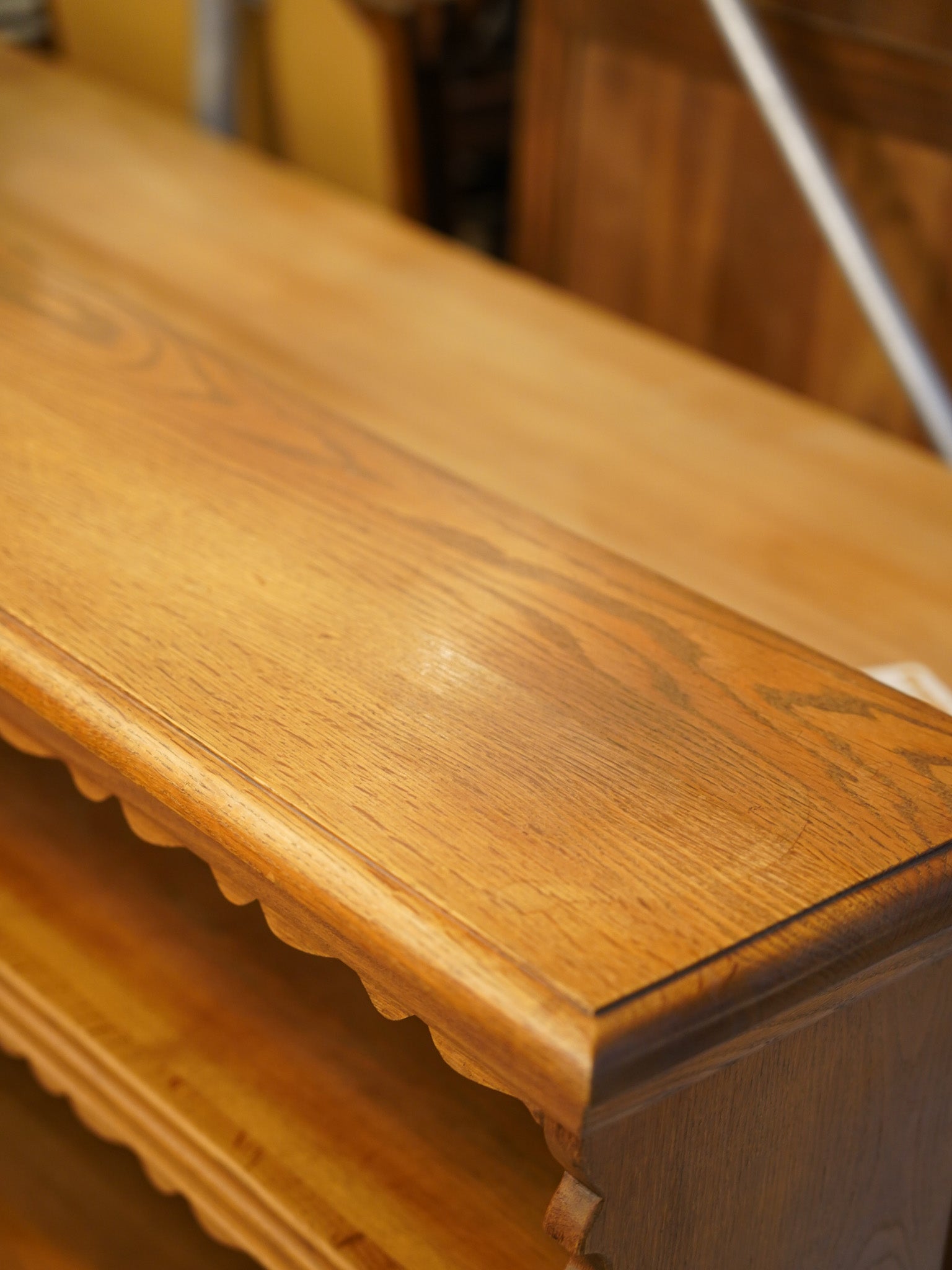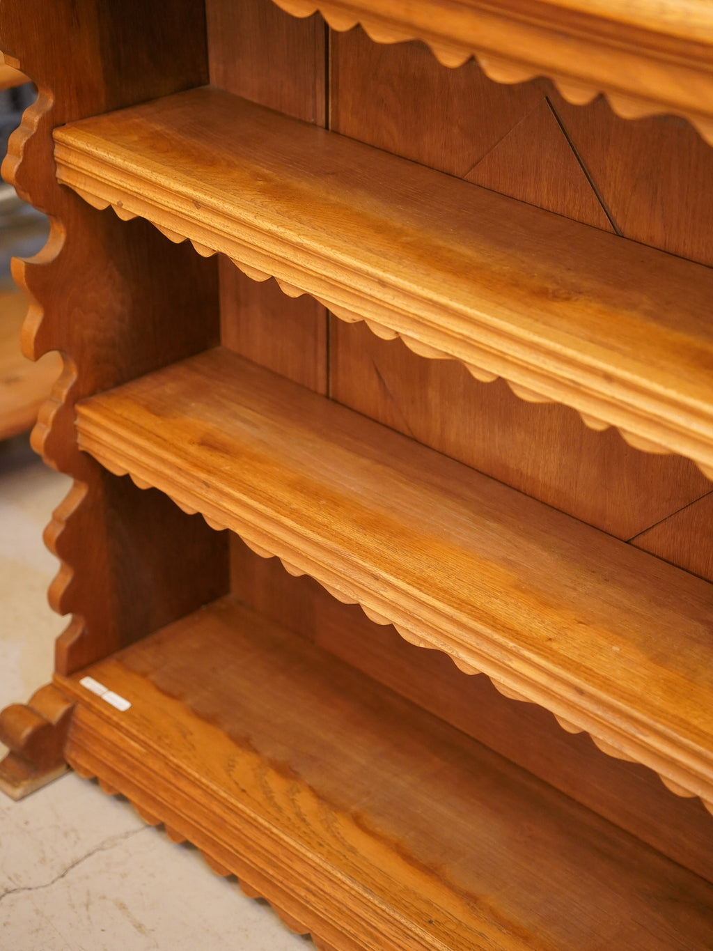 棚板の前面と天板の縁に見られるスカラップ装飾が特徴的で、ヴィンテージならではの風合いを感じられるアイテムです。