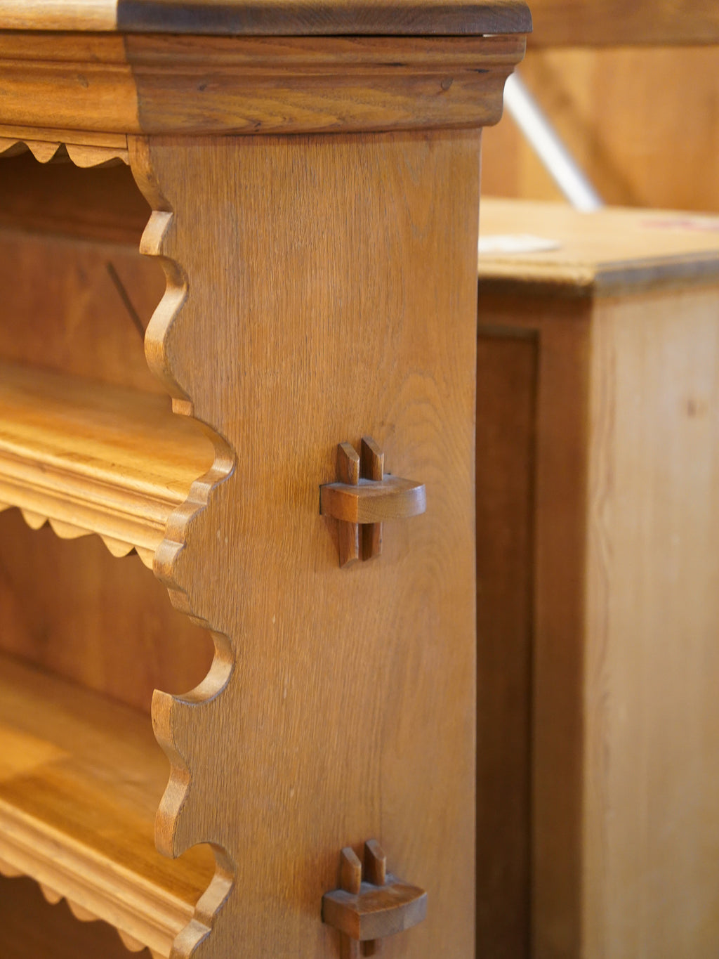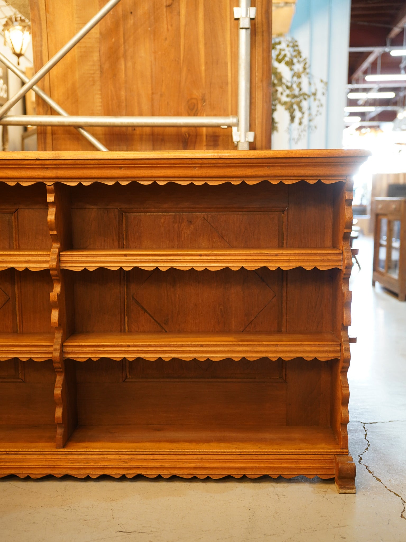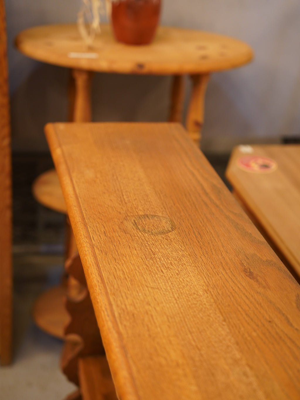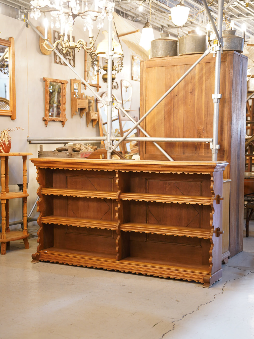 棚板の前面と天板の縁に見られるスカラップ装飾が特徴的で、ヴィンテージならではの風合いを感じられるアイテムです。