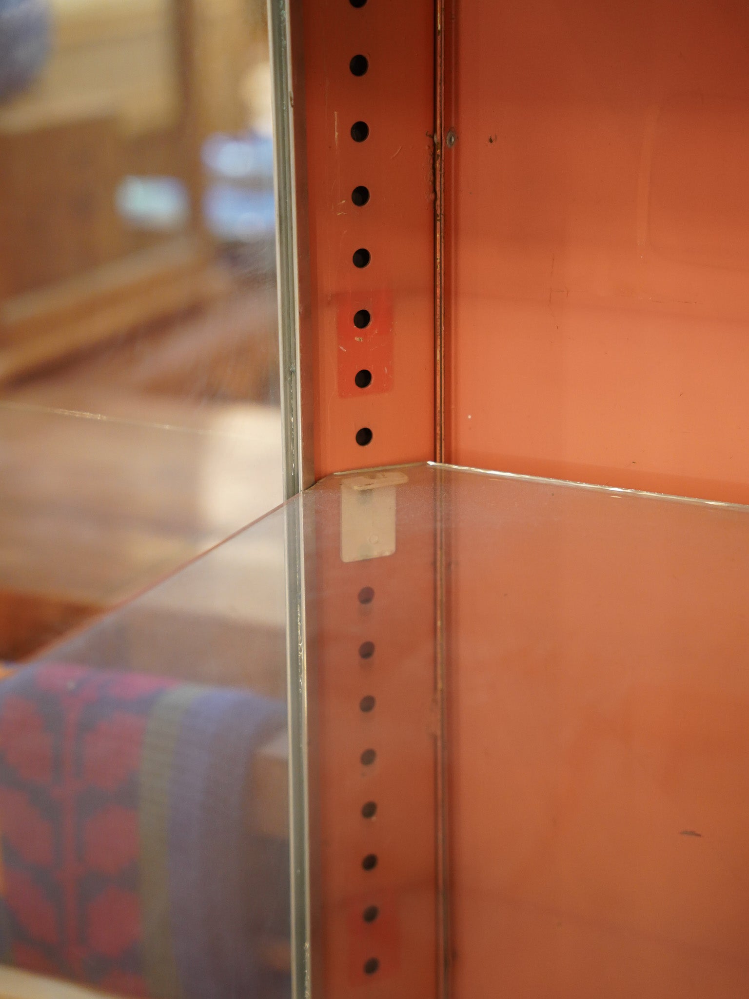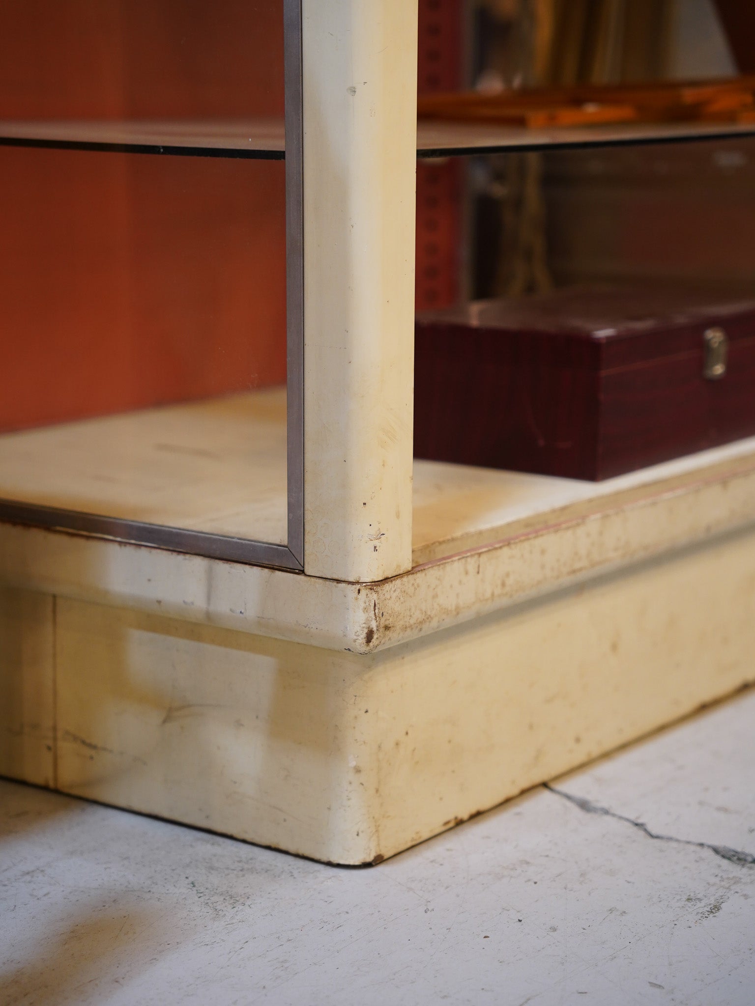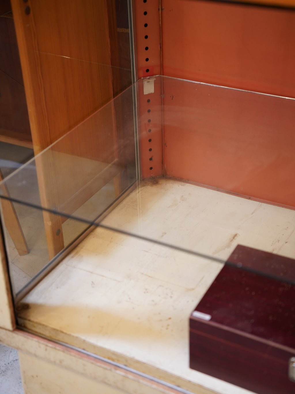 アイボリーとオレンジの組み合わせがレトロな印象で、ディスプレイをより引き立てる珍しい色合いのコントラストがこのショーケースの特徴です。