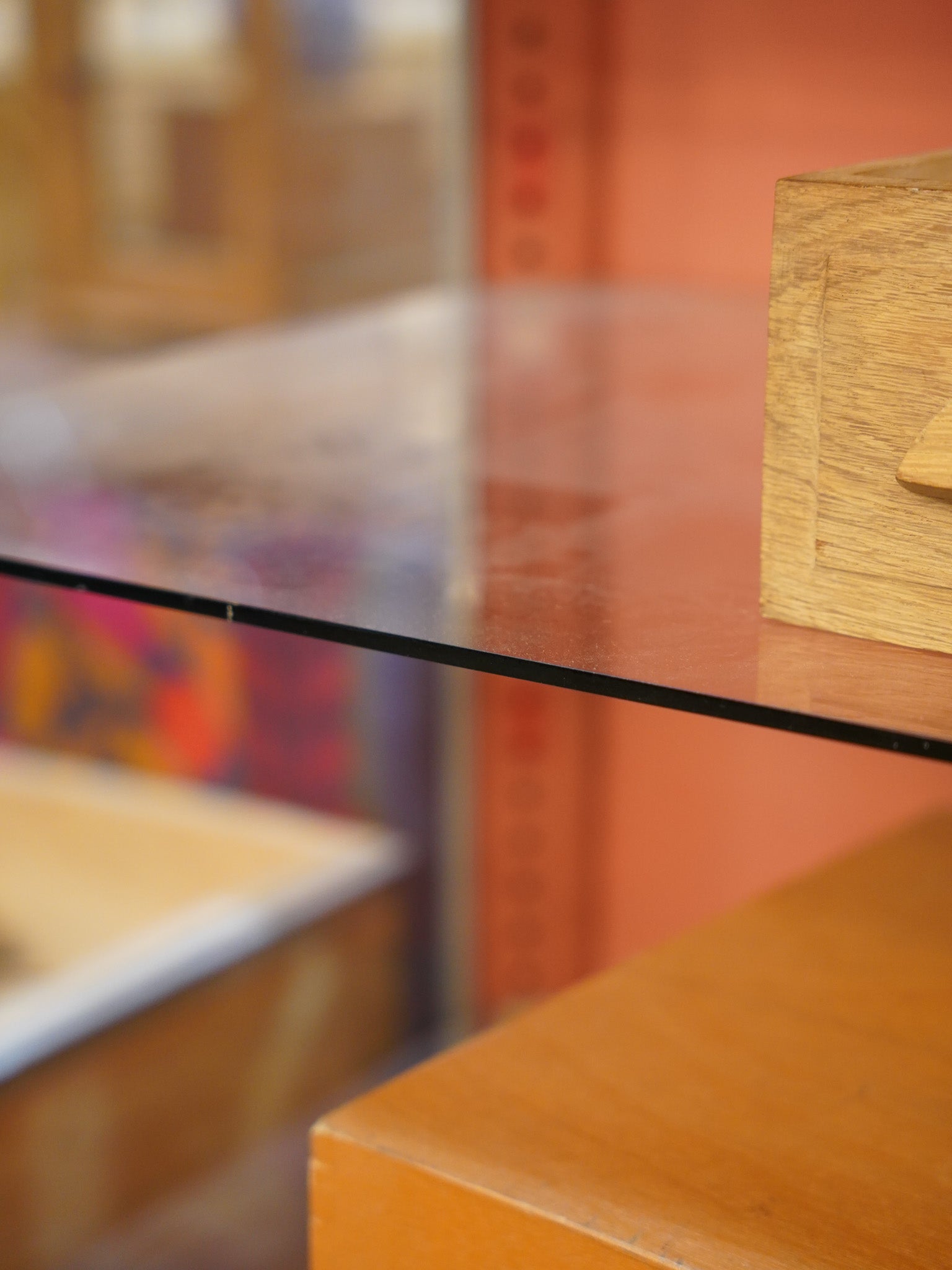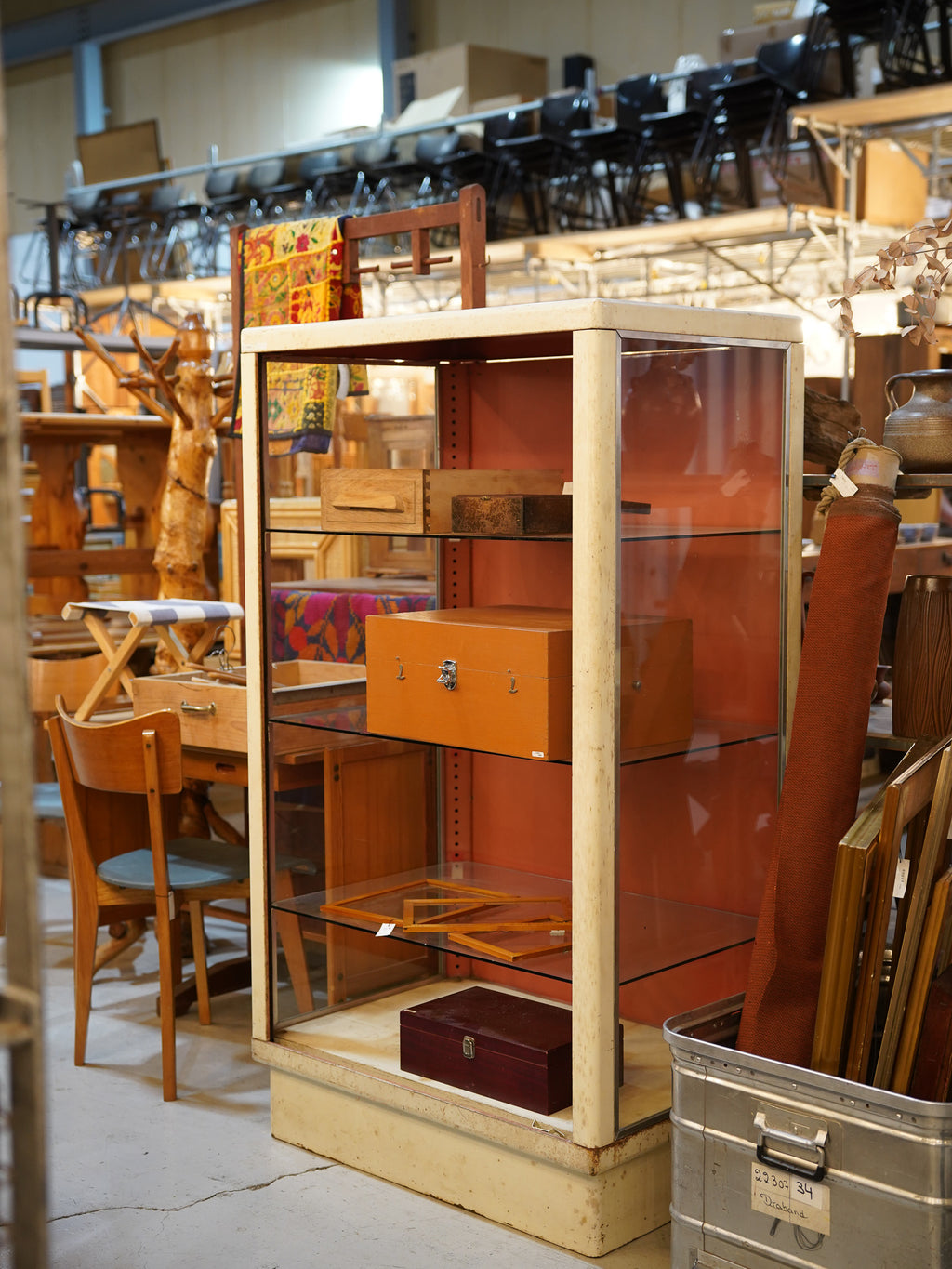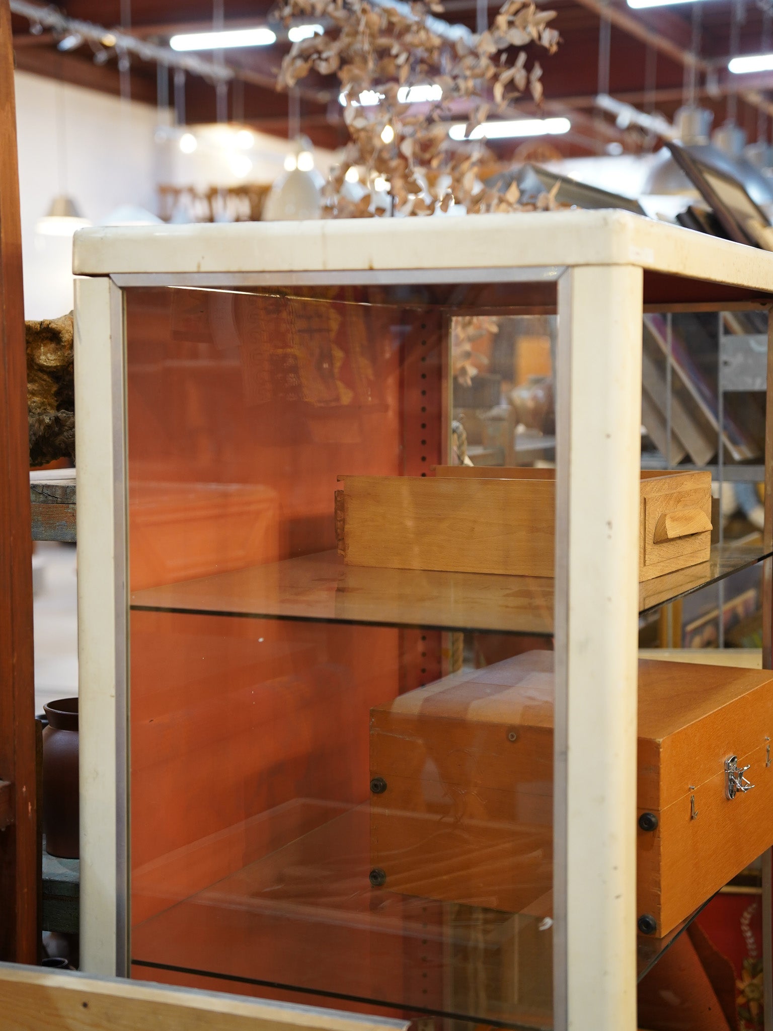アイボリーとオレンジの組み合わせがレトロな印象で、ディスプレイをより引き立てる珍しい色合いのコントラストがこのショーケースの特徴です。