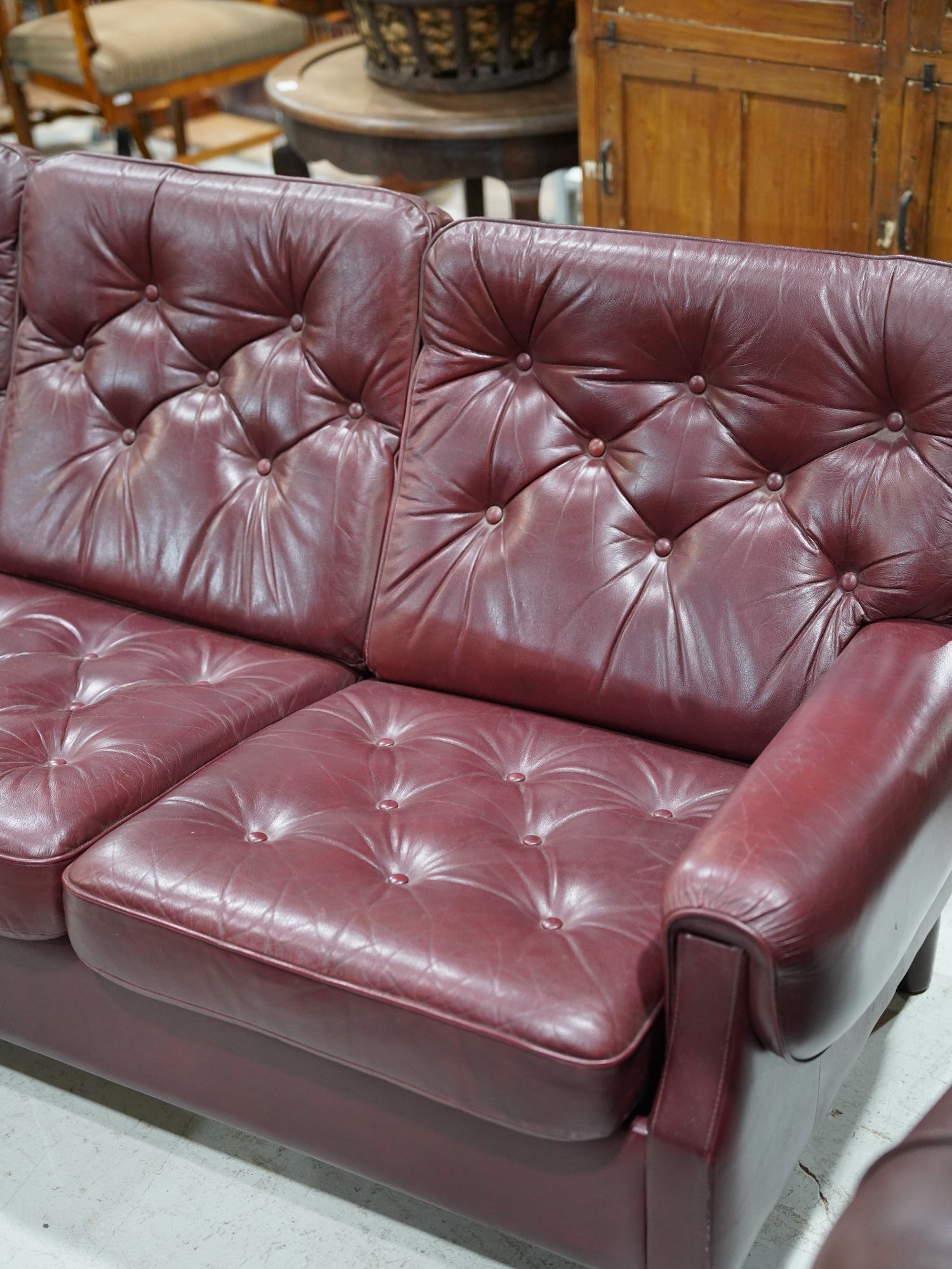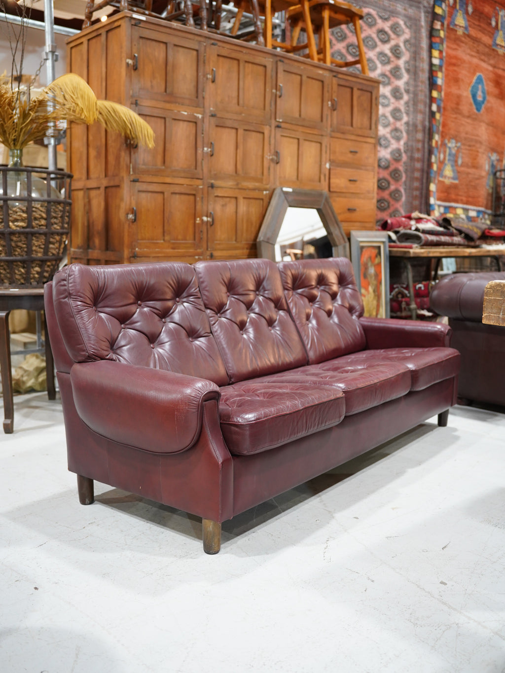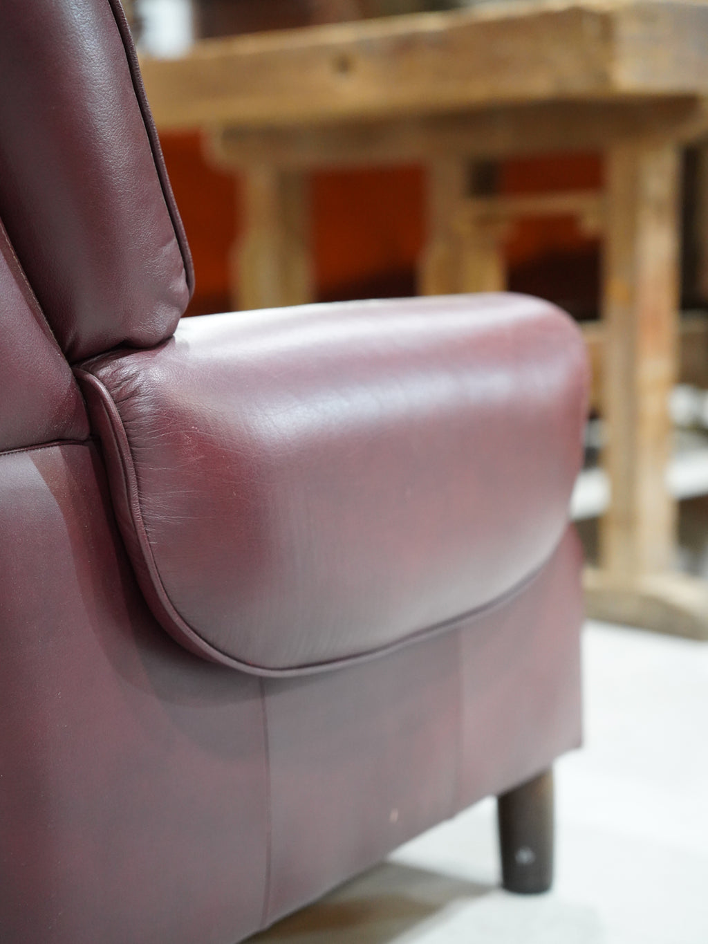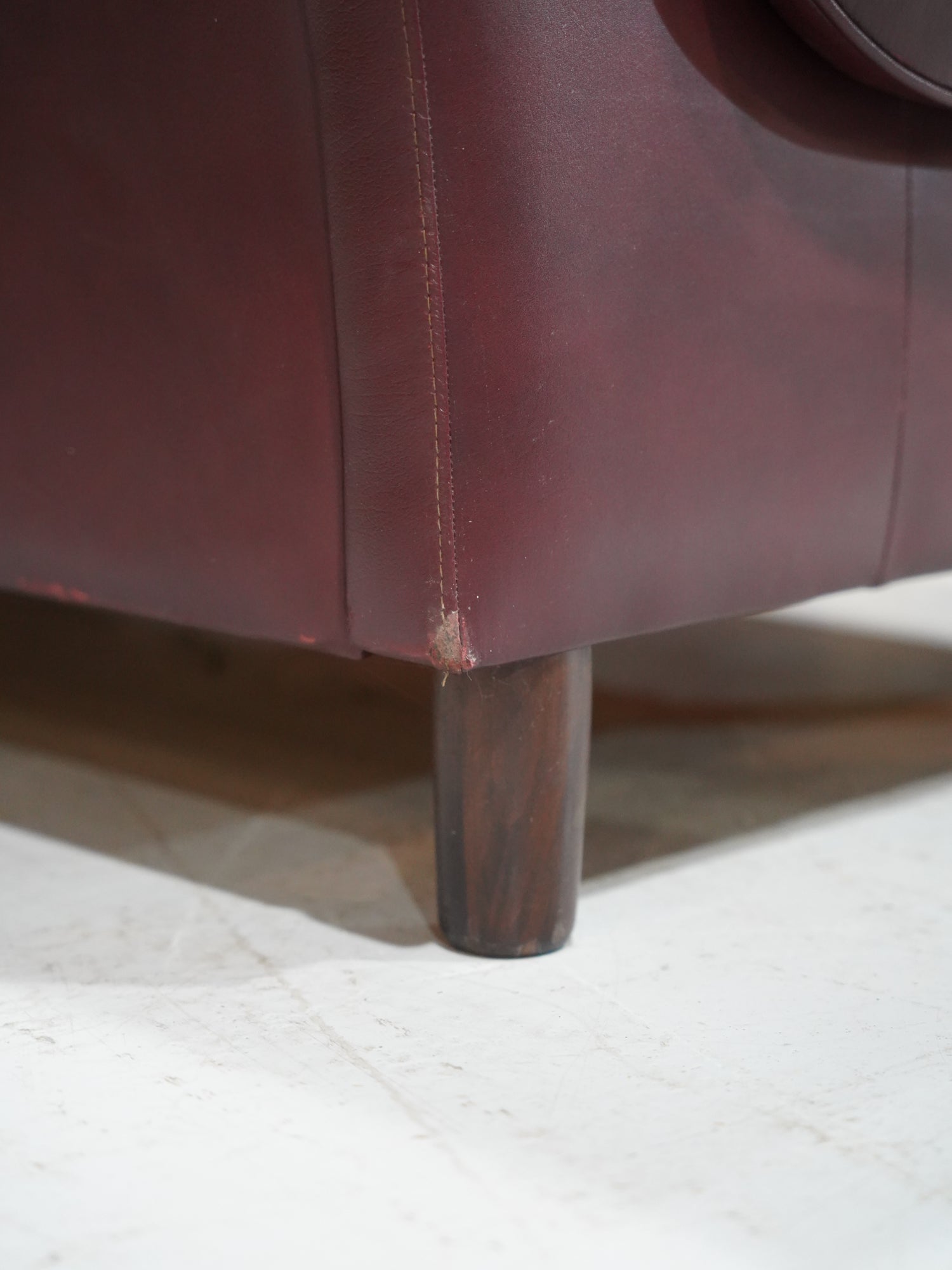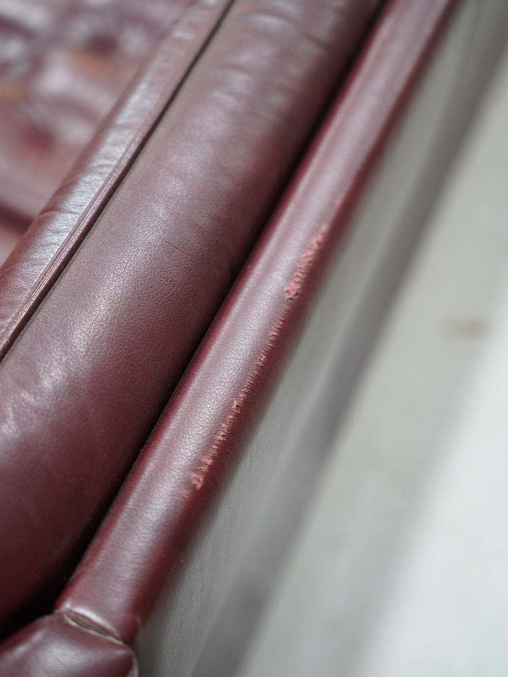 深みのあるボルドーカラーが魅力の、3シーターレザーソファ。
