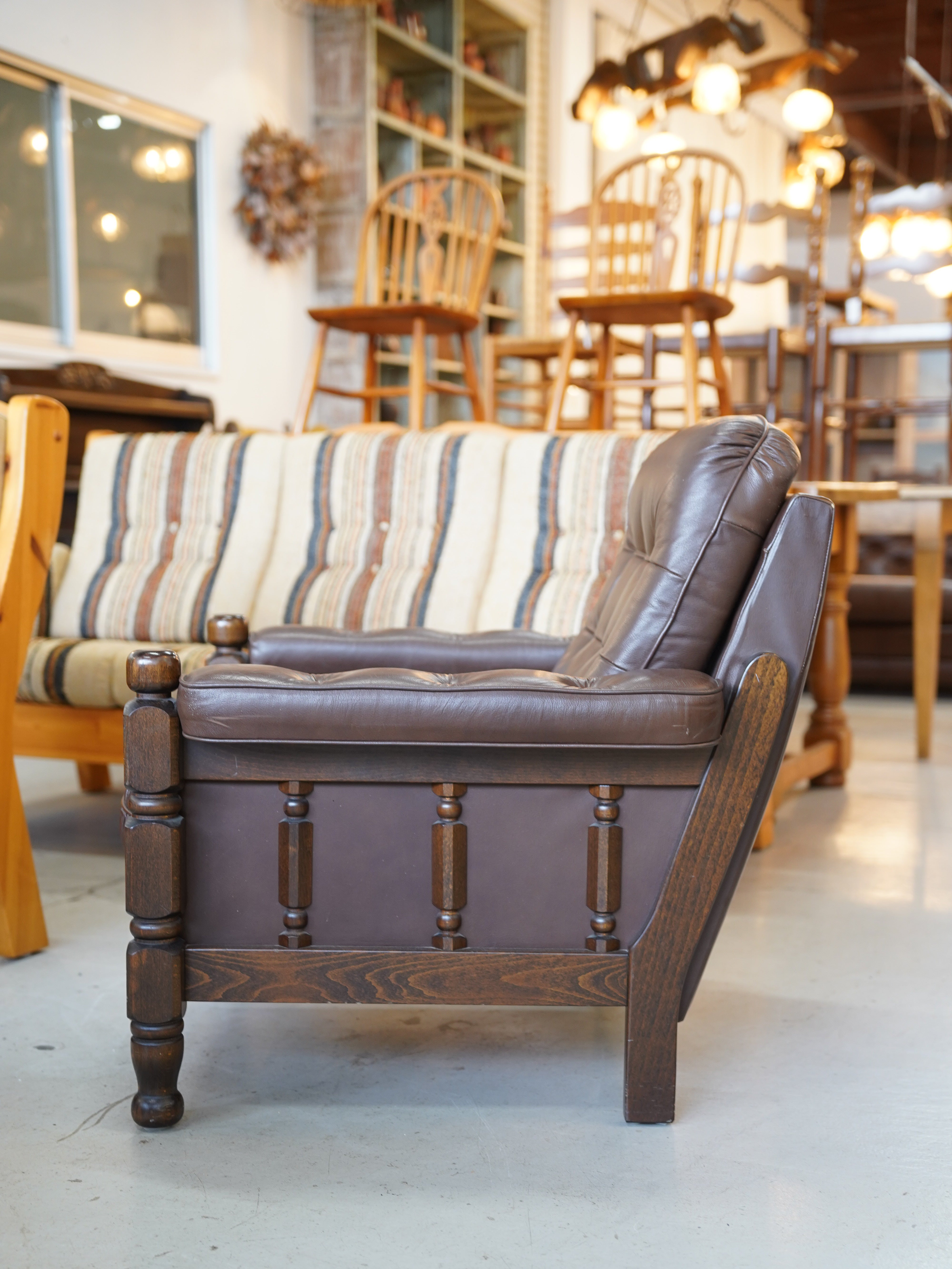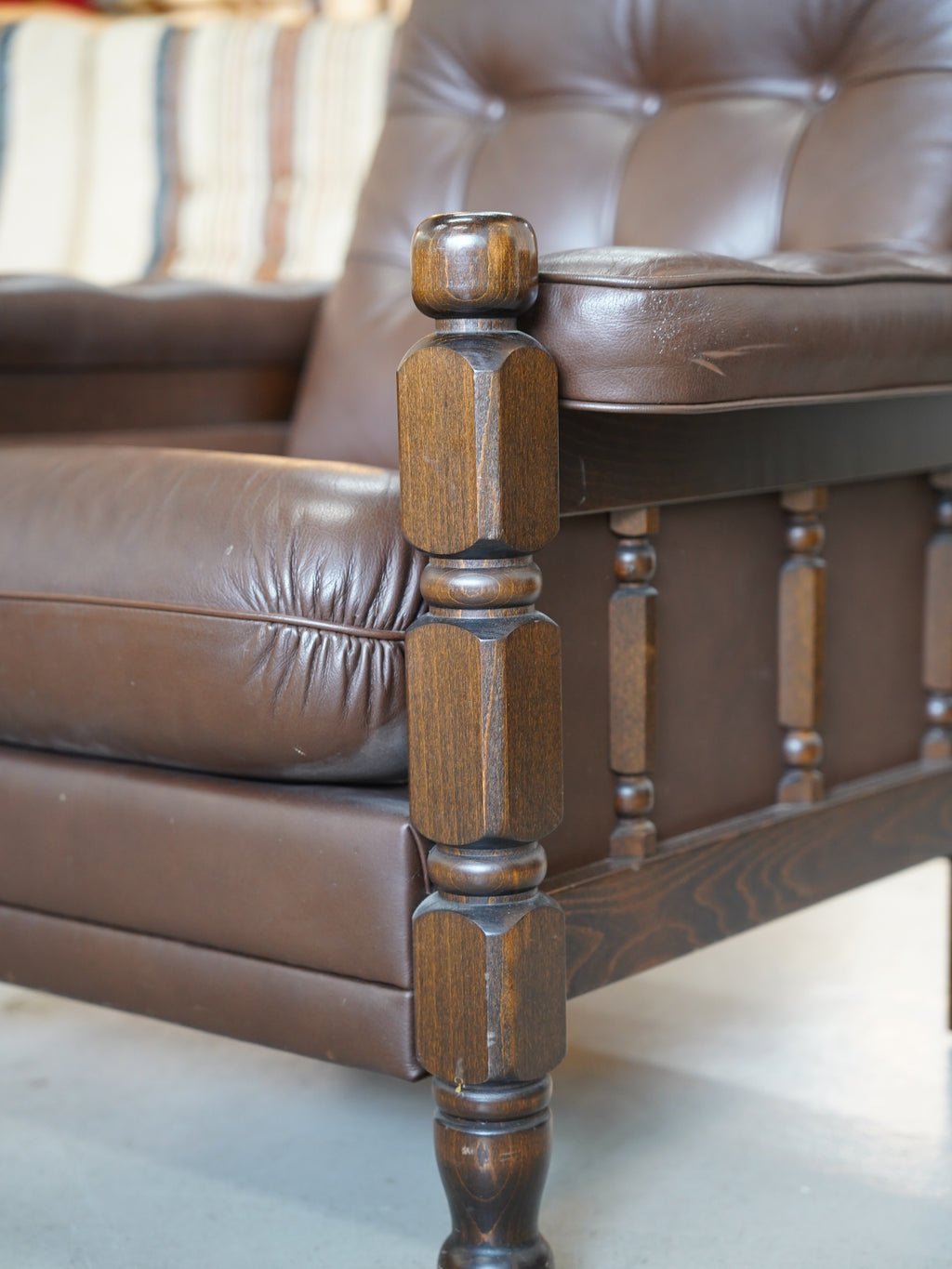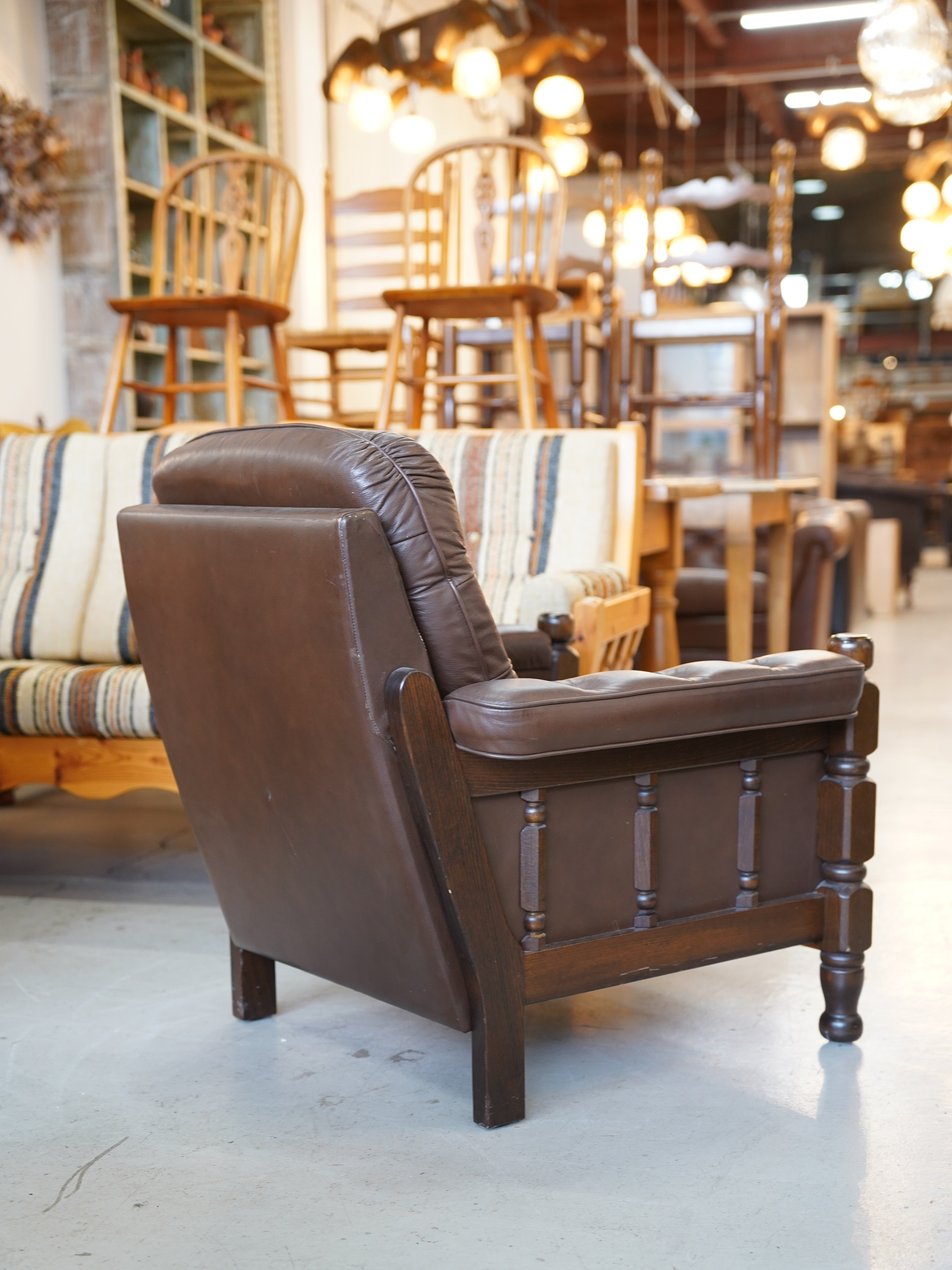 がっしりとした木製フレームに、深みのあるブラウンレザーのクッションを合わせたヴィンテージアームチェアです。