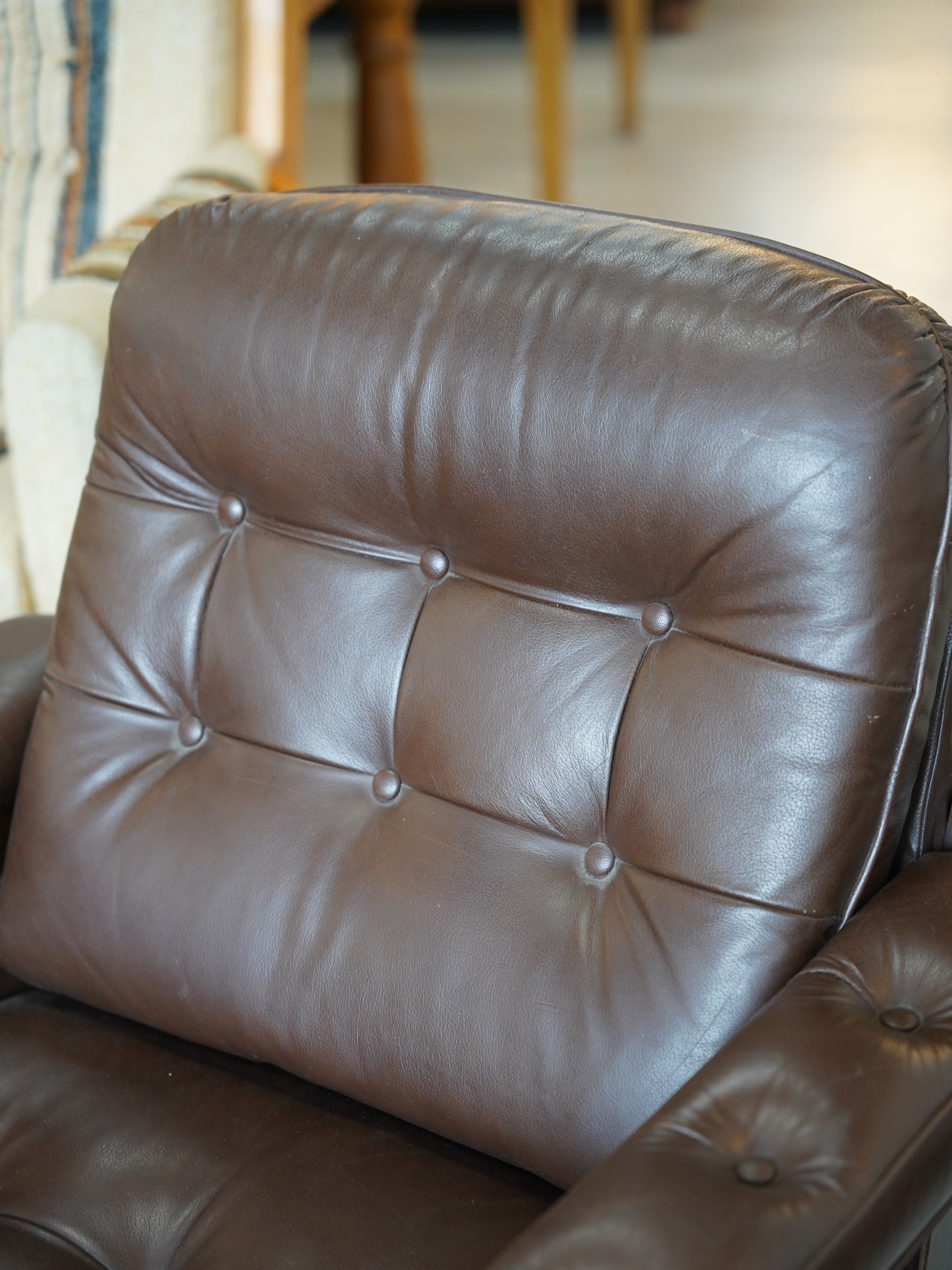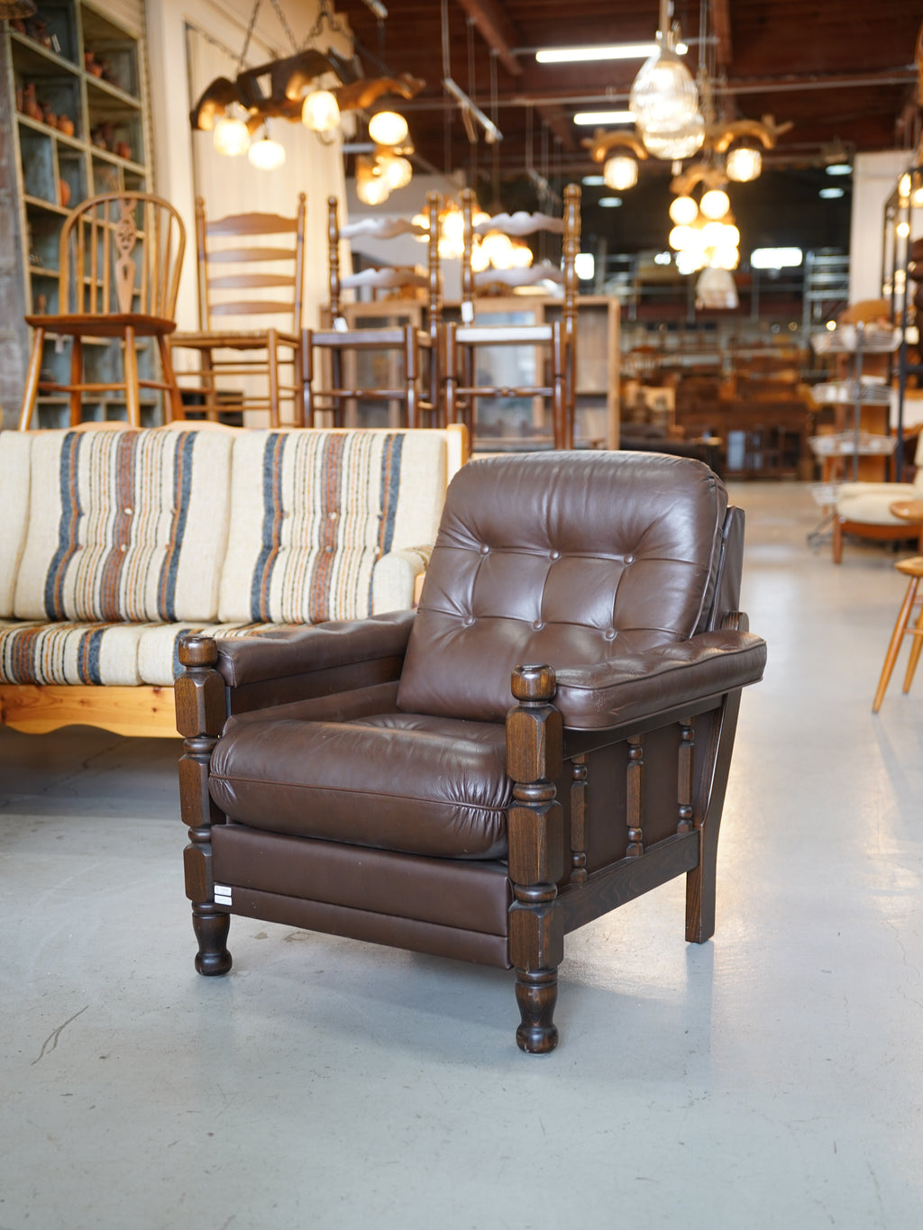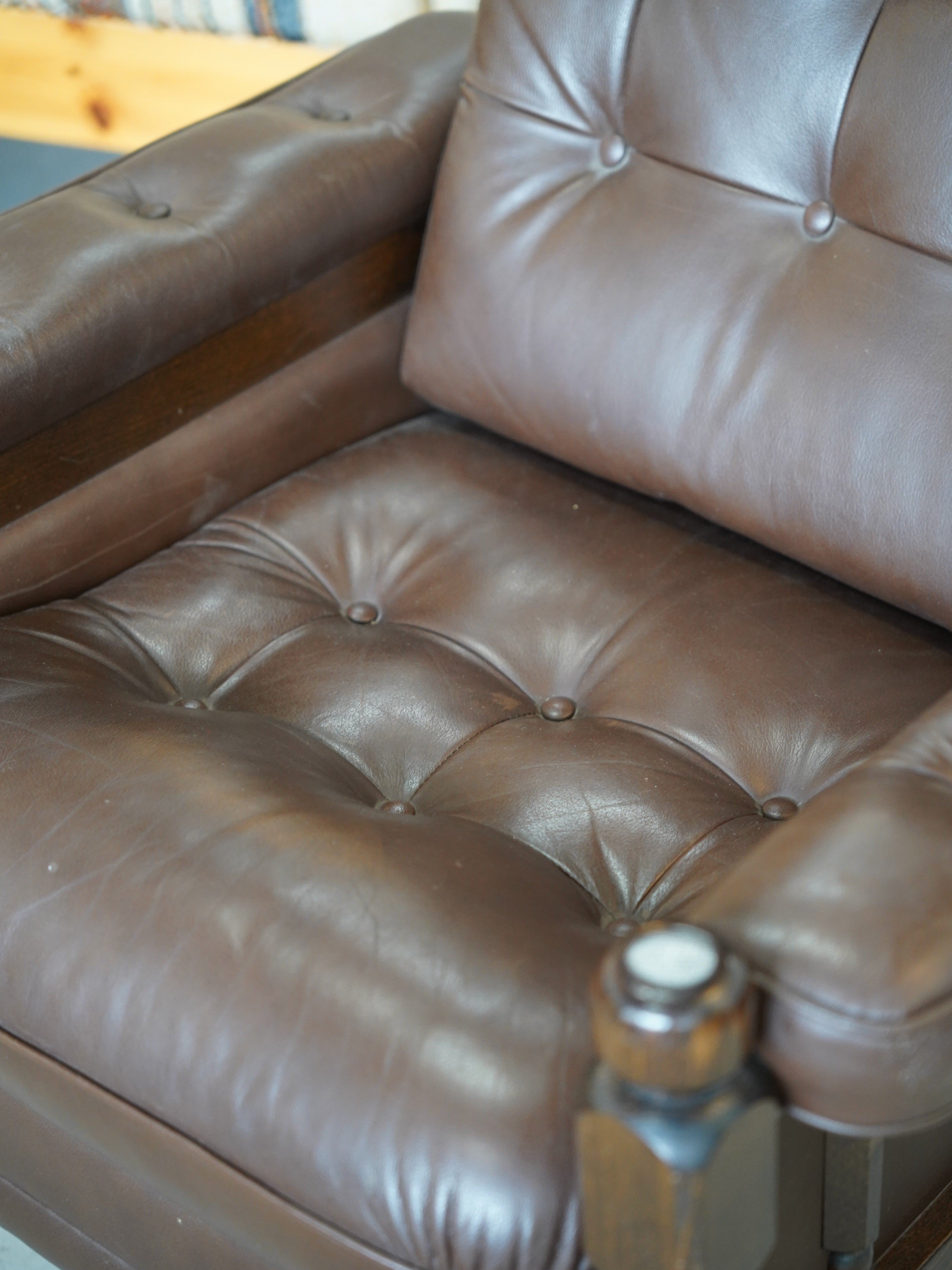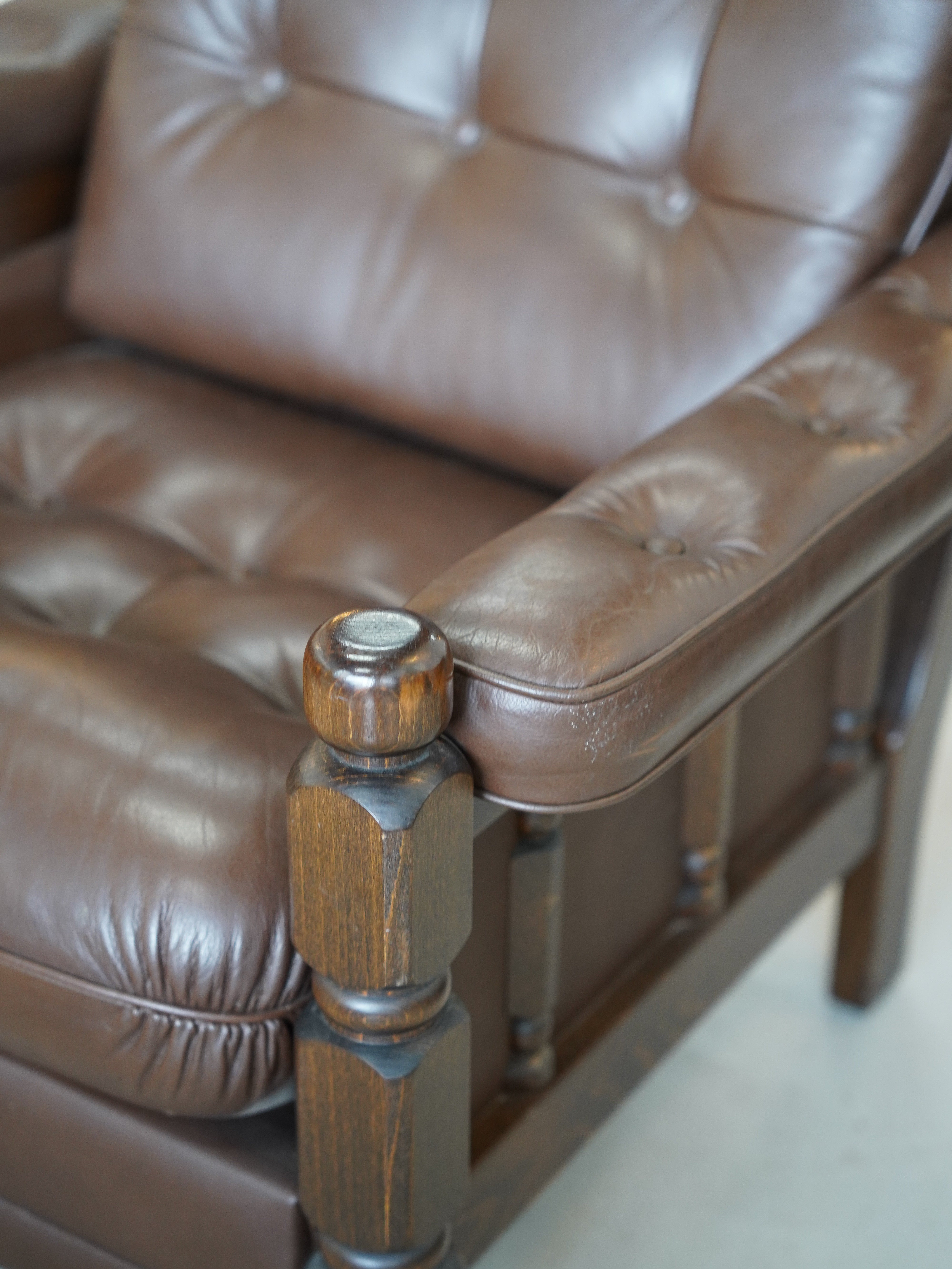 がっしりとした木製フレームに、深みのあるブラウンレザーのクッションを合わせたヴィンテージアームチェアです。