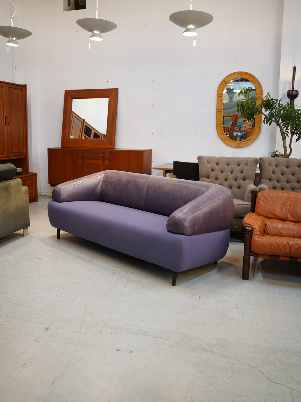 イタリアンモダンを思わせる、アートのような佇まいは、リビングの主役として、または店舗の待合スペースを華やかに彩るアクセントに最適です。デザイン性の高い、特別な一点物のモダンソファです。
