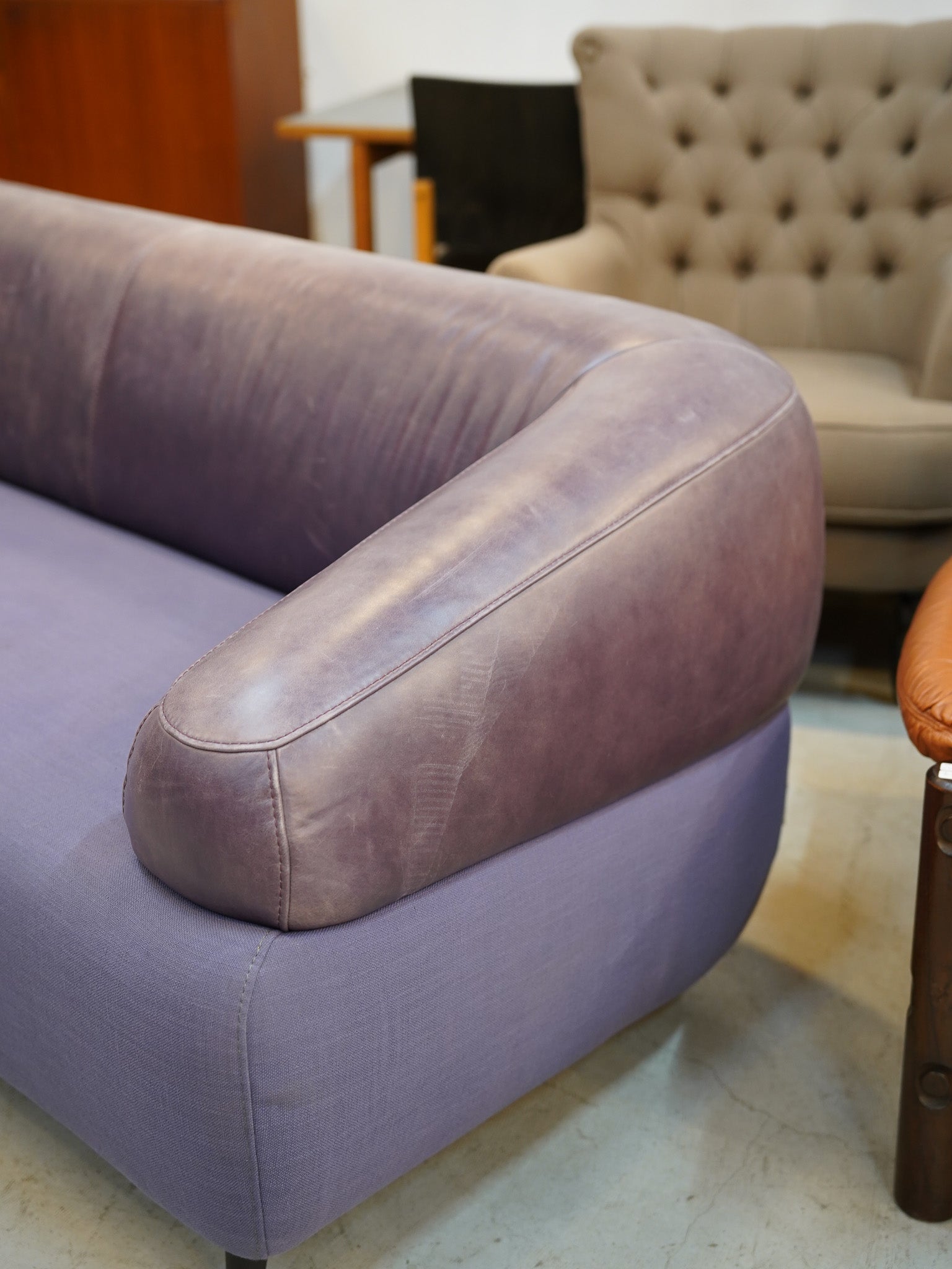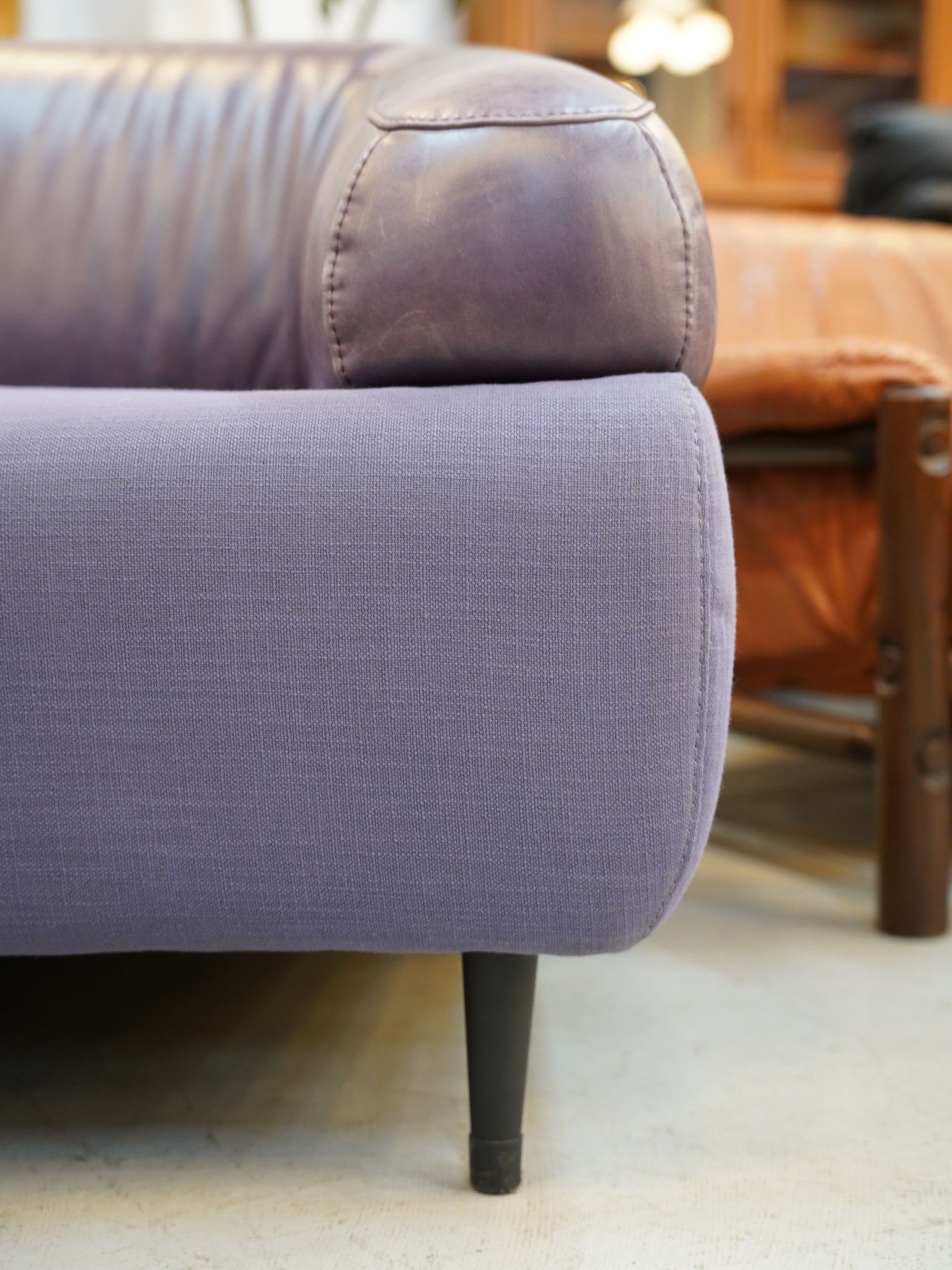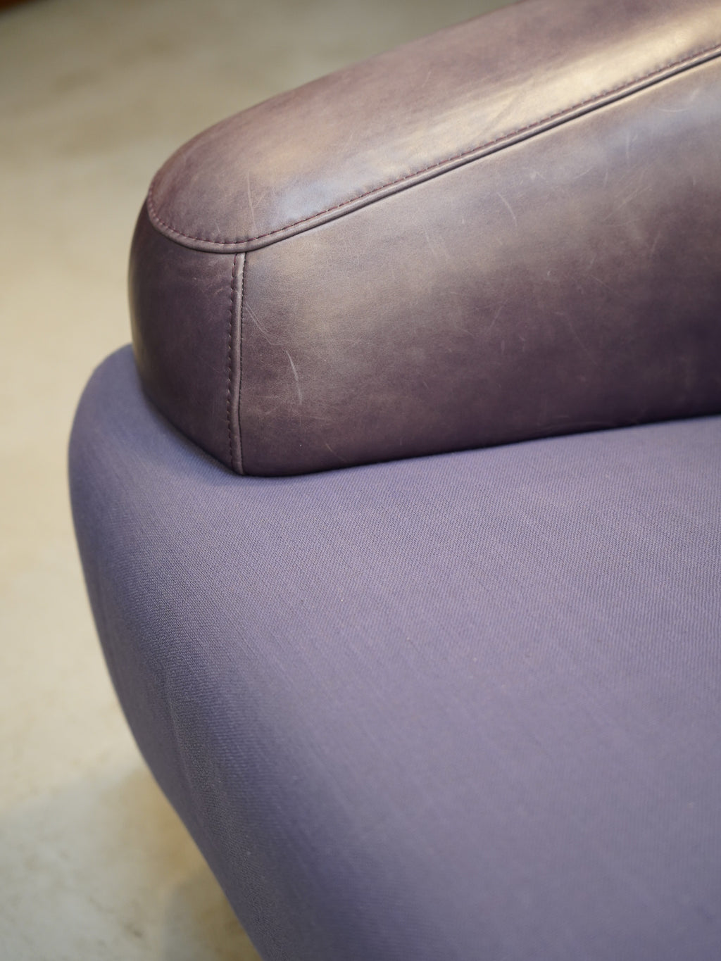 張地は、座面の鮮やかなパープルのファブリックと、背もたれからアームにかけてのレザーによる異素材ミックスのデザインです。