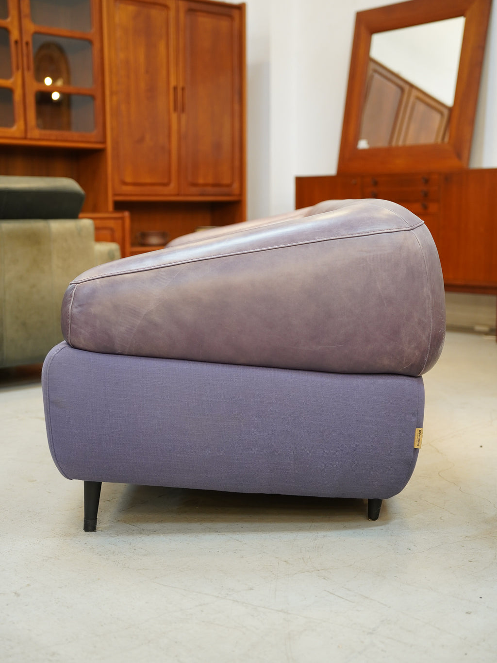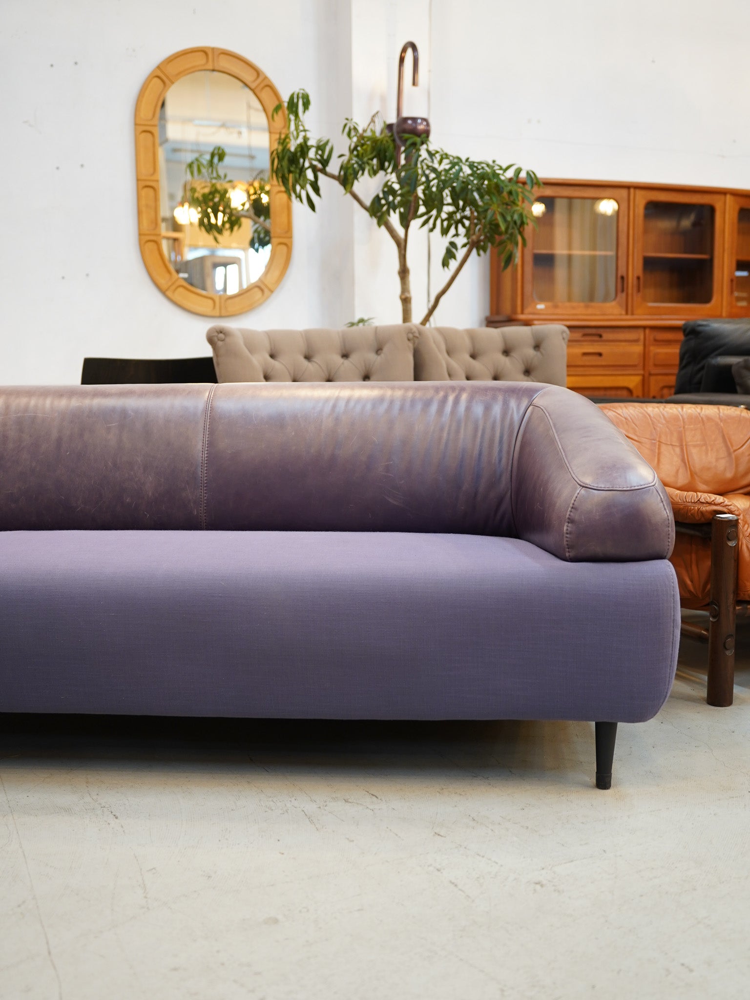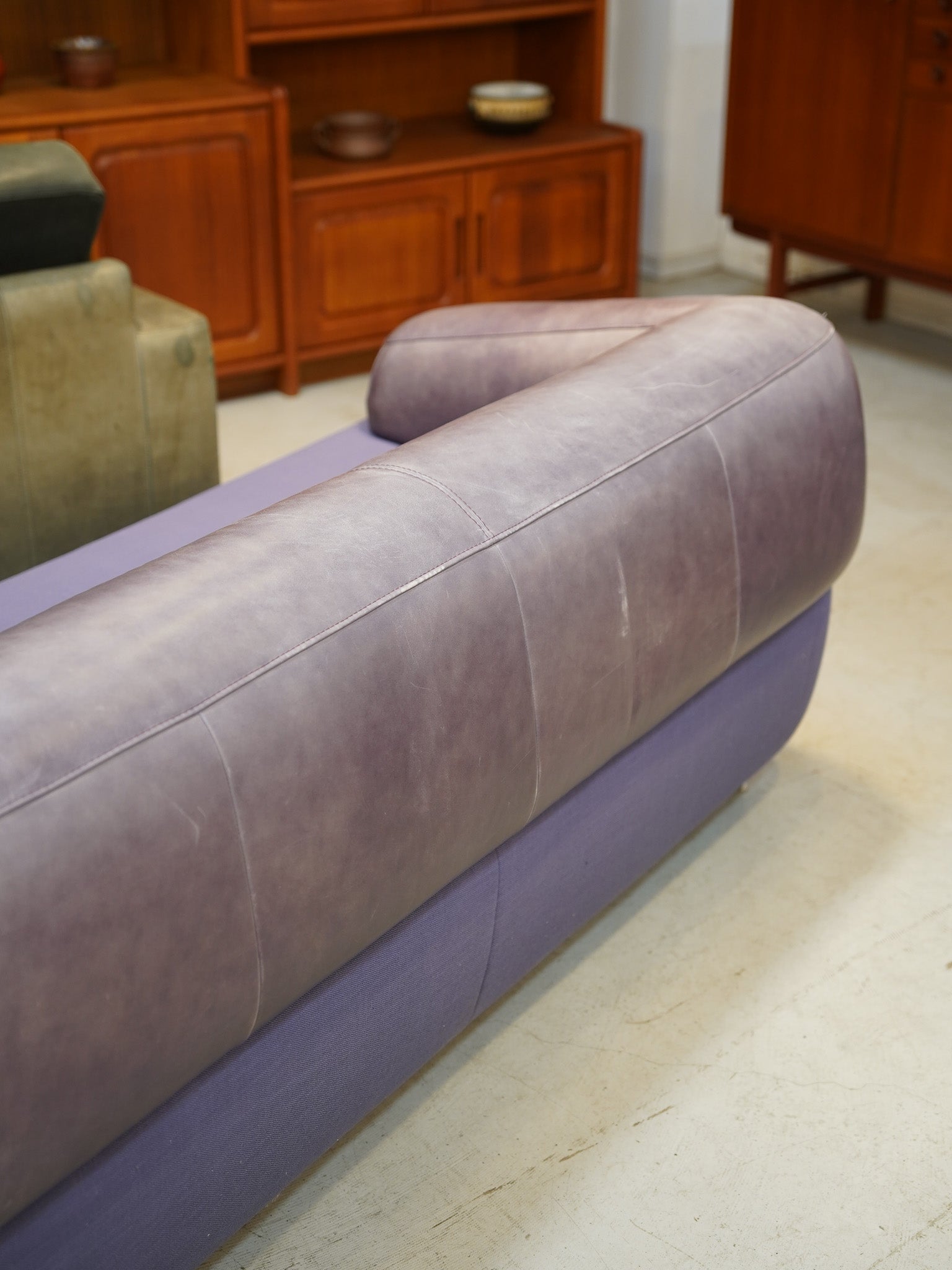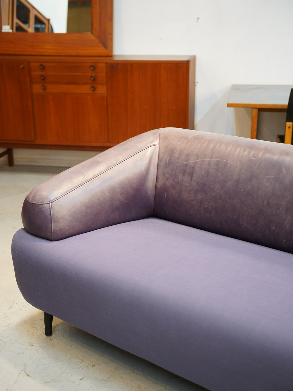 張地は、座面の鮮やかなパープルのファブリックと、背もたれからアームにかけてのレザーによる異素材ミックスのデザインです。