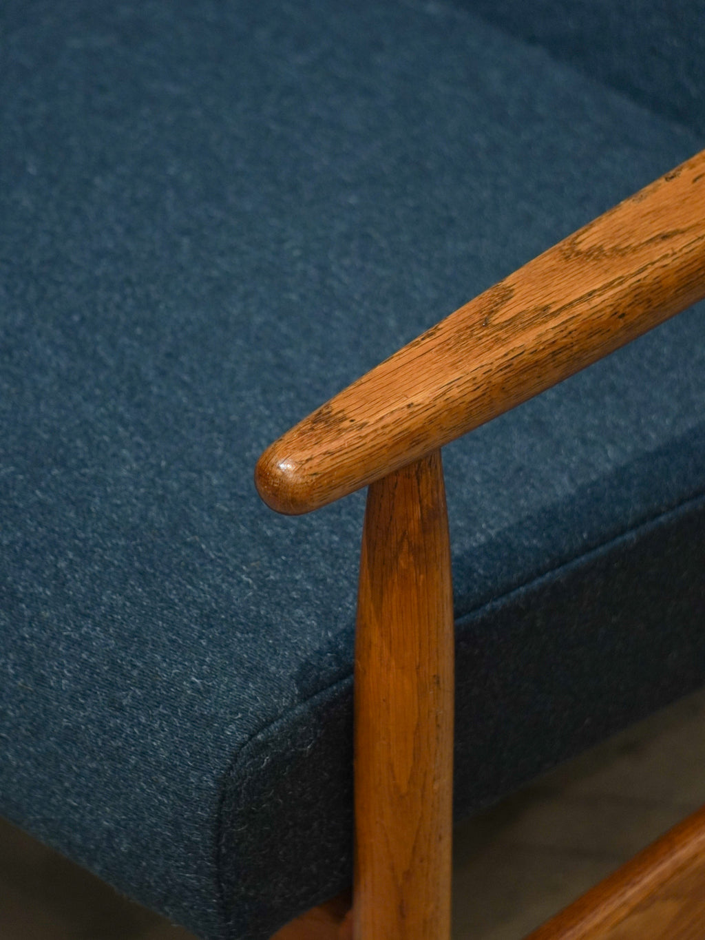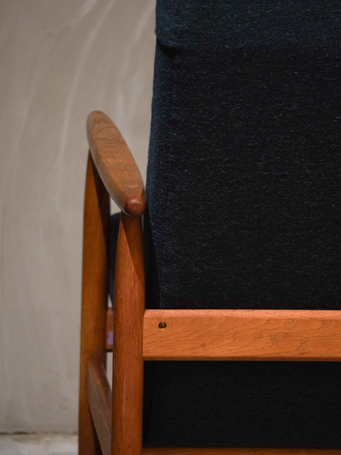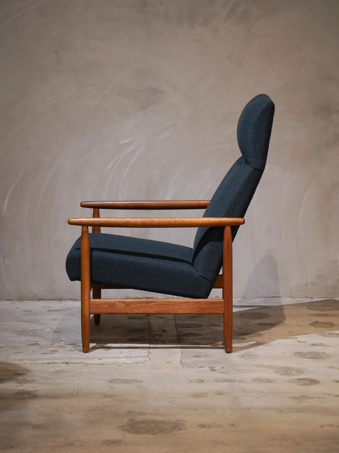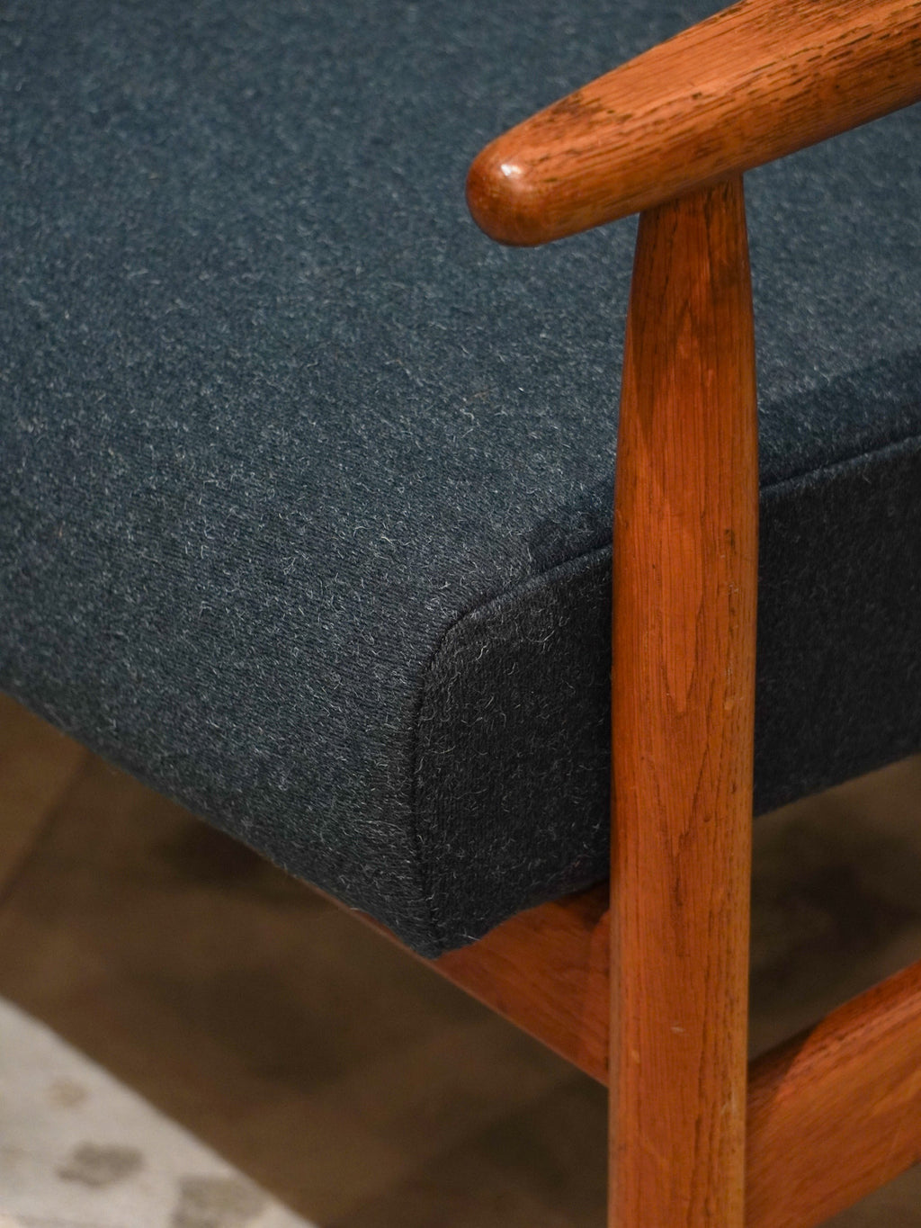 温かみのあるオーク材のフレームと、深みのあるグリーンのファブリックが見事に調和した、北欧ヴィンテージらしい逸品です。