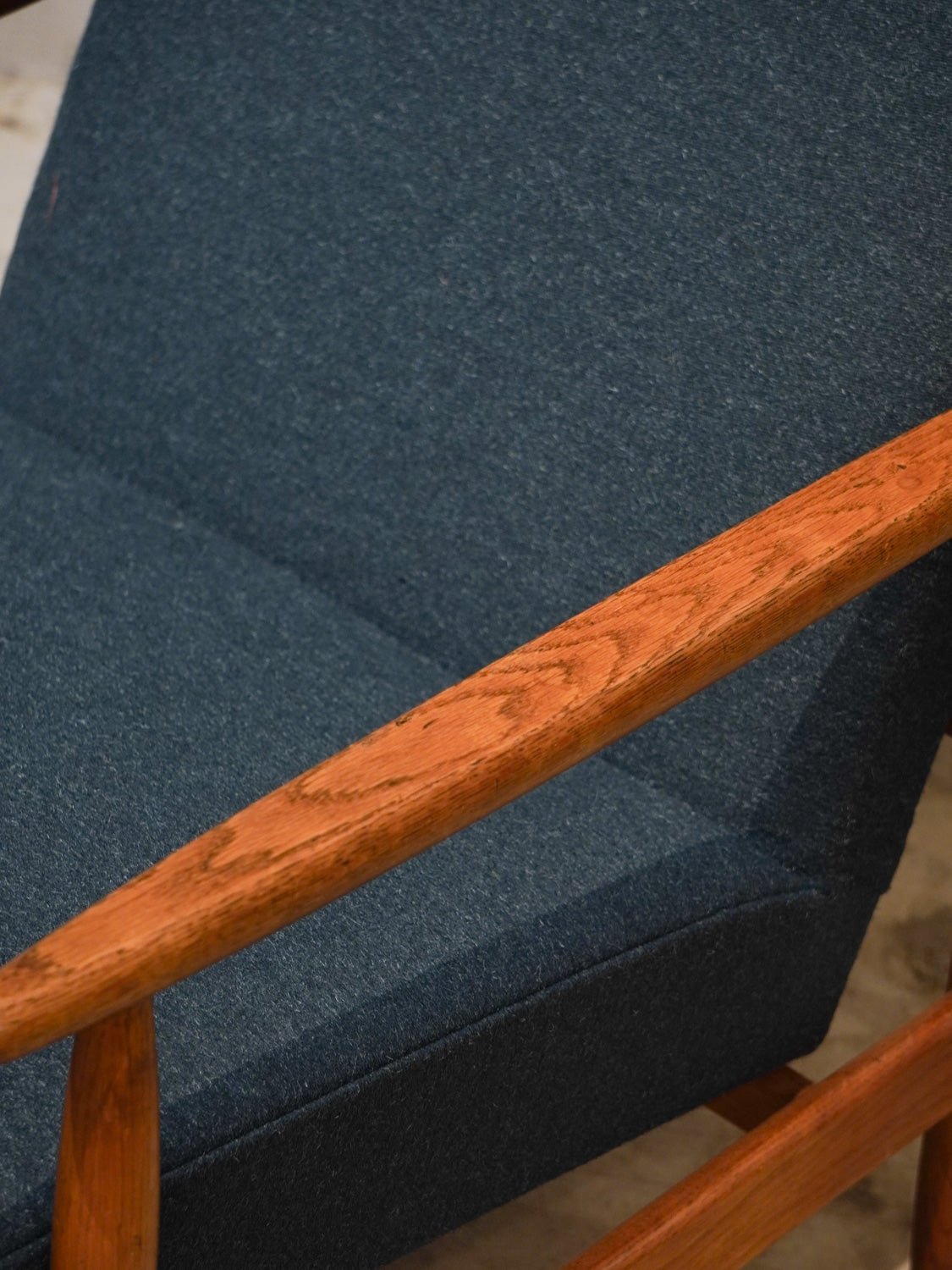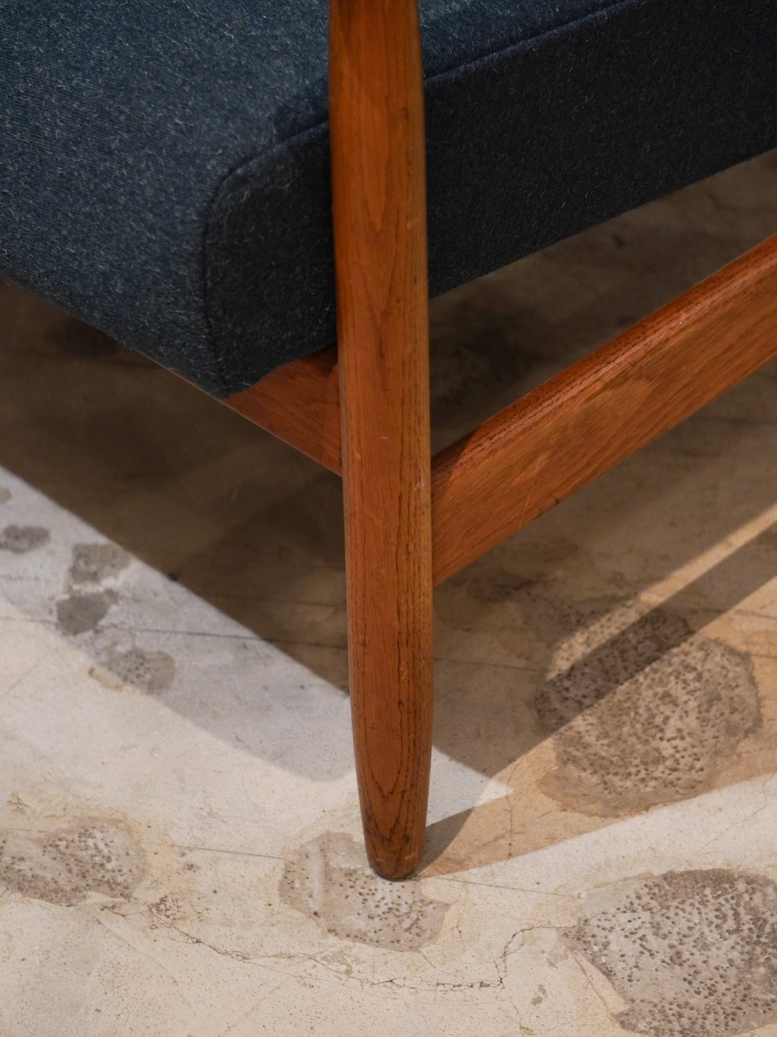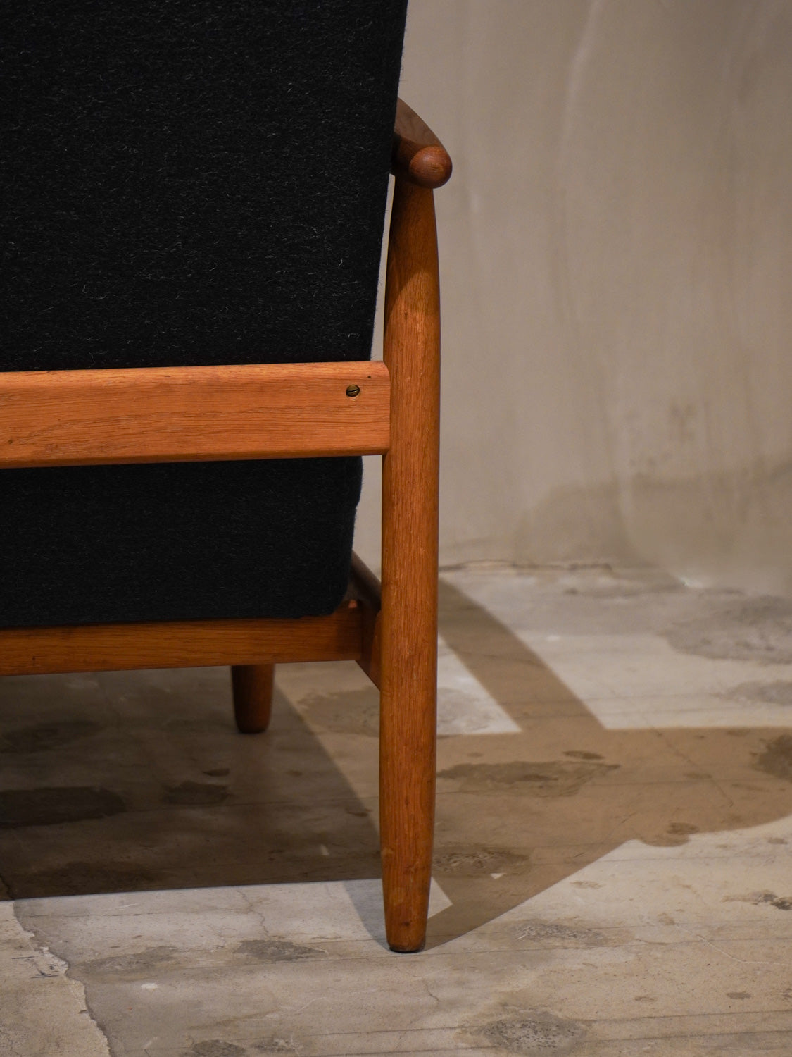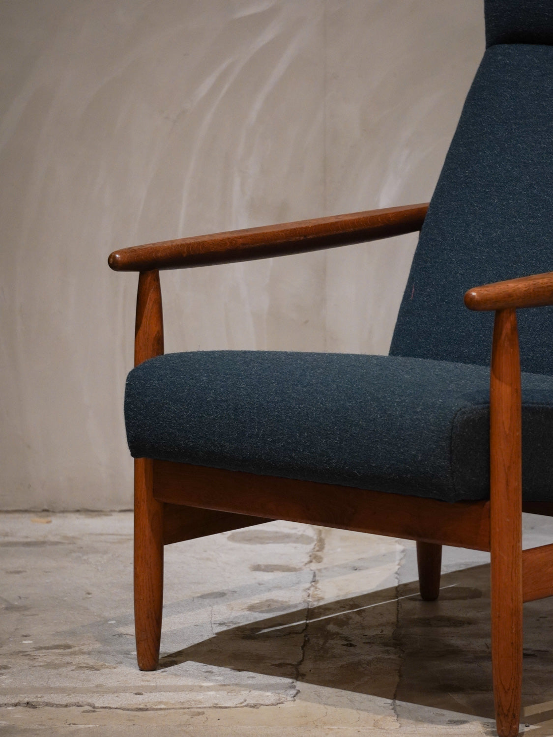 温かみのあるオーク材のフレームと、深みのあるグリーンのファブリックが見事に調和した、北欧ヴィンテージらしい逸品です。