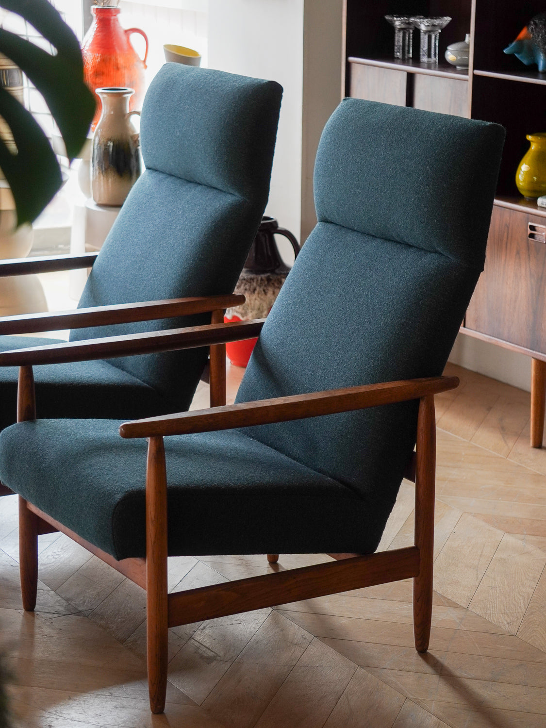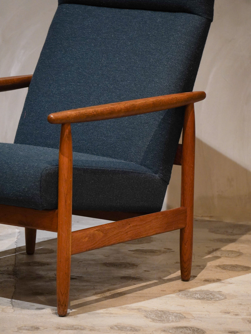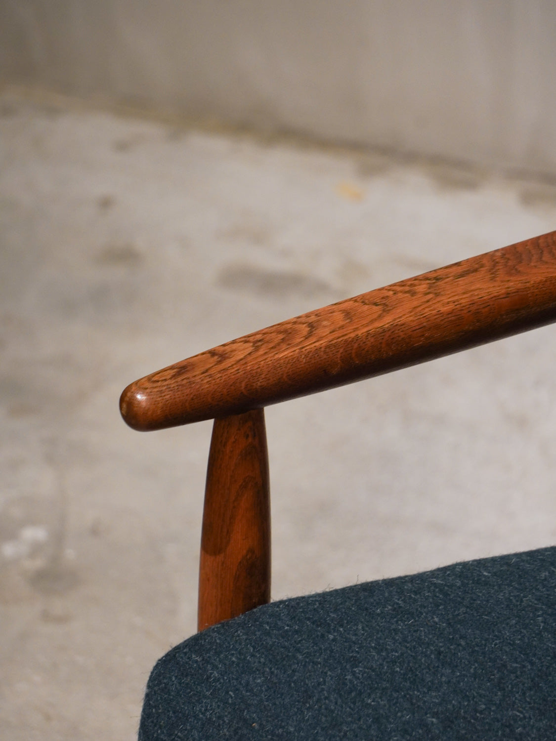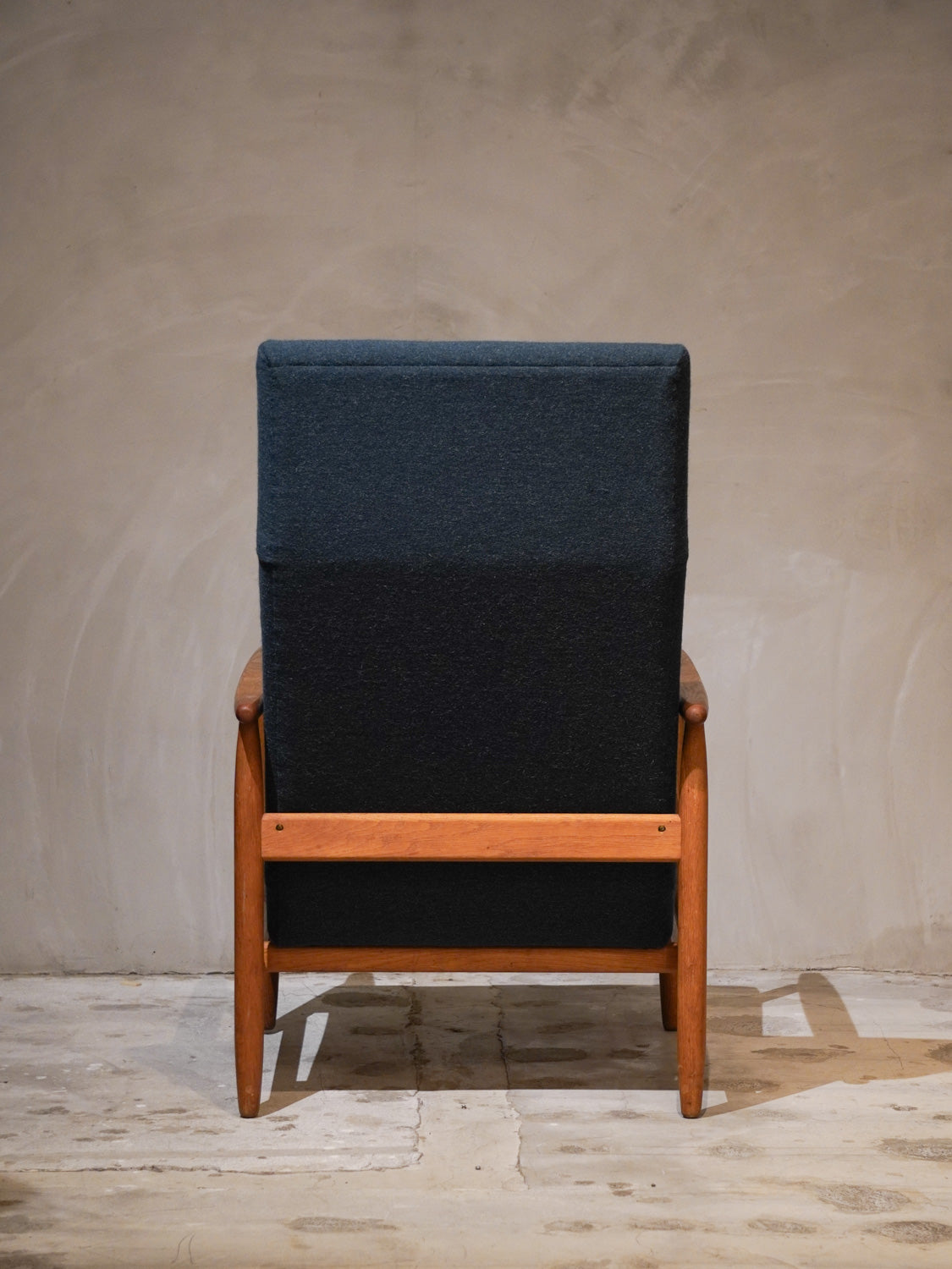 温かみのあるオーク材のフレームと、深みのあるグリーンのファブリックが見事に調和した、北欧ヴィンテージらしい逸品です。