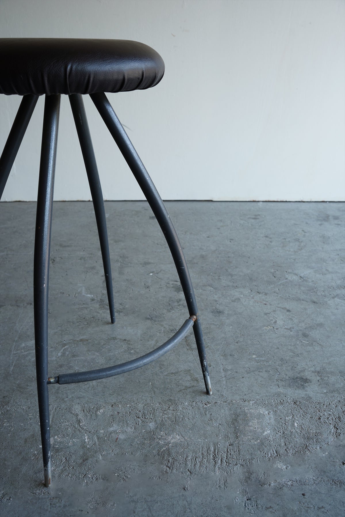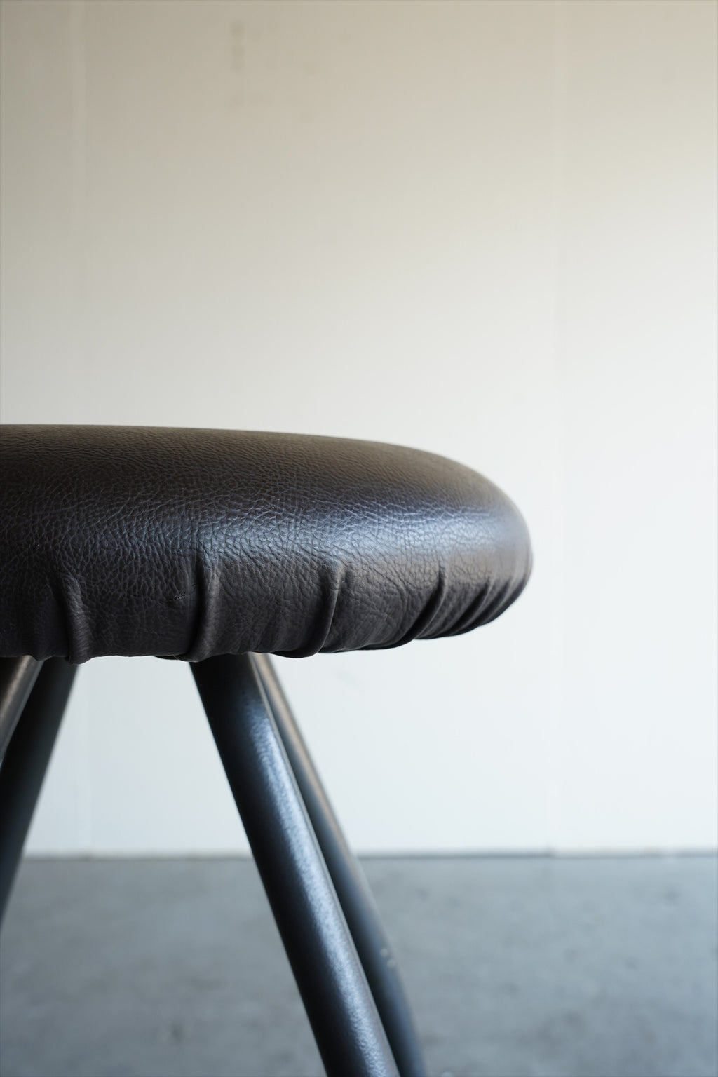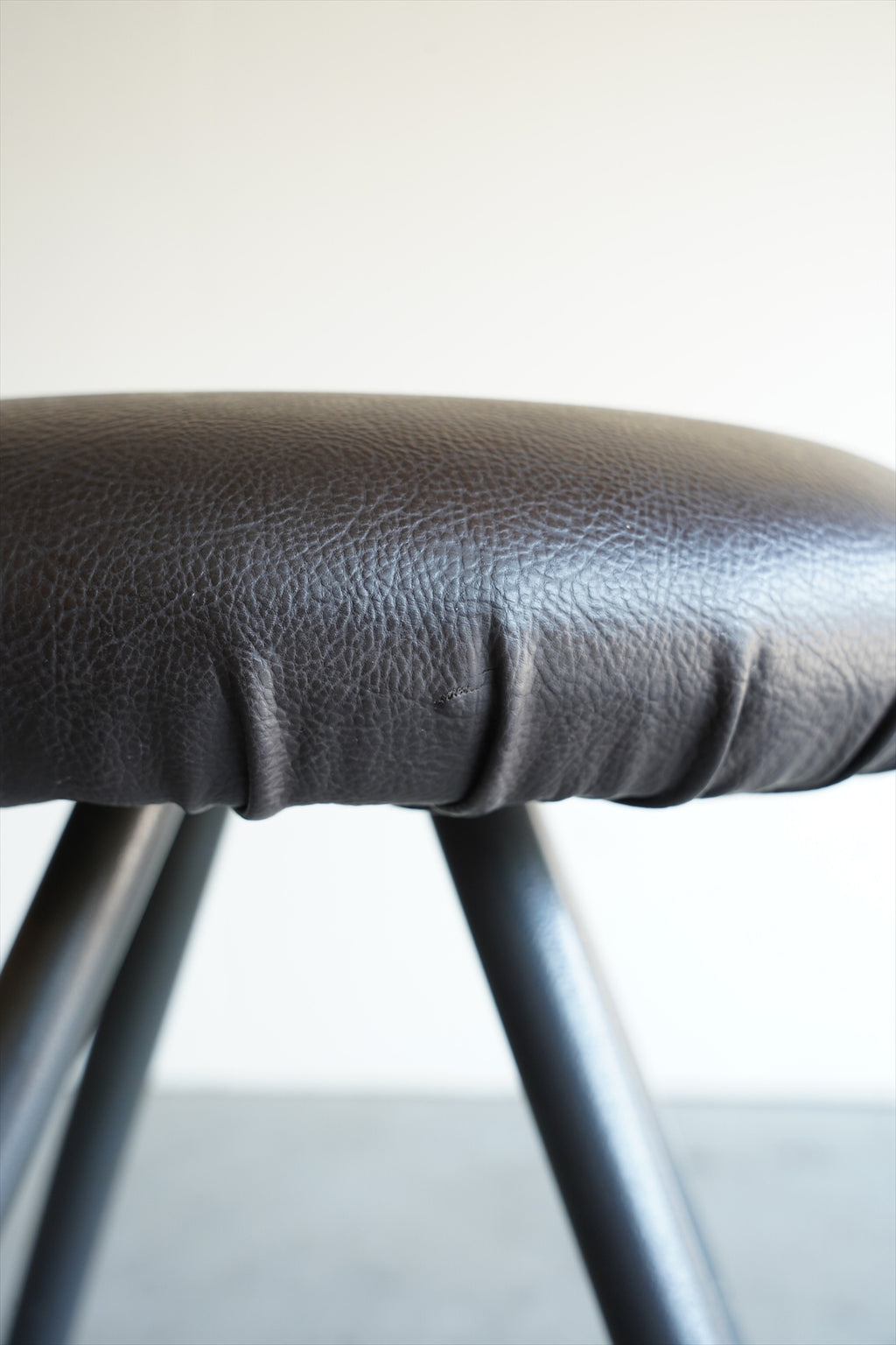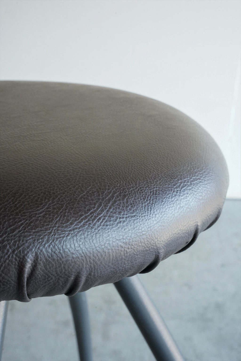座面にはクッション性のあるブラックレザーが張られており、硬質なスチールのフレームとのコントラストが、デザインの完成度を一層高めています。素材の持つ質感が際立つこのスツールは、カウンターやバーテーブルに合わせるだけでなく、リビングや書斎で、オブジェのように飾っても絵になる一脚です。