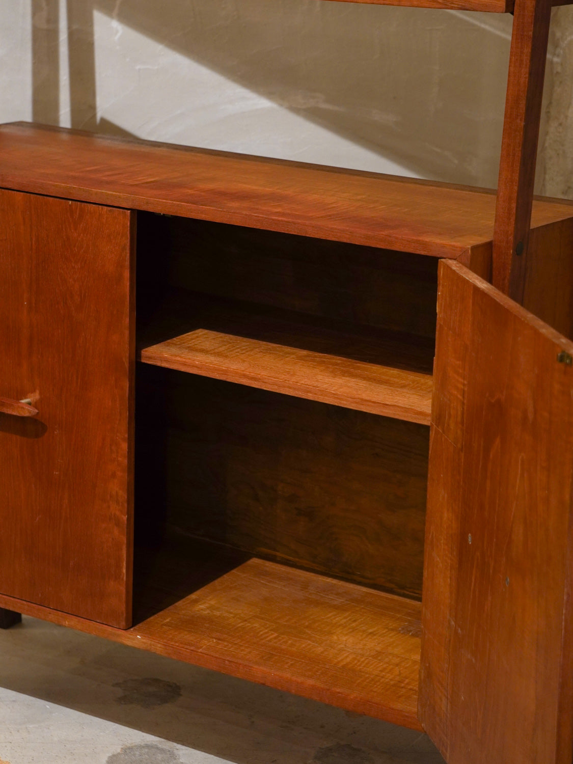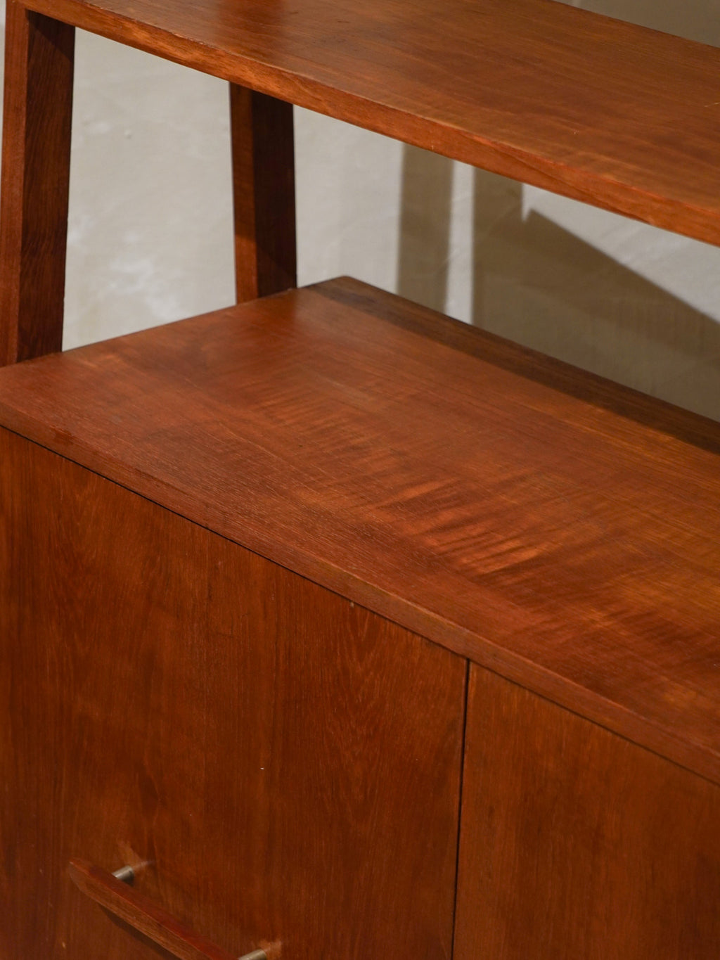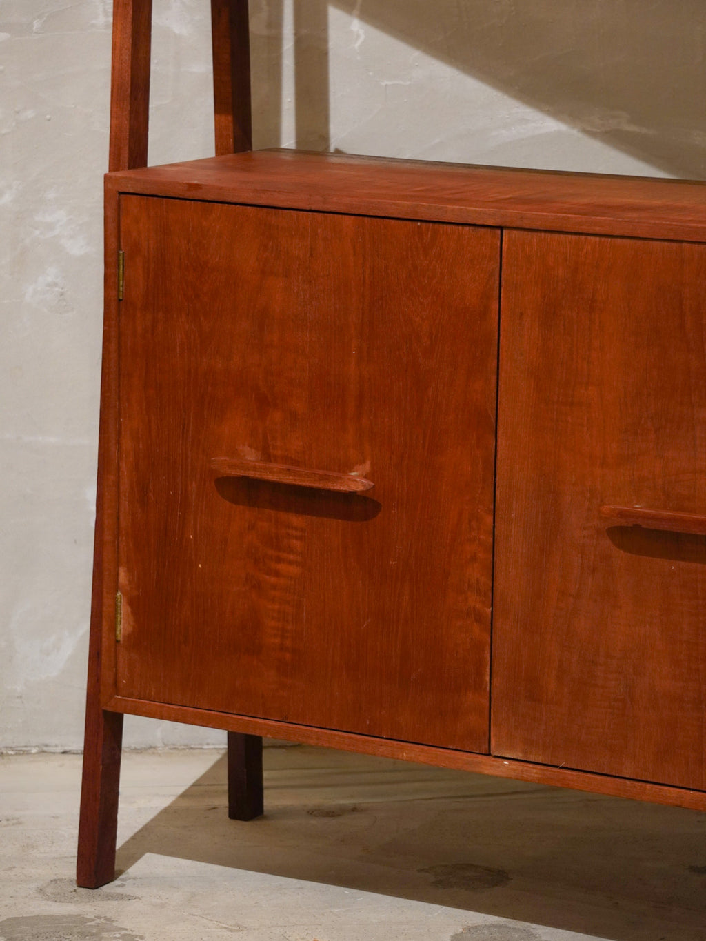 下部は扉付きのキャビネット、上部はオープンシェルフという構成。