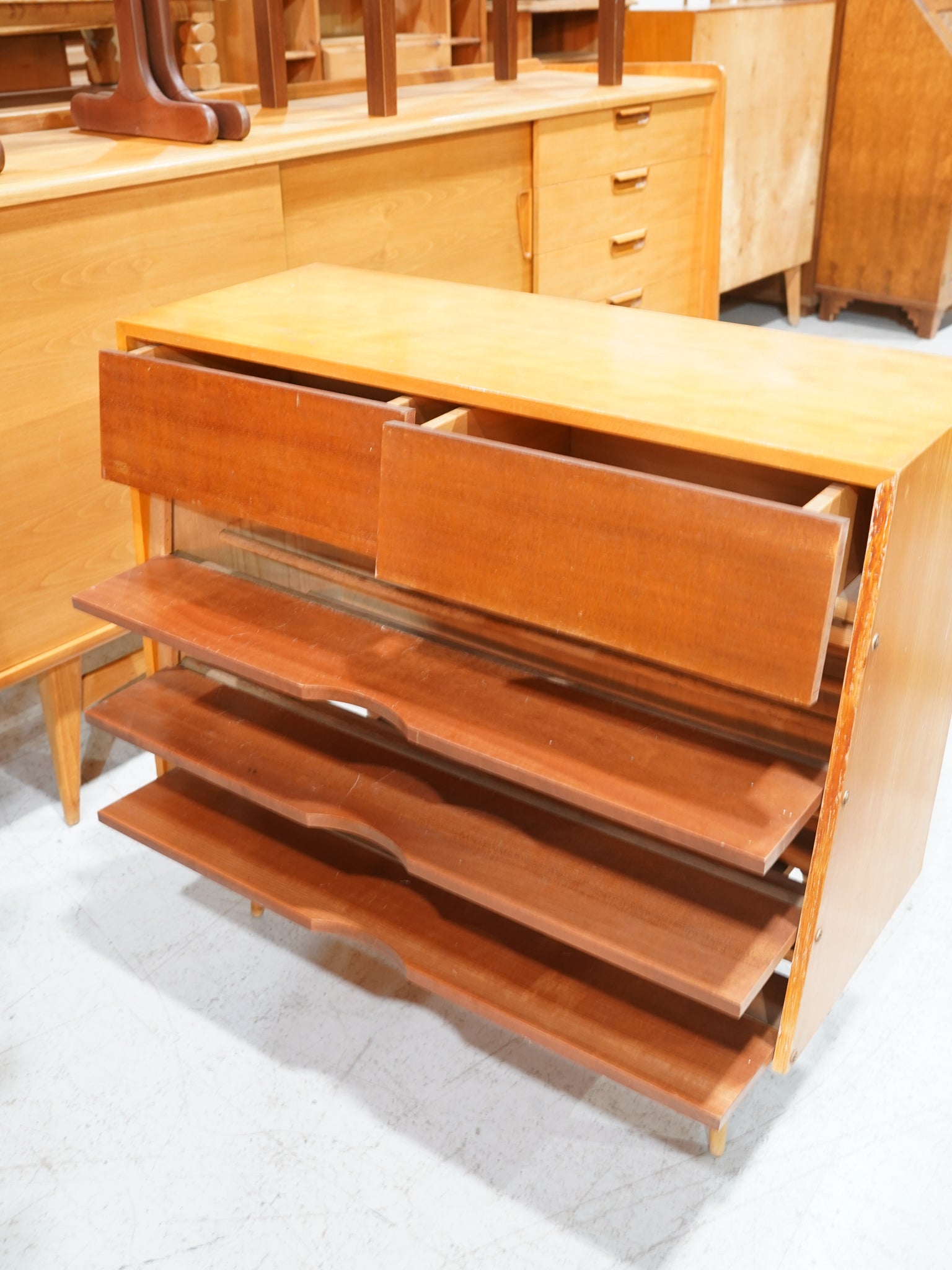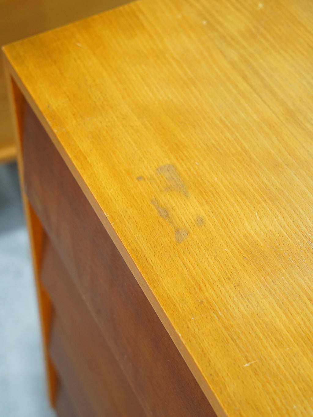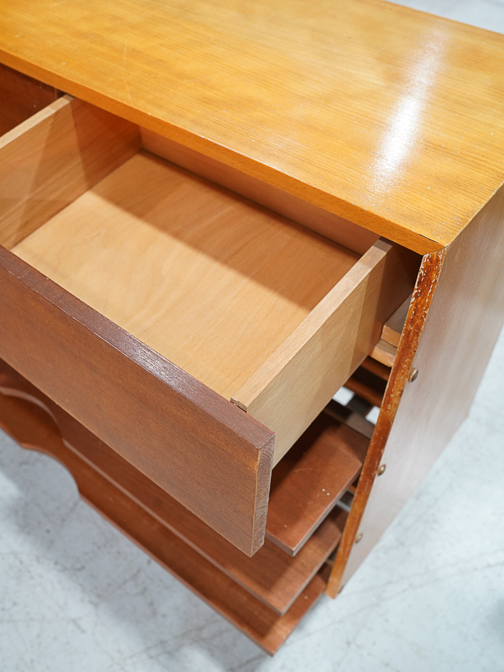 引き出しの前面に角度をつけることで、陰影が生まれ、平坦になりがちな家具に奥行きと表情を与えています。