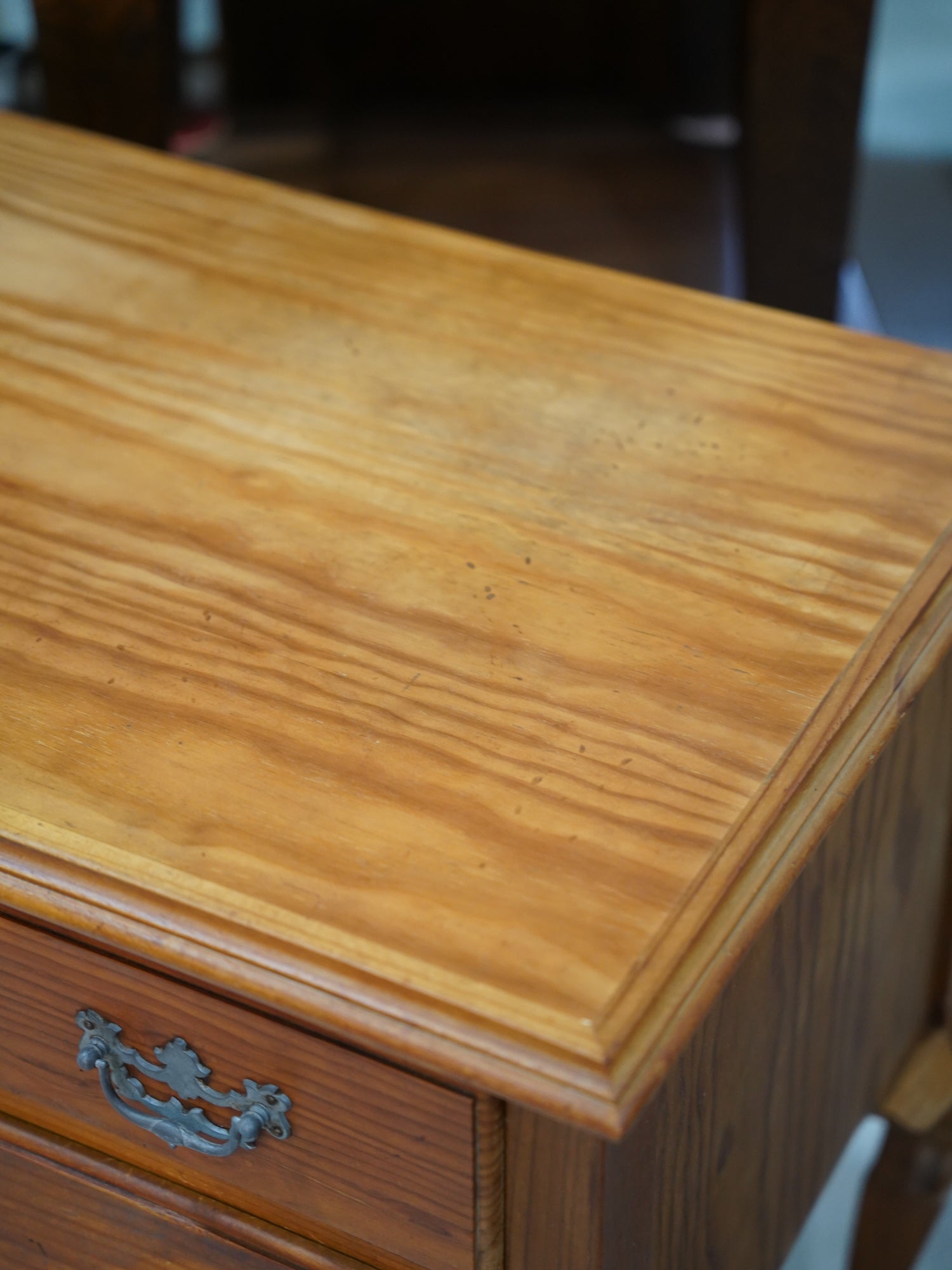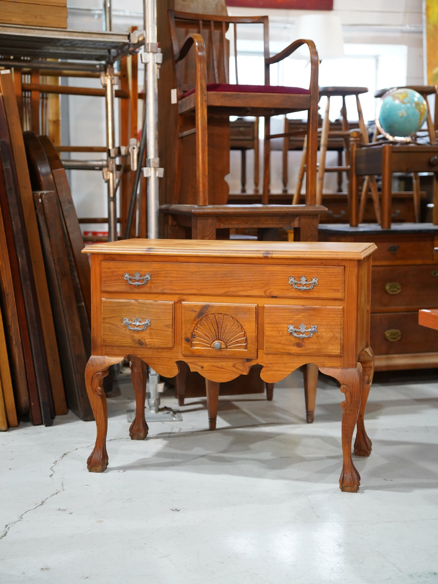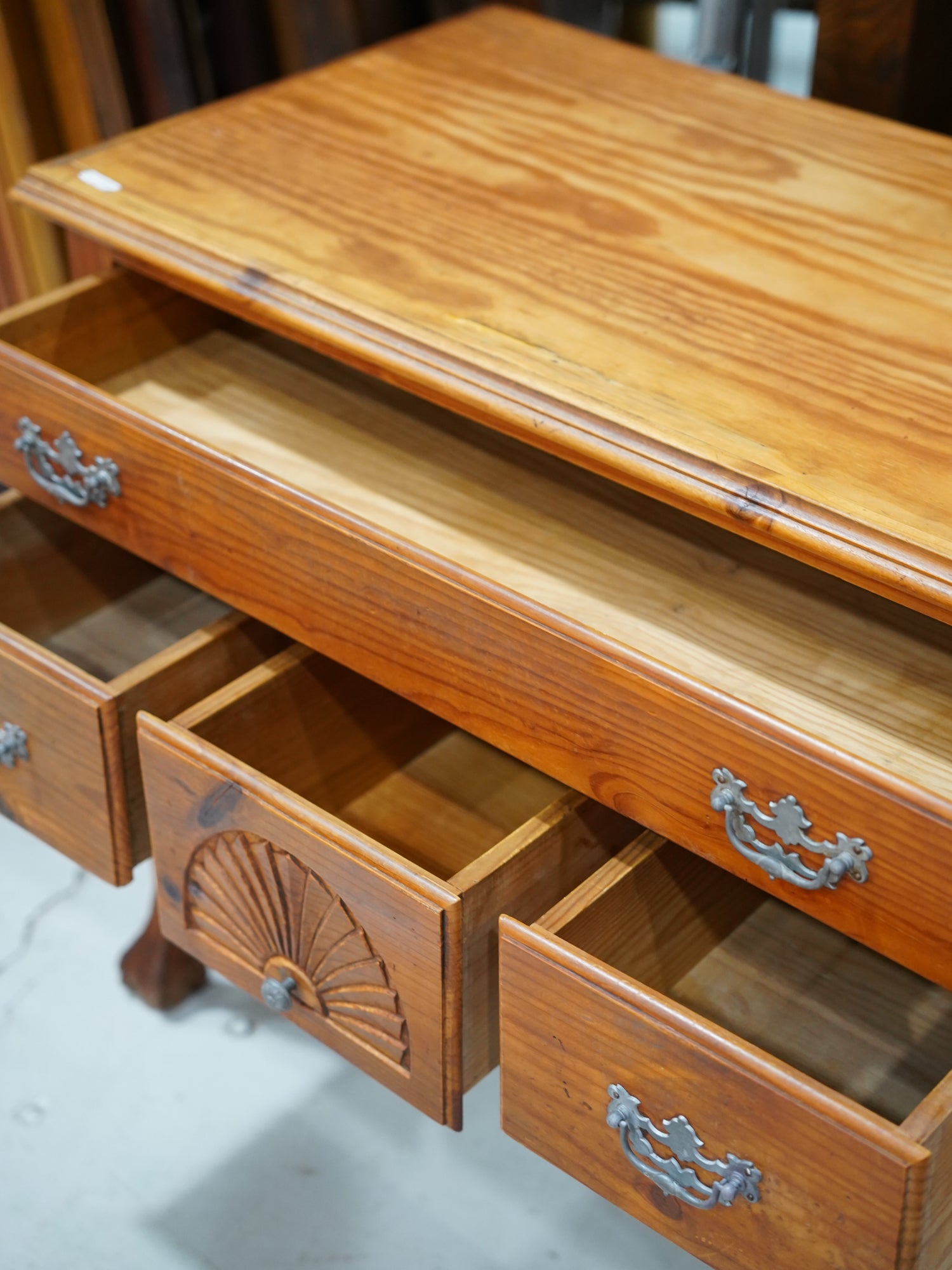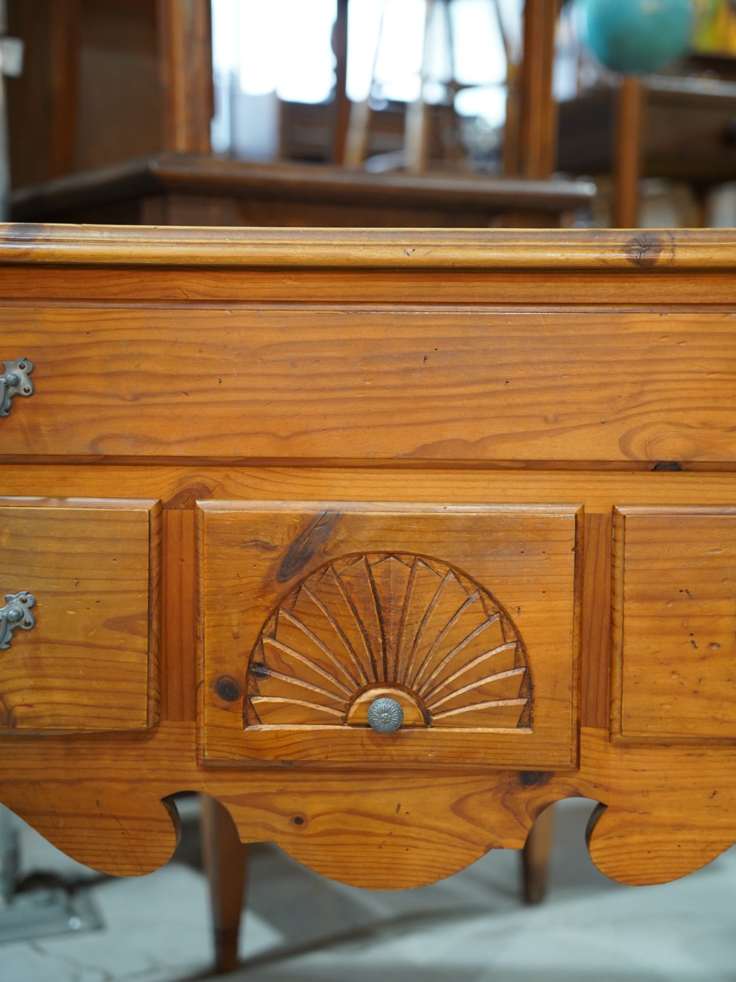 温かみのある明るい木の色調は、カントリー家具特有のラスティックな親しみやすさを保ちつつ、金具と中央の扇状の彫刻が、優雅なリズムを生み出しています。