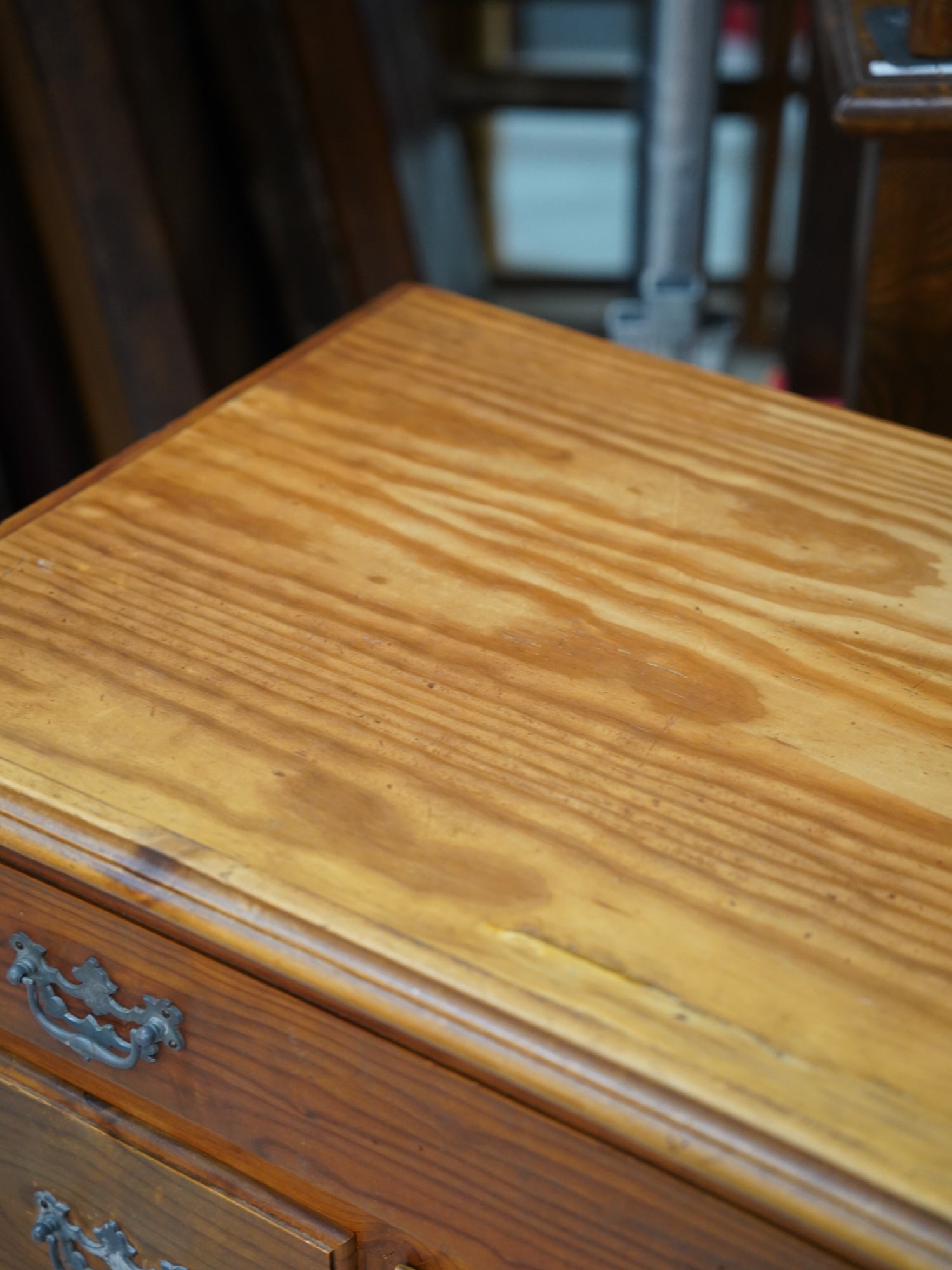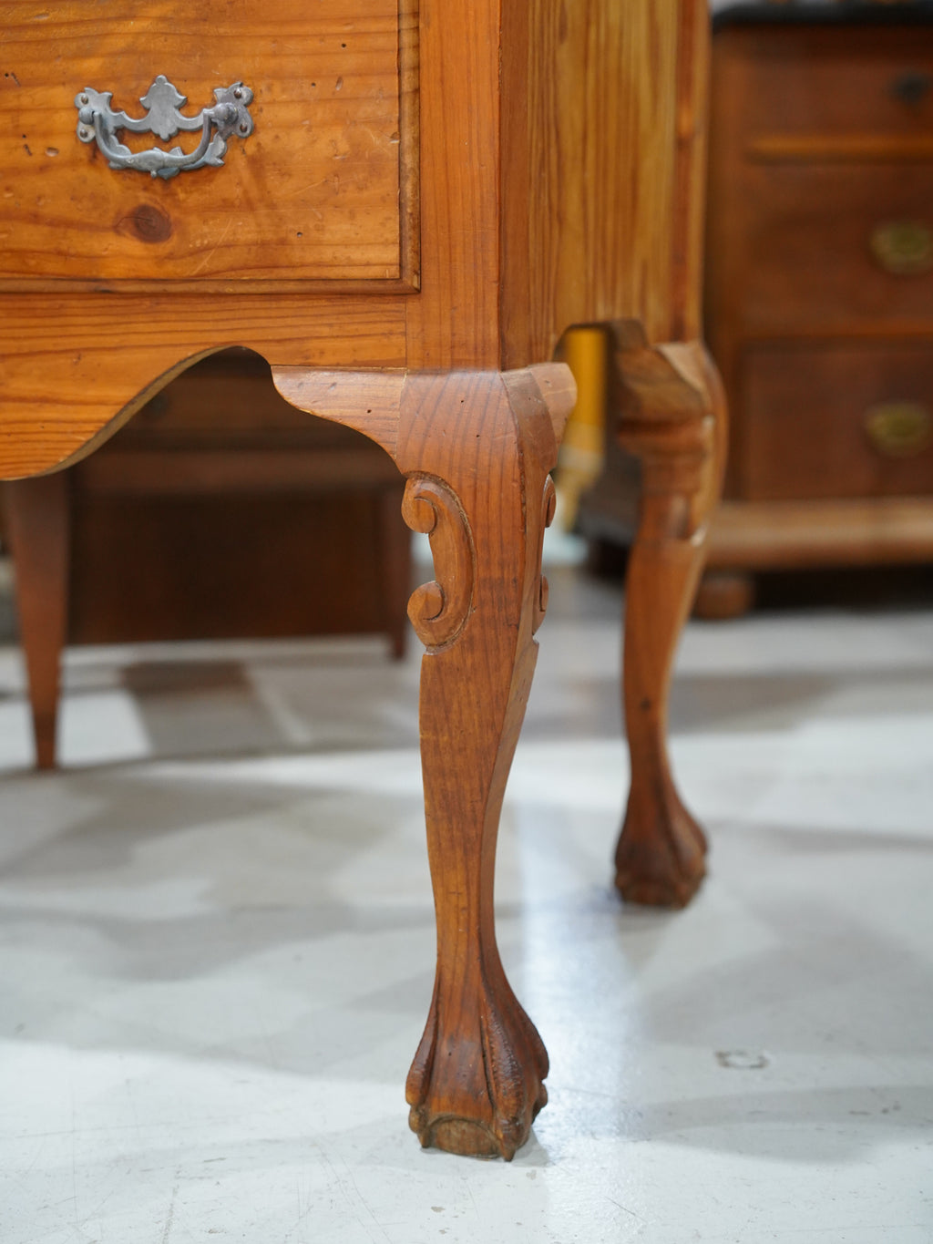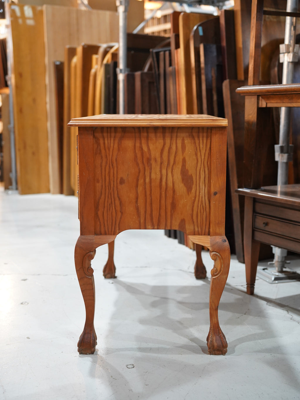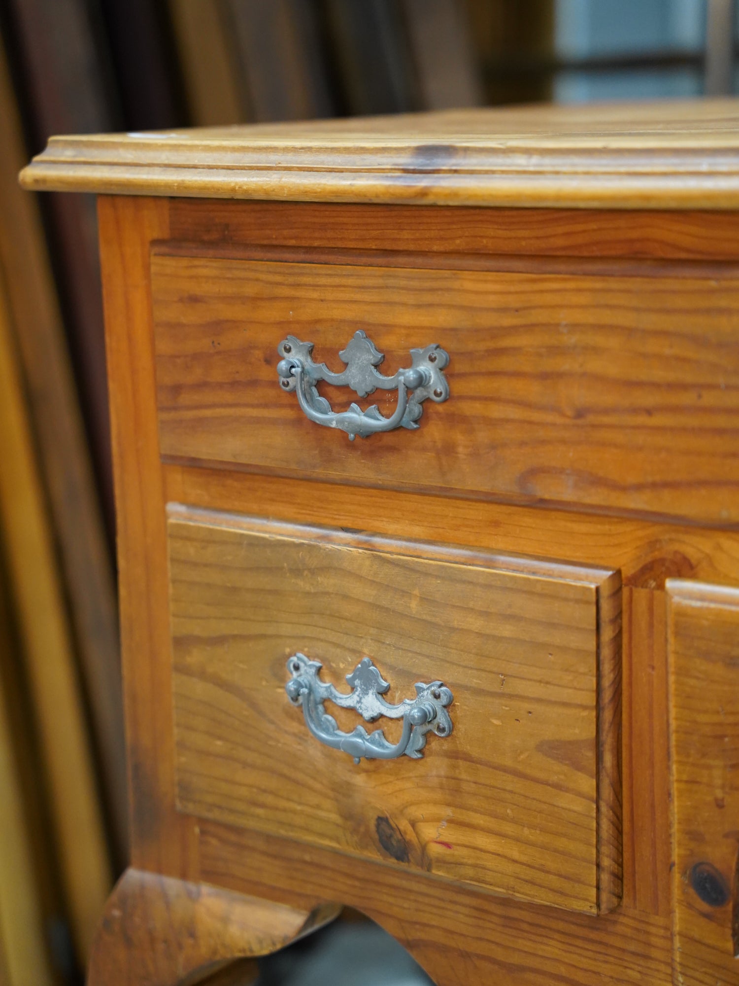 温かみのある明るい木の色調は、カントリー家具特有のラスティックな親しみやすさを保ちつつ、金具と中央の扇状の彫刻が、優雅なリズムを生み出しています。