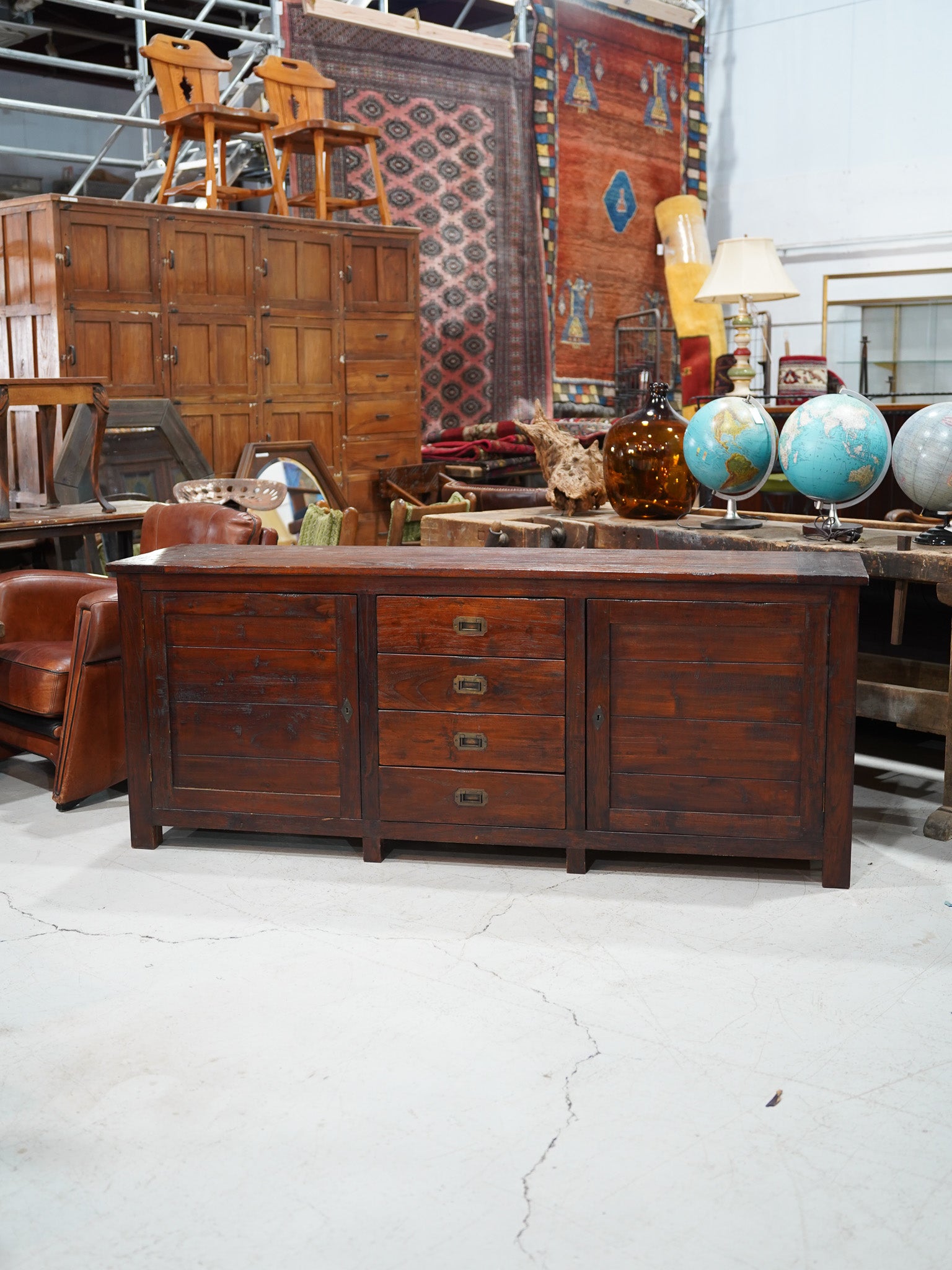 【ラスティックヴィンテージ】重厚な木肌と真鍮のハンドルがクラシックなロングサイドボード