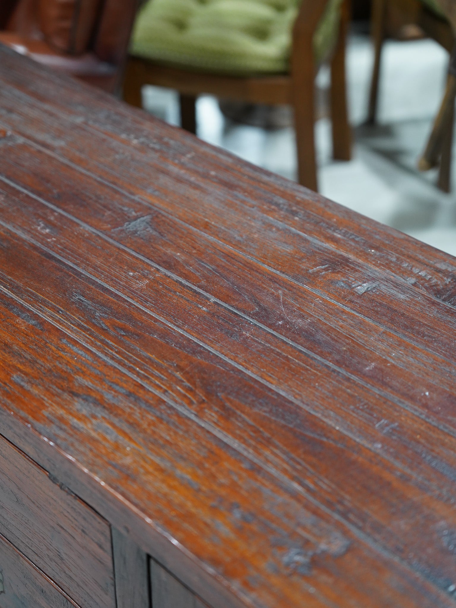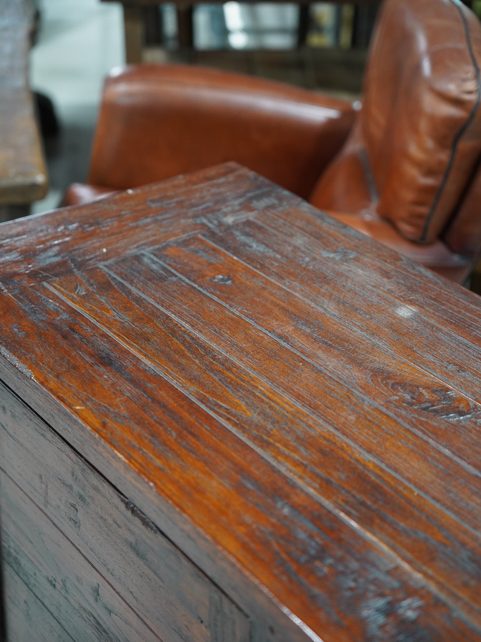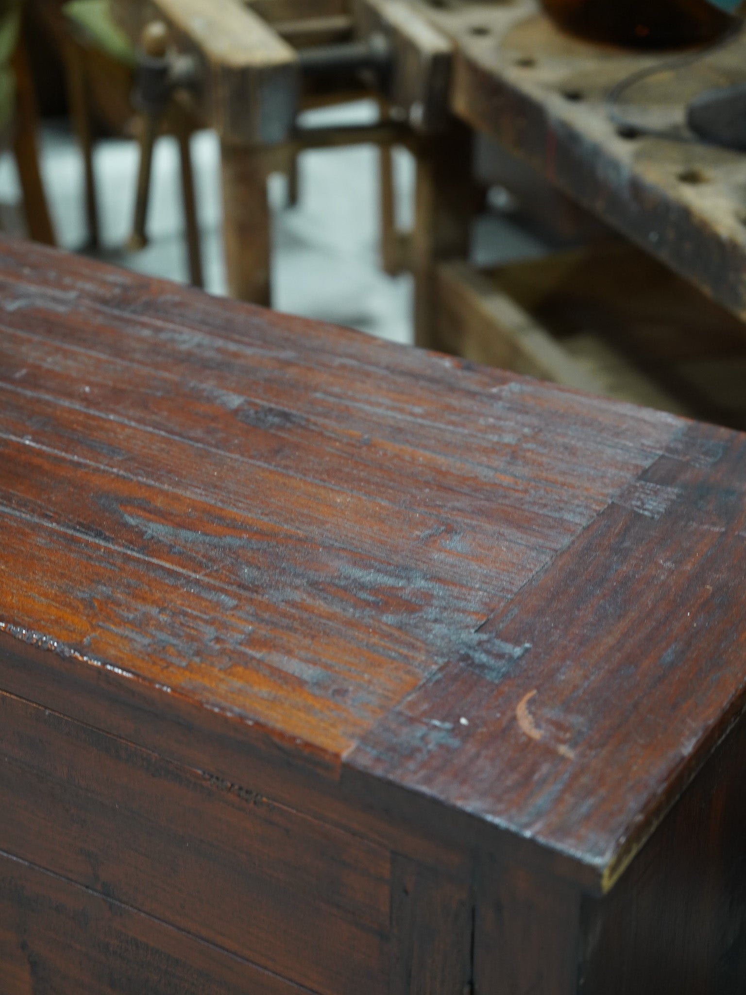 長年の使用によって深みを増した木部の風合いは、ラスティックで力強い存在感を放ちます。