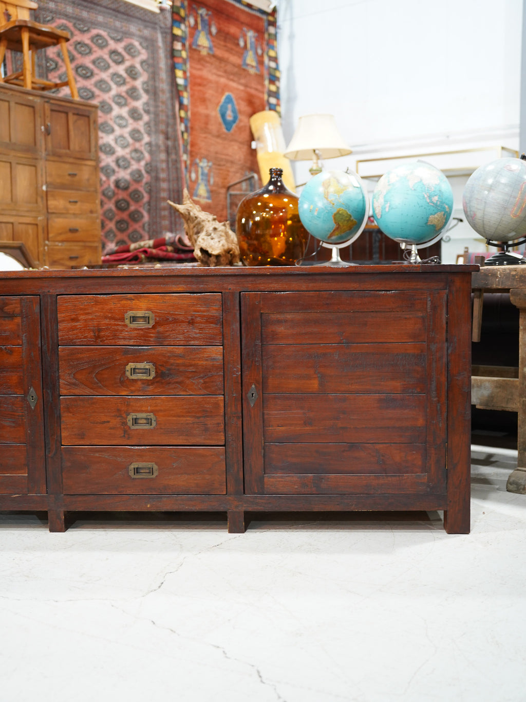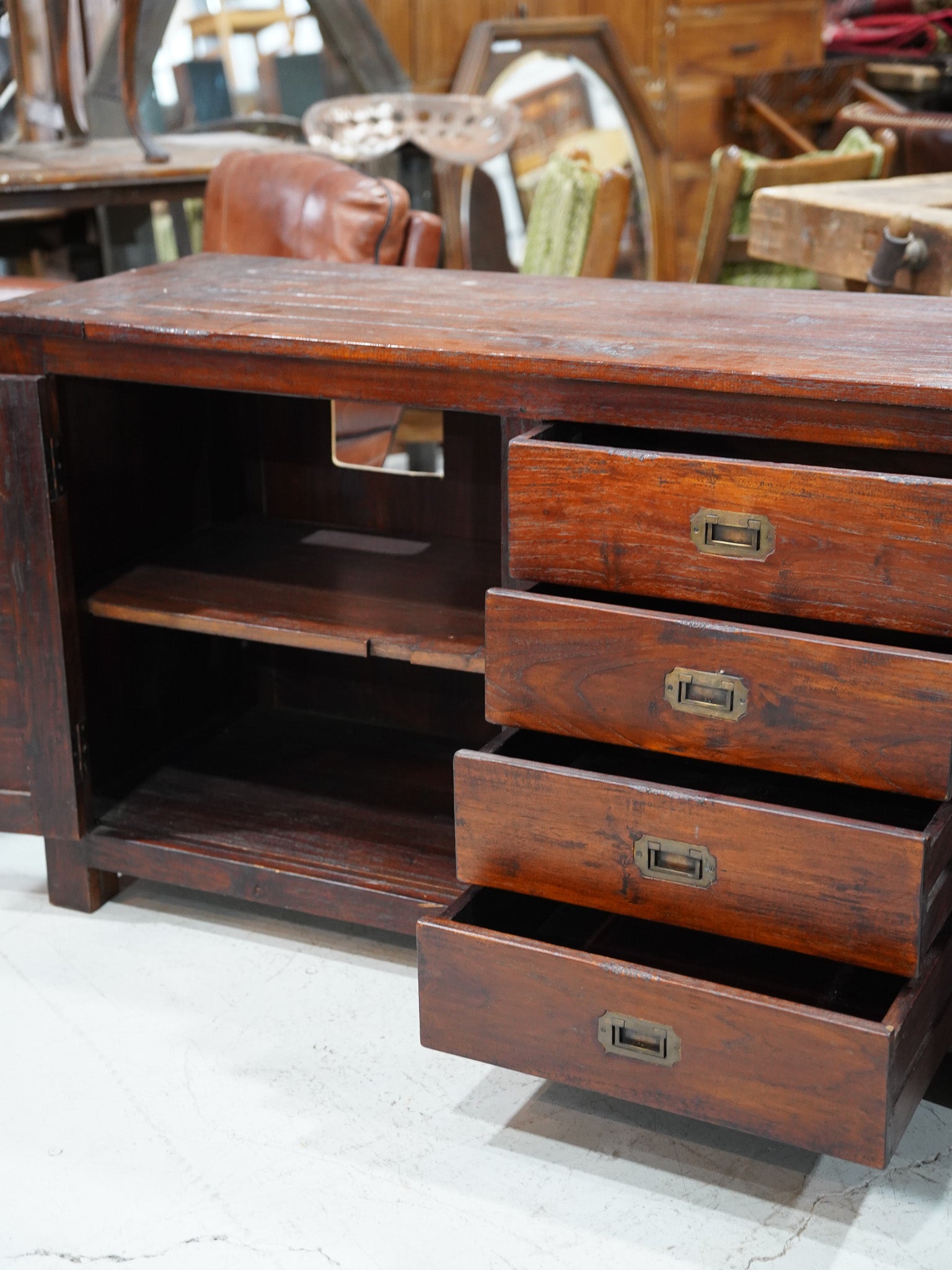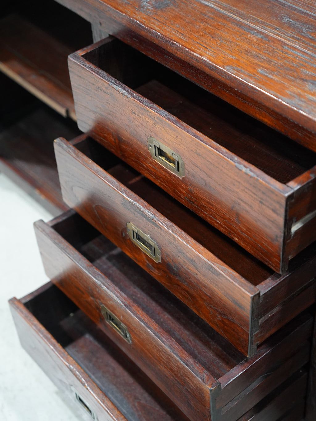 濃く重厚な木肌と、クラシックな金具のディテールが魅力のヴィンテージサイドボード。