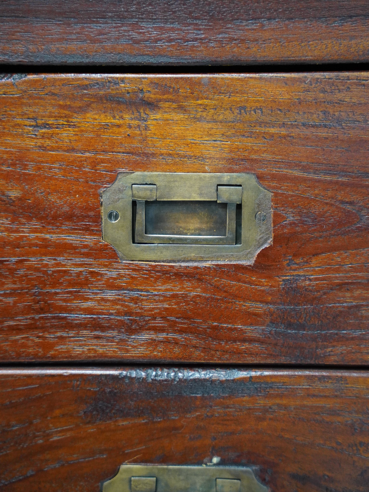 引き出しに付いたプレート状の真鍮製の金具が、重厚な雰囲気にシャープなアクセントを加えています。