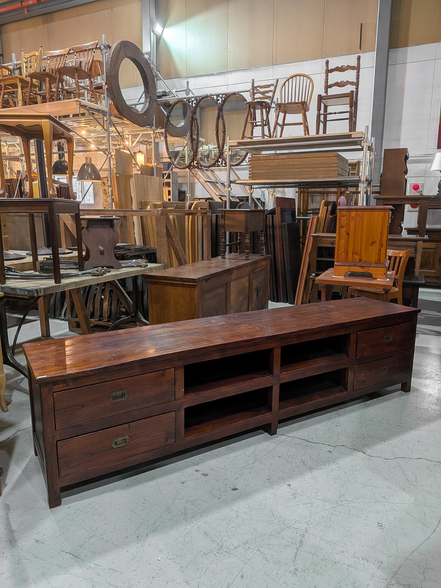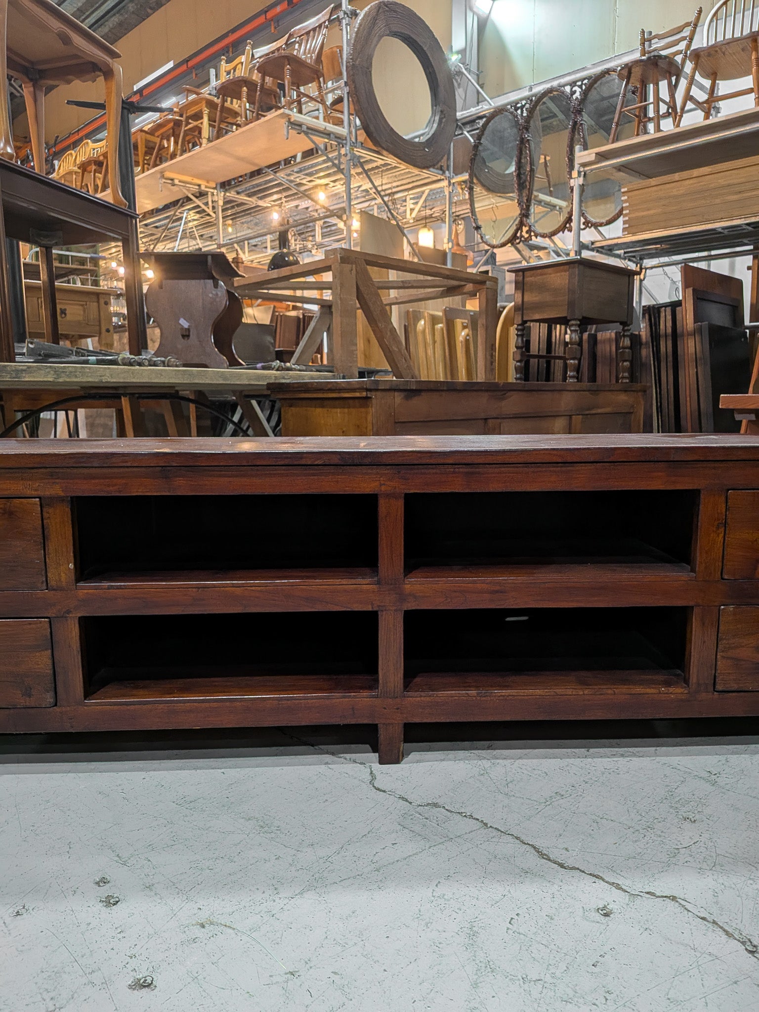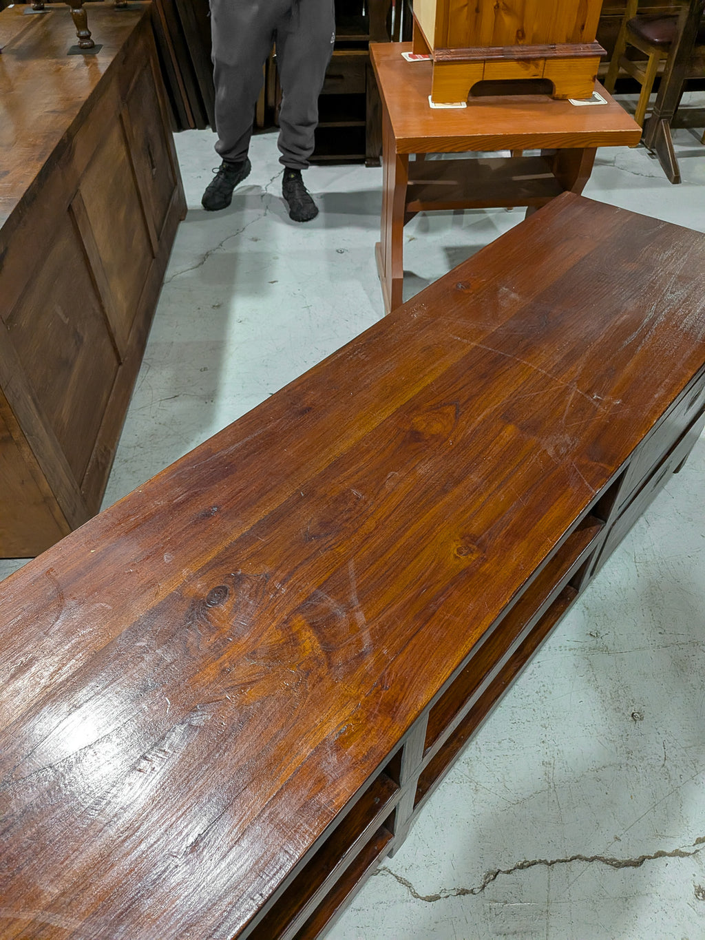 横幅があり、重厚な木肌の風合いが魅力のヴィンテージローボードです。