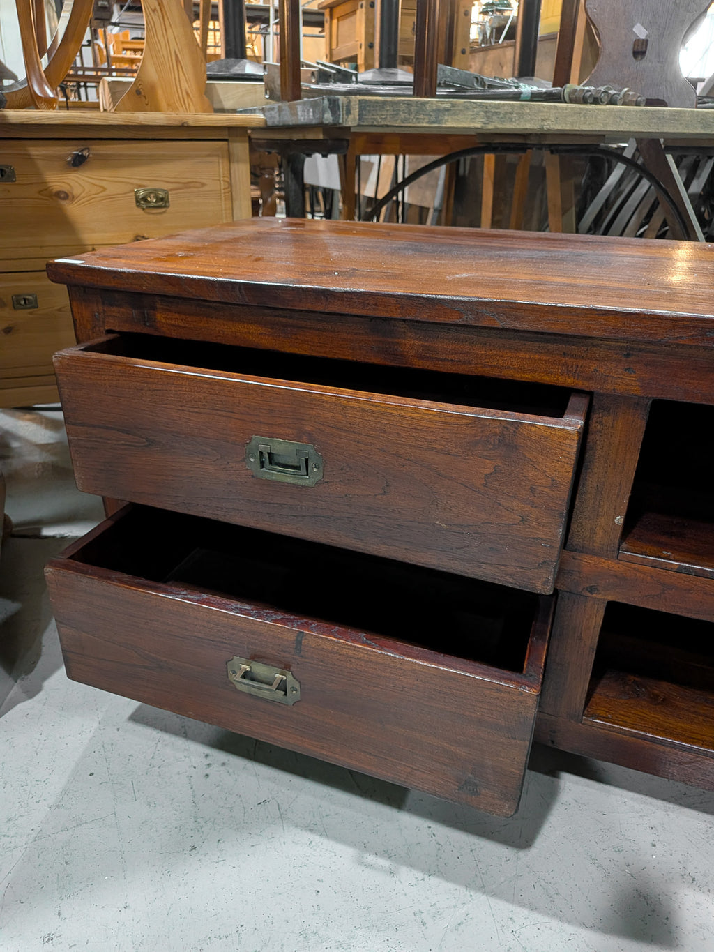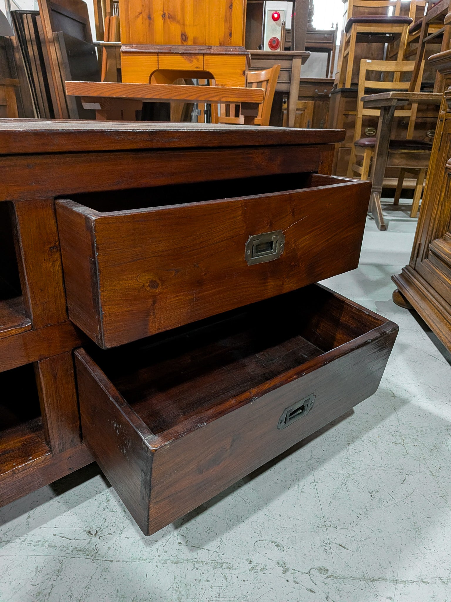 濃いダークブラウンのウッドが使われ、その力強い質感がラスティックで落ち着いた雰囲気をもたらします。両サイドに大きな引き出し、中央にはオープンスペースが備えられた、実用性の高い構造です。
