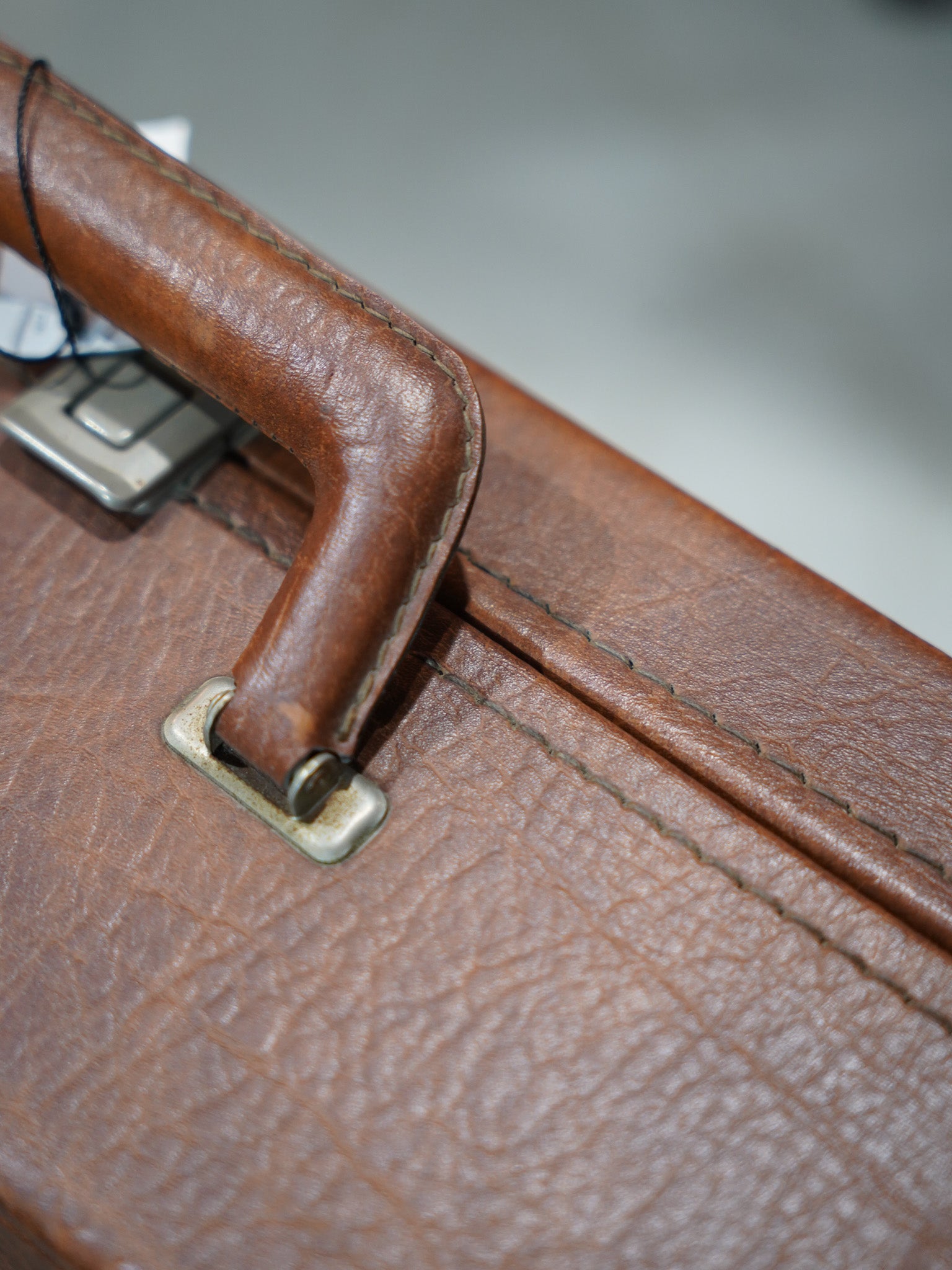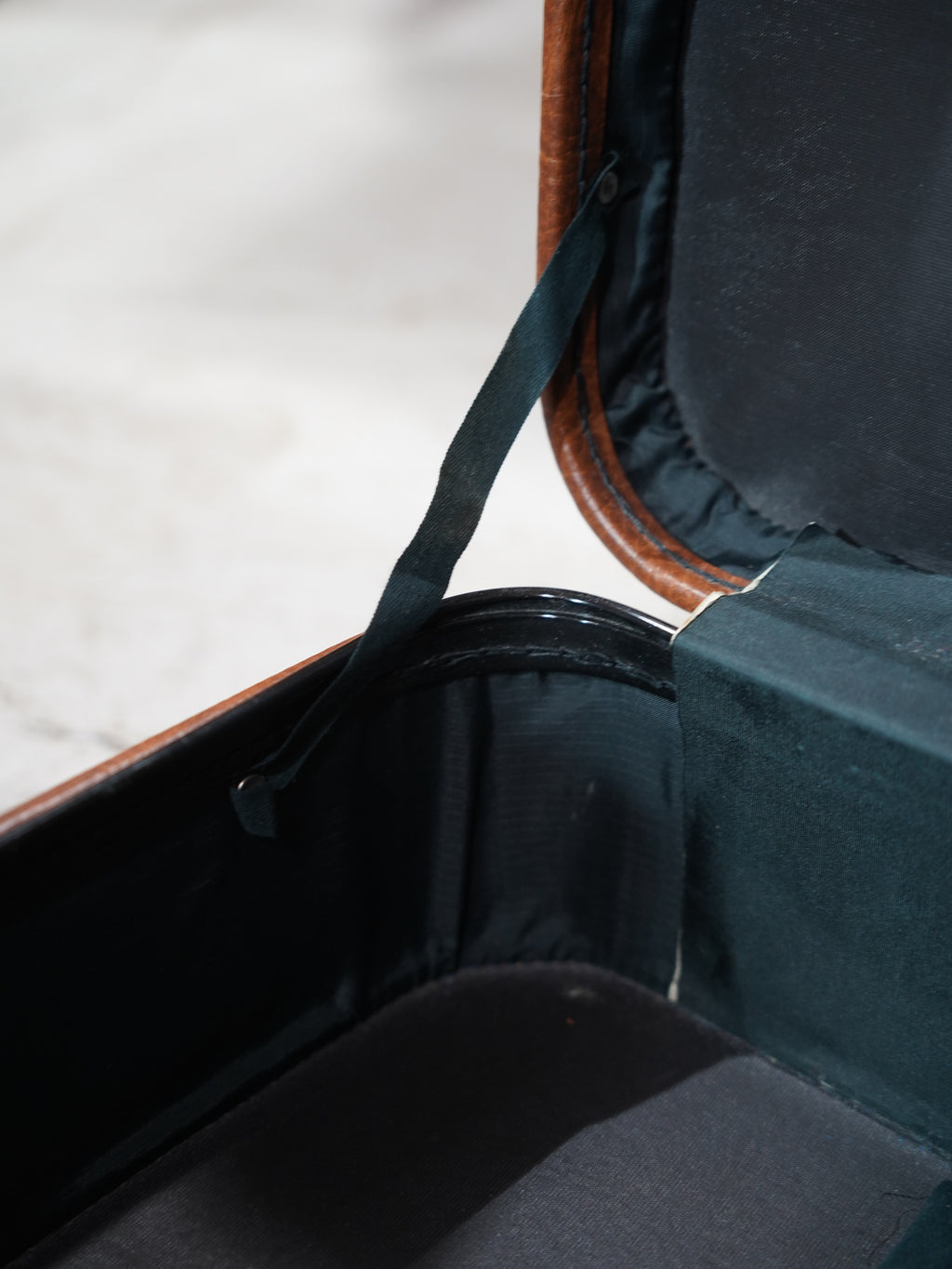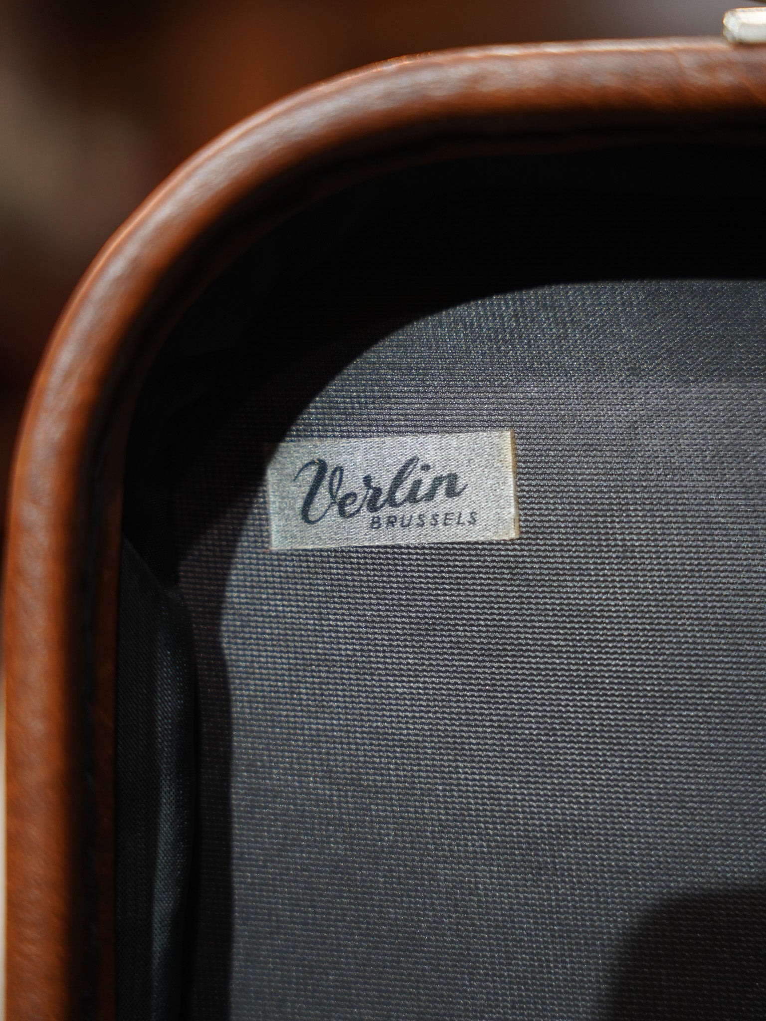 表面に刻まれた豊かな風合いと、使い込まれることで刻まれた細かな表情、手に馴染むハンドルの質感や、時を経て鈍く光る金具の一つひとつに、当時の確かな物作りが息づいています。蓋を開ければ、内装には清潔感のあるグレーのファブリックが張られ、端正に添えられた「Verlin BRUSSELS」のタグが品格を漂わせています。