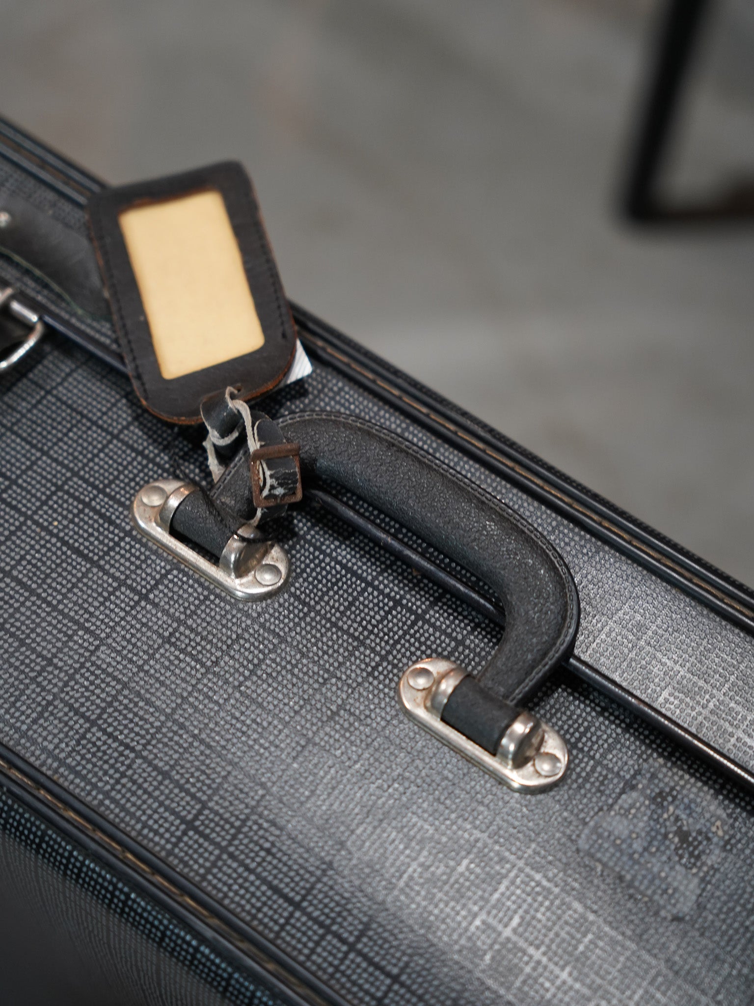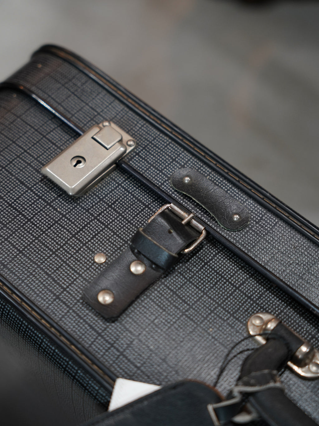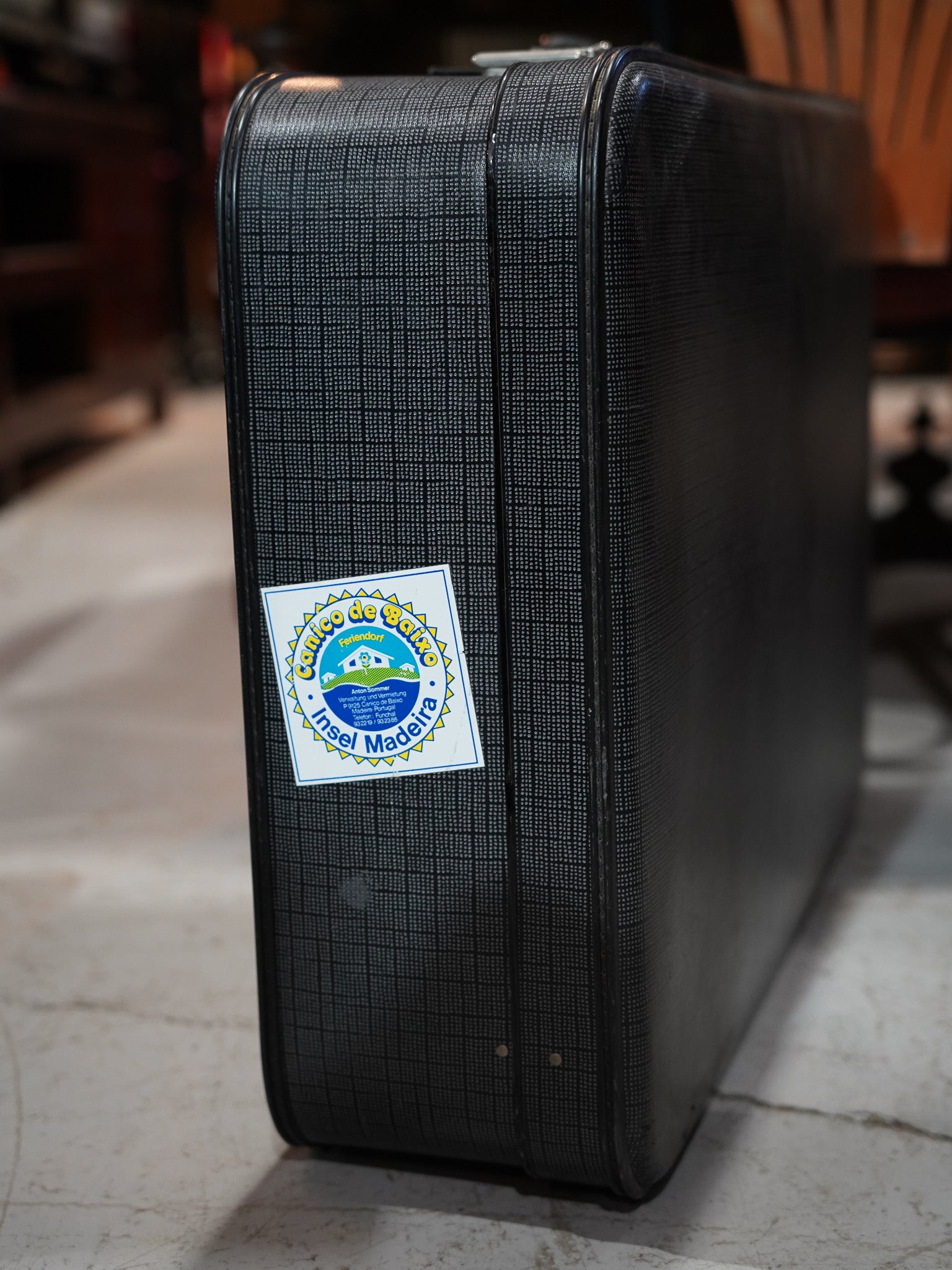 モノクロームの細かいチェックパターンが目を引くヴィンテージトランクケースです。側面にはポルトガルのリゾート地、マデイラ島の「Insel Madeira」のトラベルステッカーがそのまま残されており、かつての持ち主が共に海を越えた旅の記憶を今に伝えています。