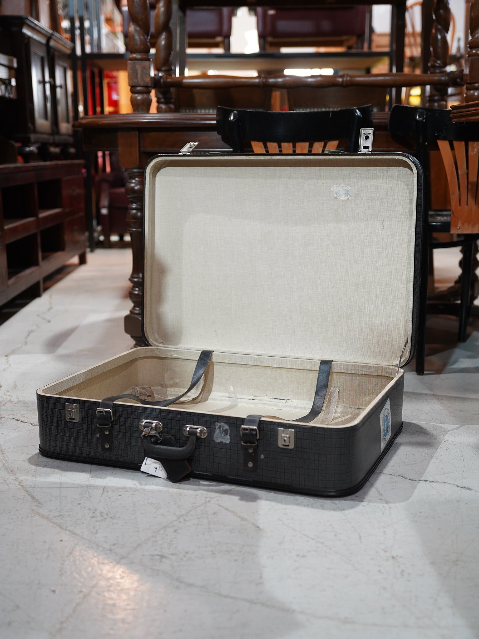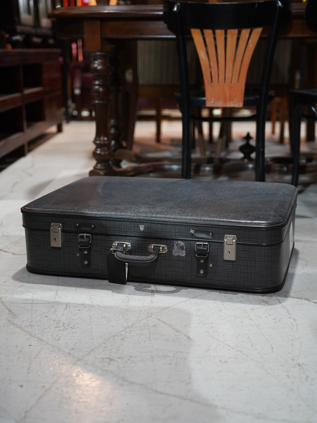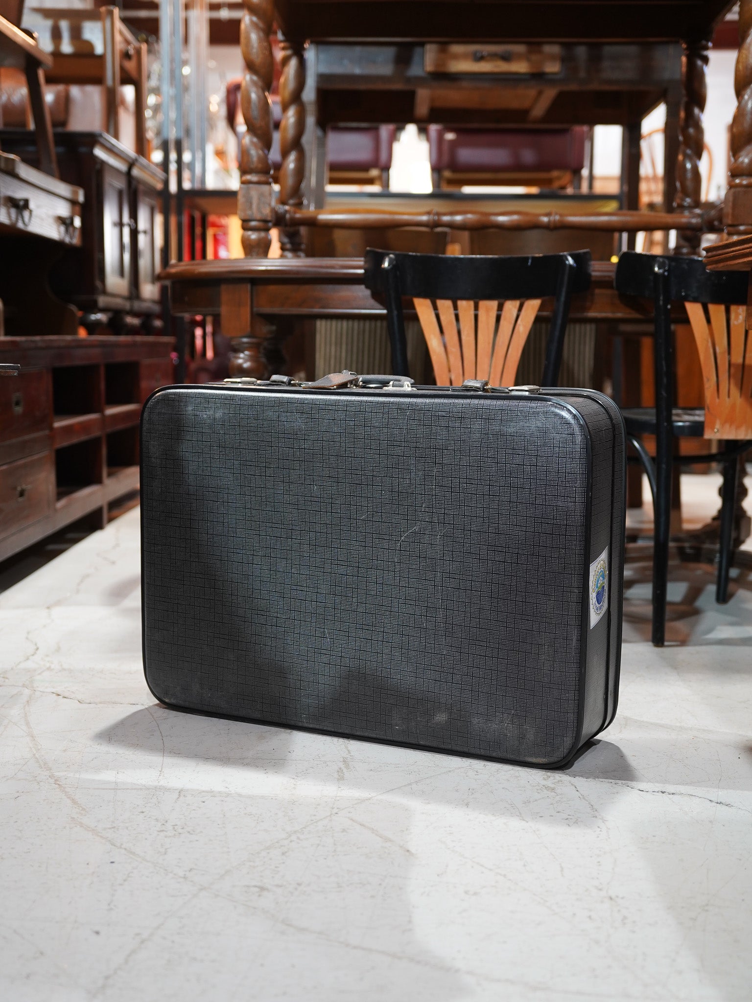 モノクロームの細かいチェックパターンが目を引くヴィンテージトランクケースです。側面にはポルトガルのリゾート地、マデイラ島の「Insel Madeira」のトラベルステッカーがそのまま残されており、かつての持ち主が共に海を越えた旅の記憶を今に伝えています。