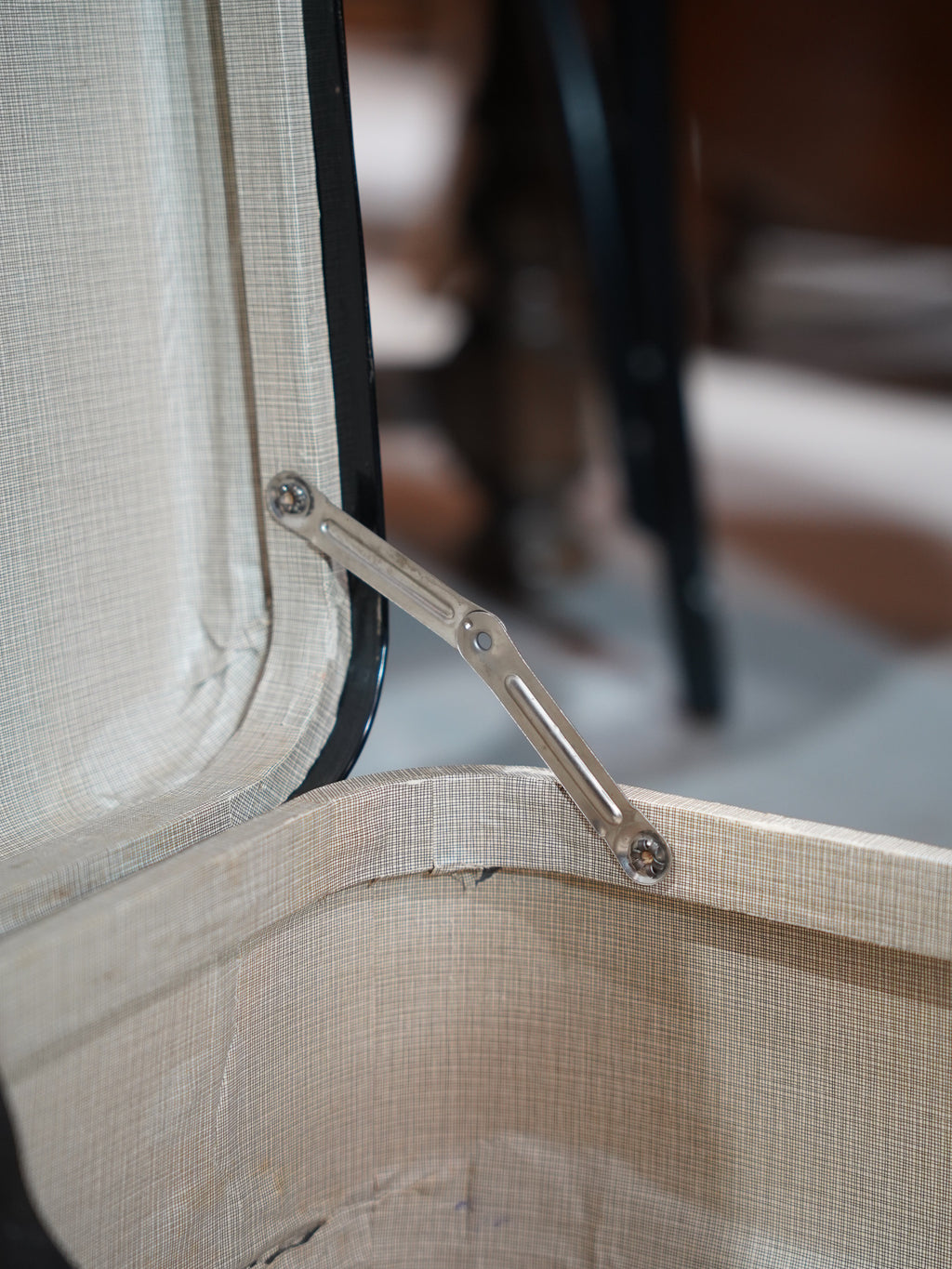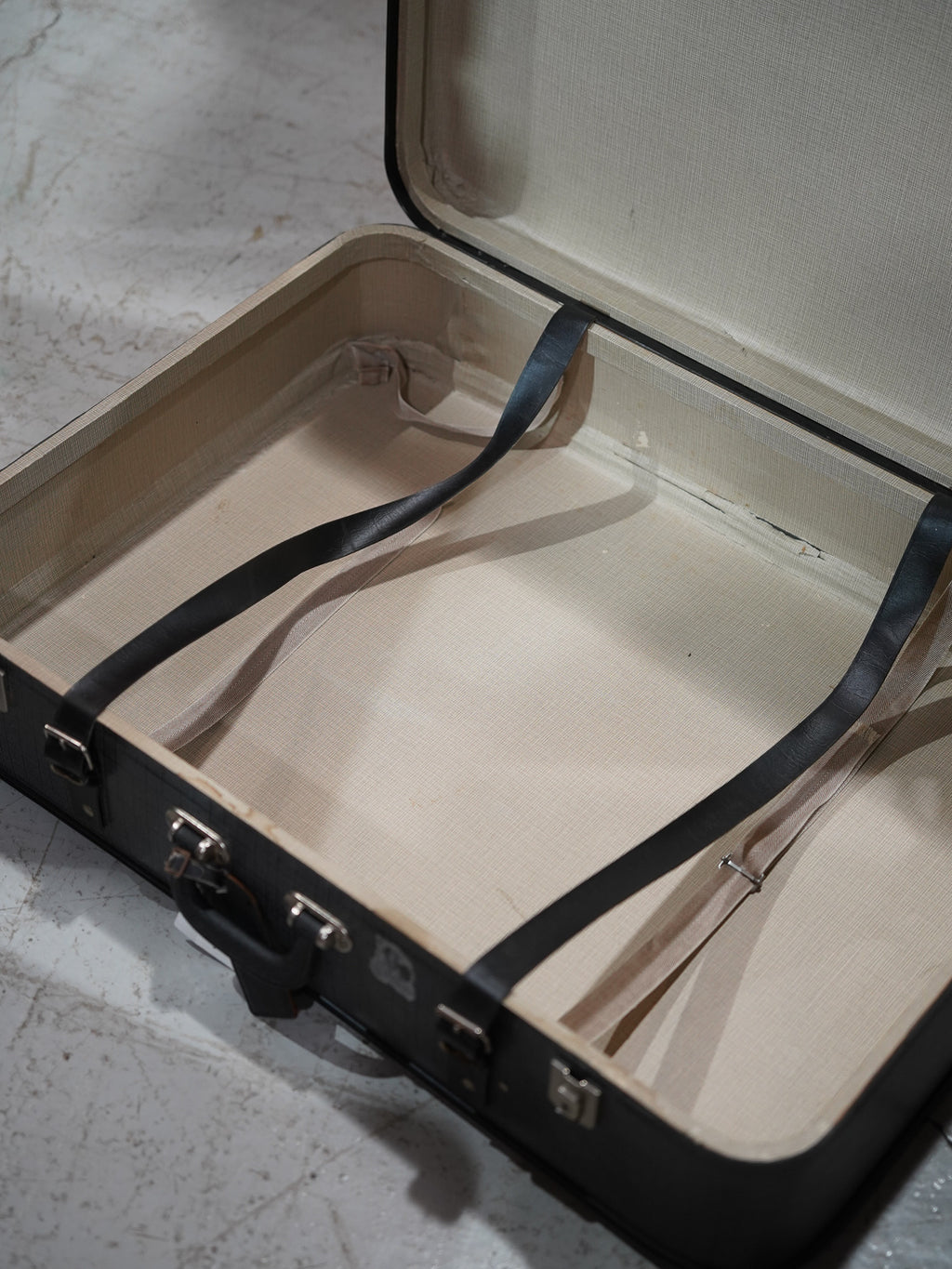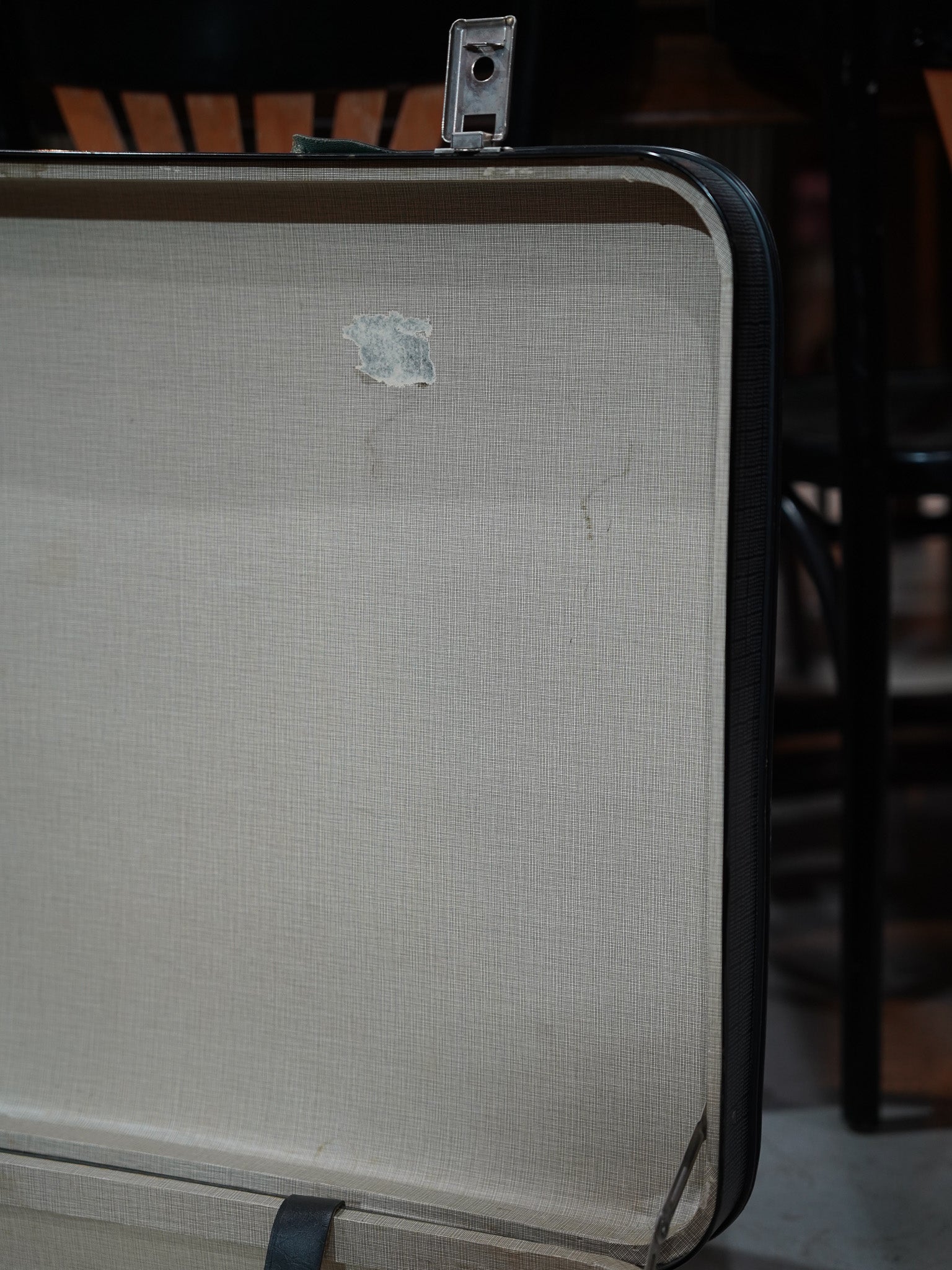 蓋を開ければ、内装には明るいオフホワイトのファブリックが丁寧に張られており、大切に使い込まれてきたことが伺えます。衣類や小物の収納としてはもちろん、その端正な佇まいを活かして、お部屋の隅に積み重ねてサイドテーブル代わりにしたり、オープンディスプレイの什器として活用したりと、インテリアの楽しみ方は自由自在です。