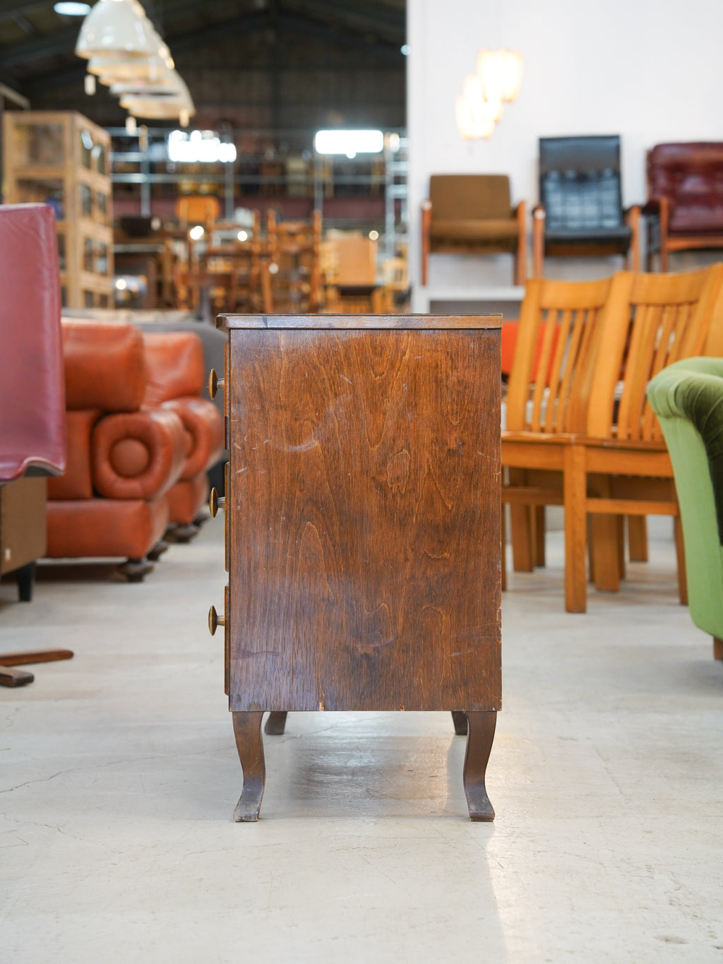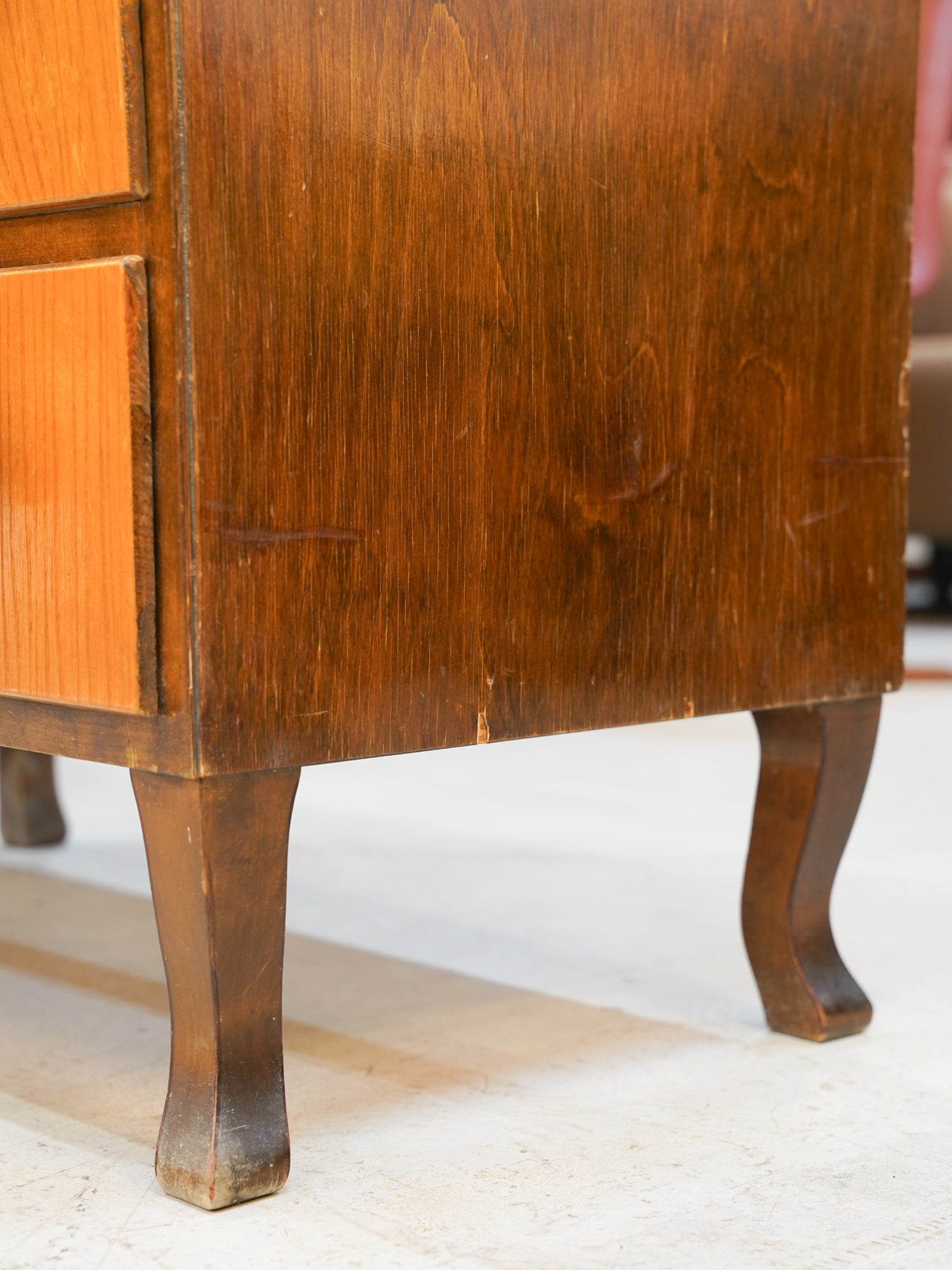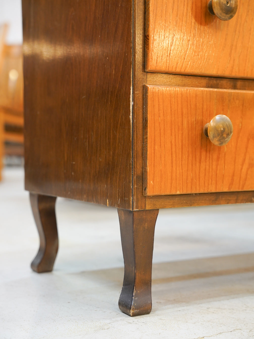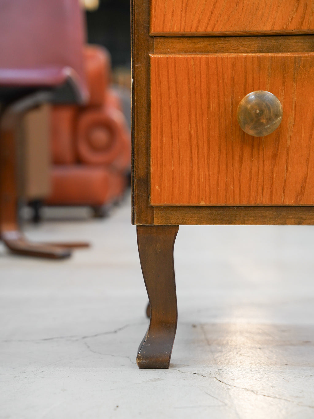一番の魅力は、端正なフォルムに宿るクラシックなディテールです。引き出し前板の明るい木色と、本体のダークな色調とのコントラストが美しく、丸く可愛らしい木のノブが、重厚さの中に素朴な温かみを添えています。猫脚(カブリオールレッグ)を彷彿とさせる、優雅な曲線を描く脚部の造形は、お部屋に気品ある佇まいをもたらします。