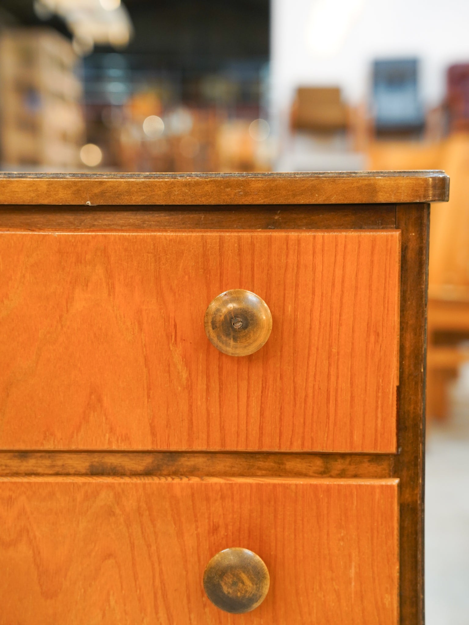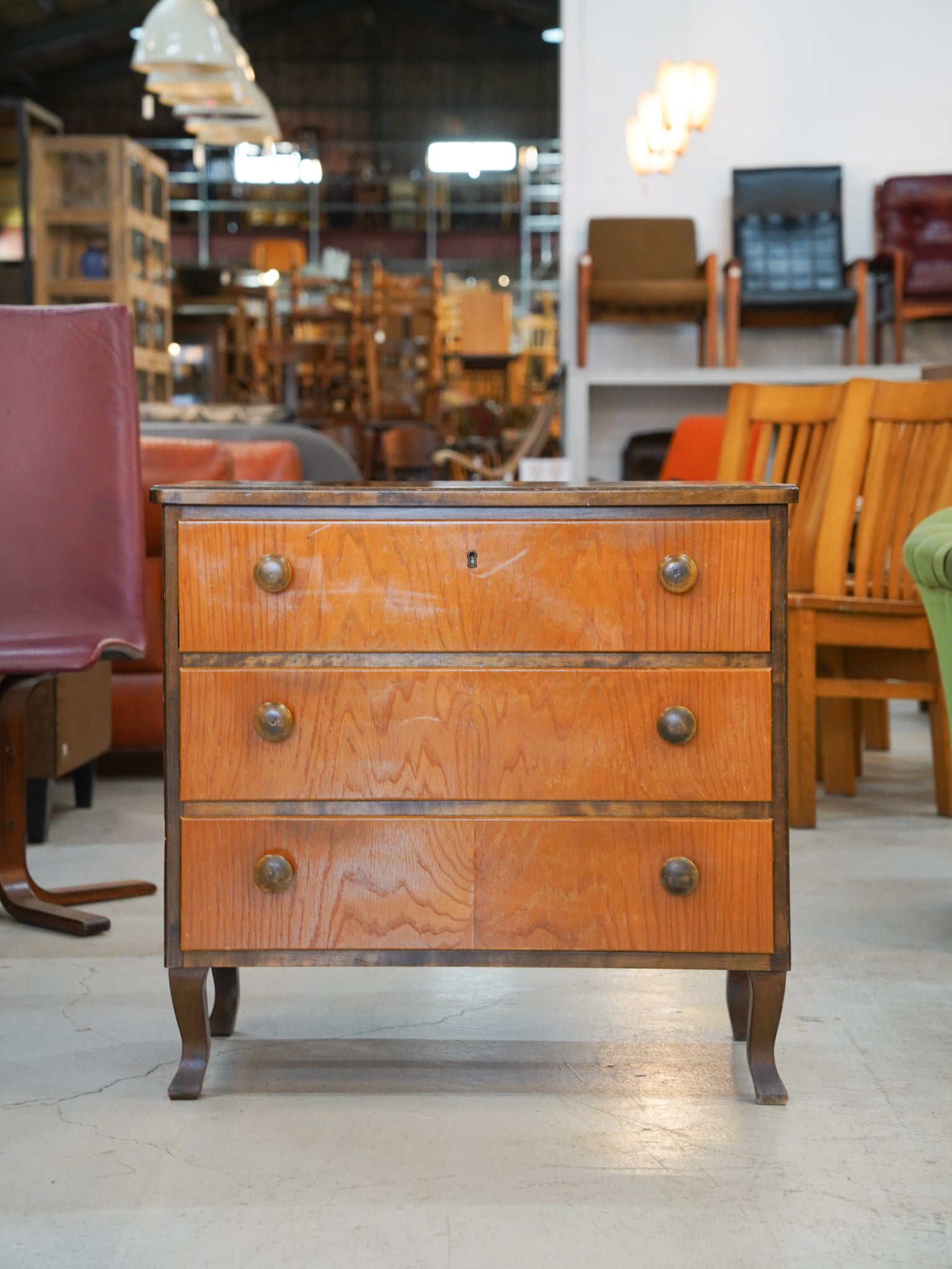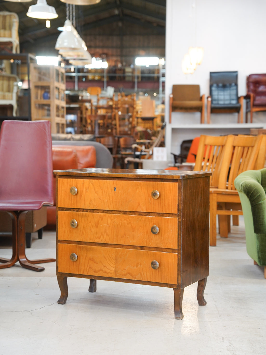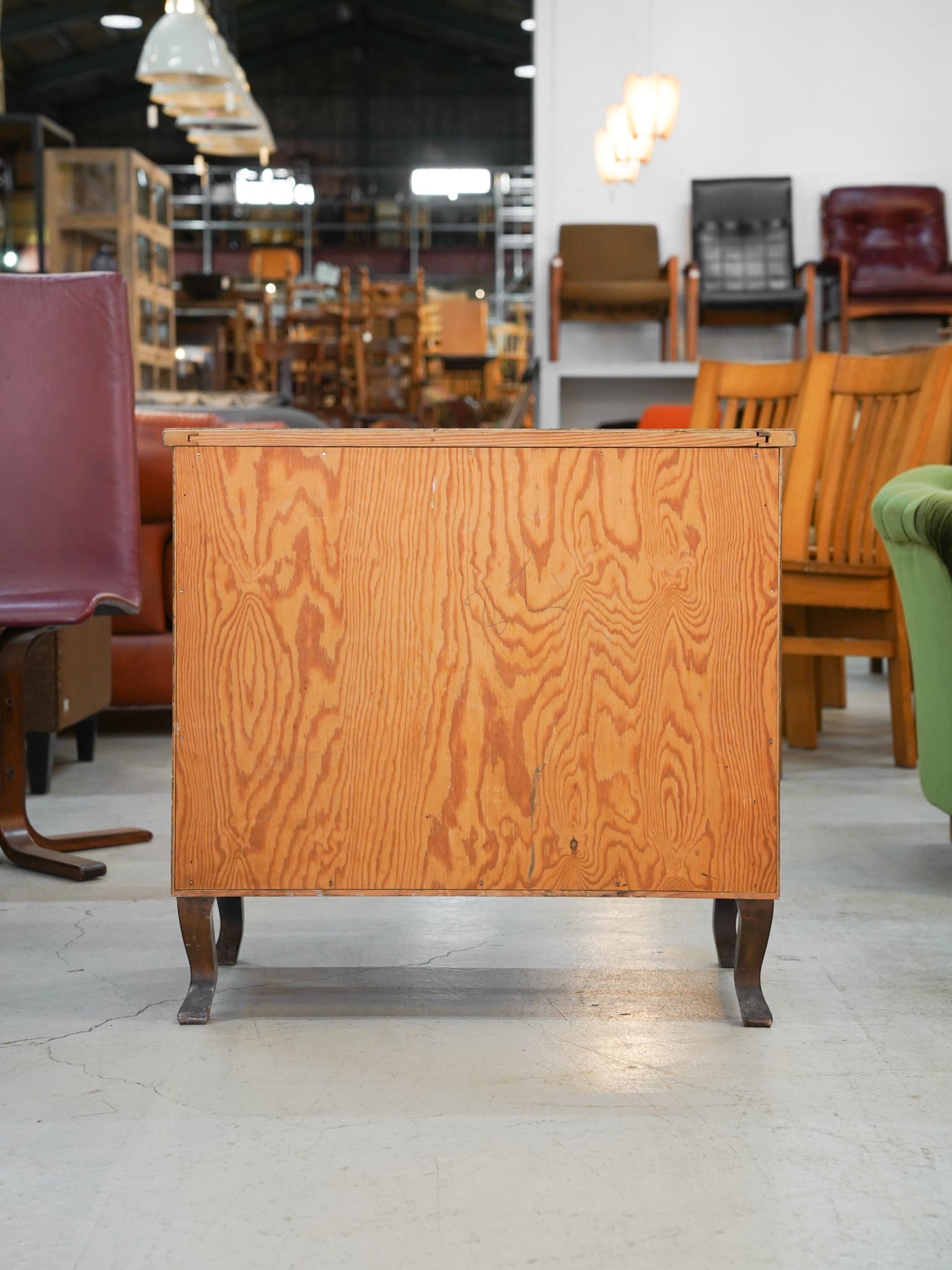 一番の魅力は、端正なフォルムに宿るクラシックなディテールです。引き出し前板の明るい木色と、本体のダークな色調とのコントラストが美しく、丸く可愛らしい木のノブが、重厚さの中に素朴な温かみを添えています。猫脚(カブリオールレッグ)を彷彿とさせる、優雅な曲線を描く脚部の造形は、お部屋に気品ある佇まいをもたらします。