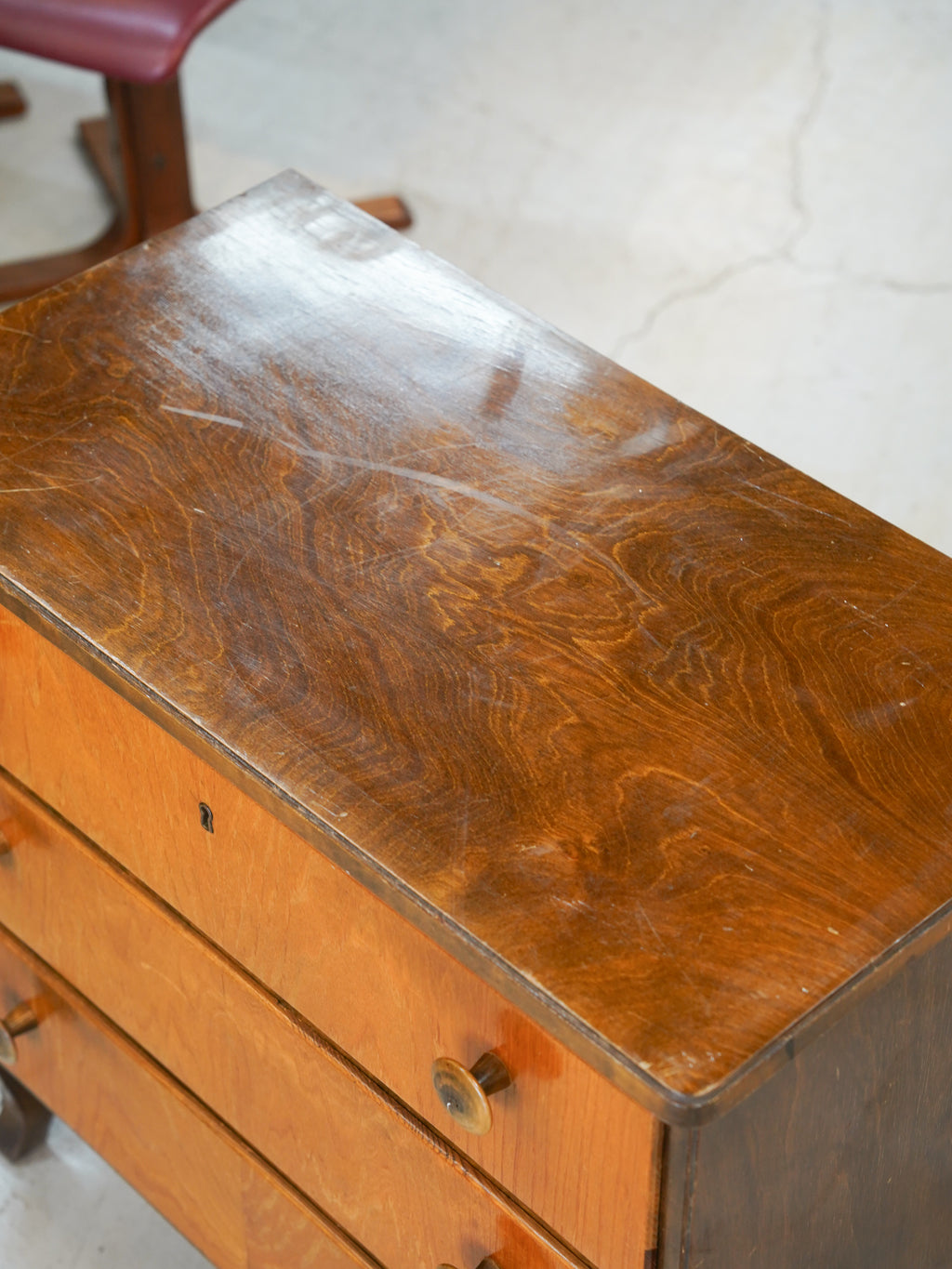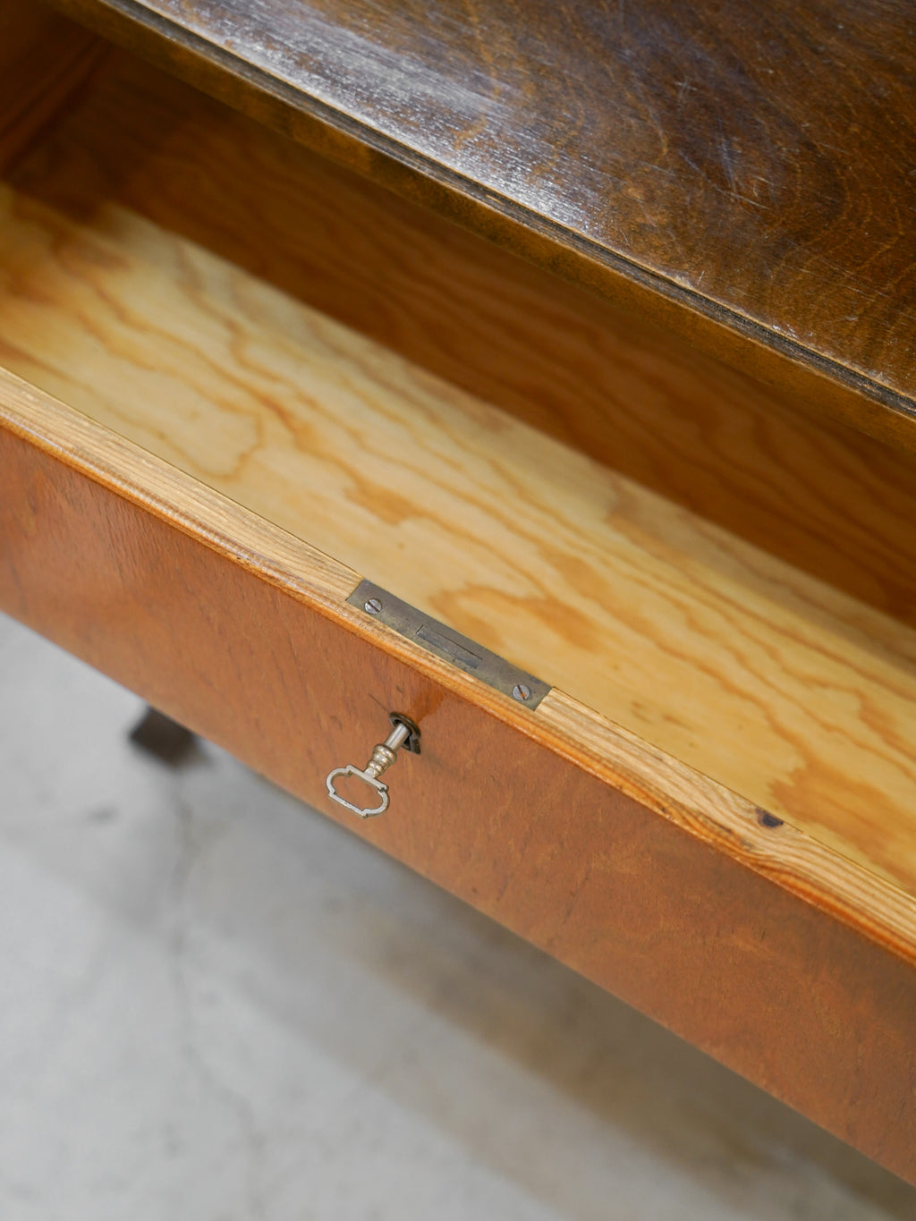 天板や側面には、使い込まれることで刻まれた細かな傷や艶があり、本物のヴィンテージ家具だけが持つ「物語」を感じさせます。最上段には鍵穴が備わっており、大切なものをそっと仕舞っておきたくなるような特別感があります。