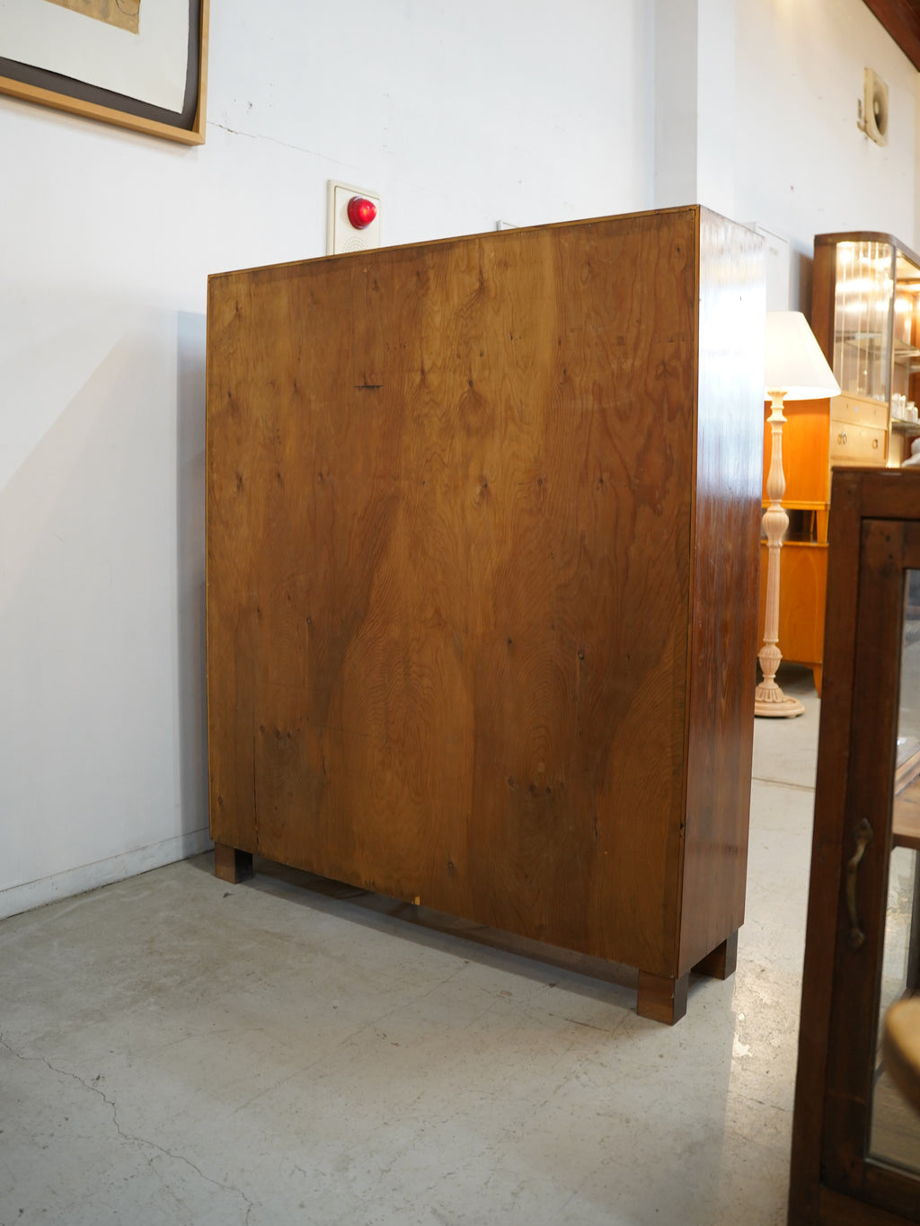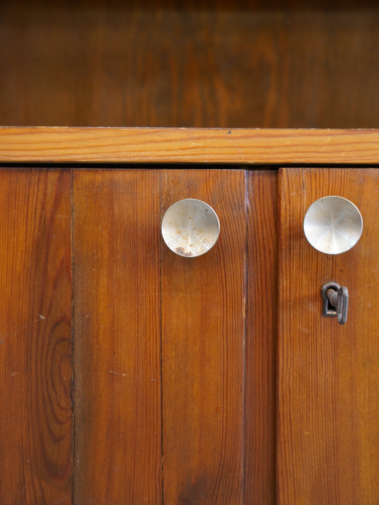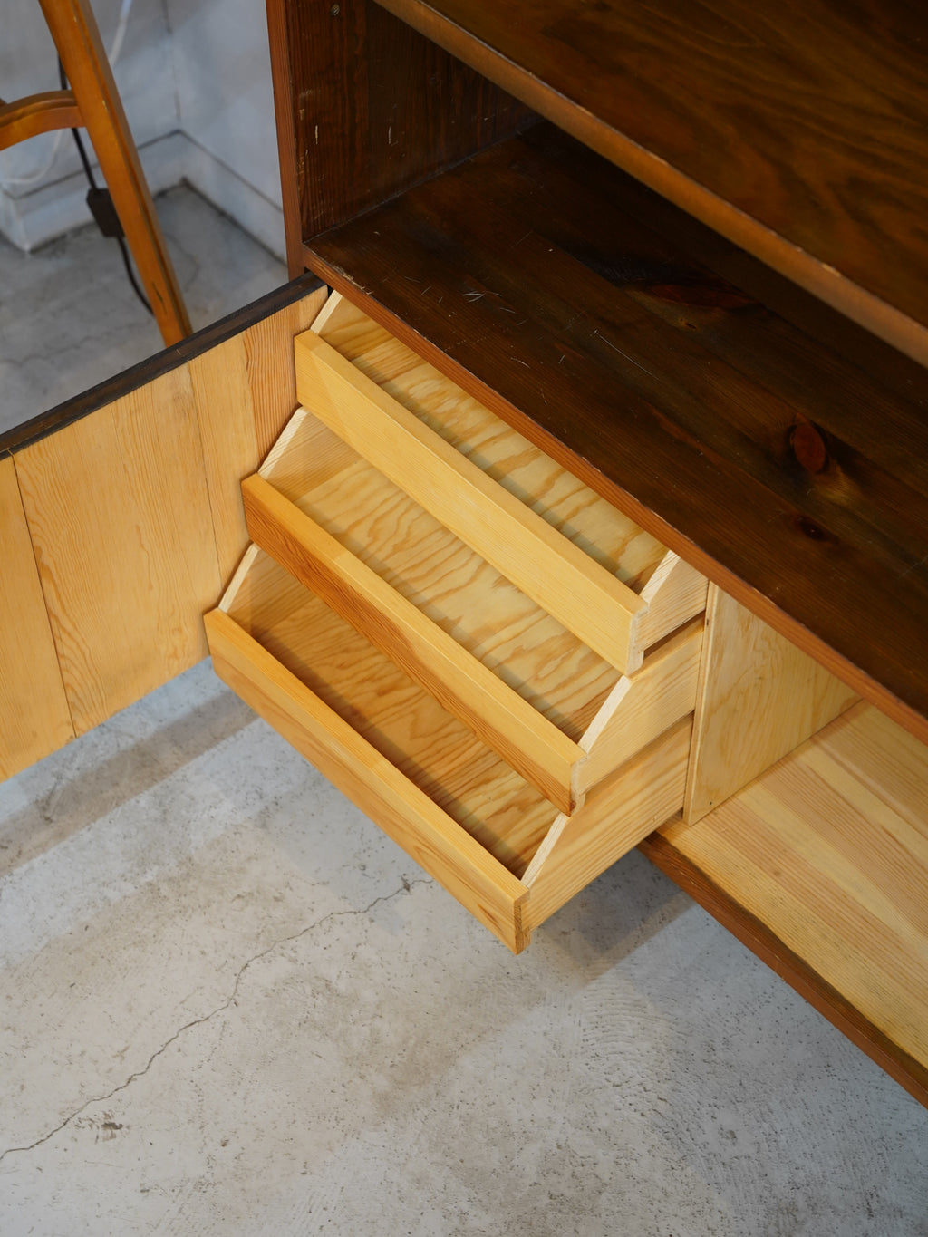 長い年月を経て深みを増した木肌の風合いが、現代の家具には出せない静かな存在感を放ちます。上部のオープンシェルフは、棚板の前面に施された面取り加工など、細部にまで職人の美意識が宿る仕上がりです。