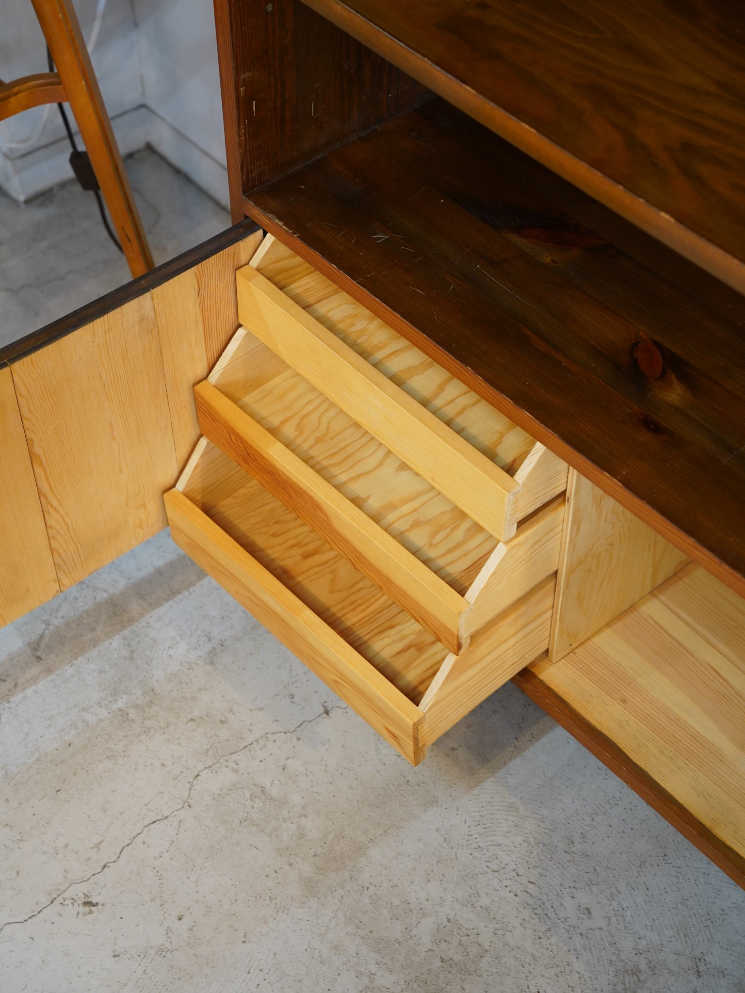 特筆すべきは、下部の扉内に隠された精巧な造りです。扉を開けると現れる、幾層にも重なったスライド式のトレイ。書類や小物を整理するために設計されたこの機能美は、当時の暮らしを整えることへの真摯な姿勢を感じさせます。