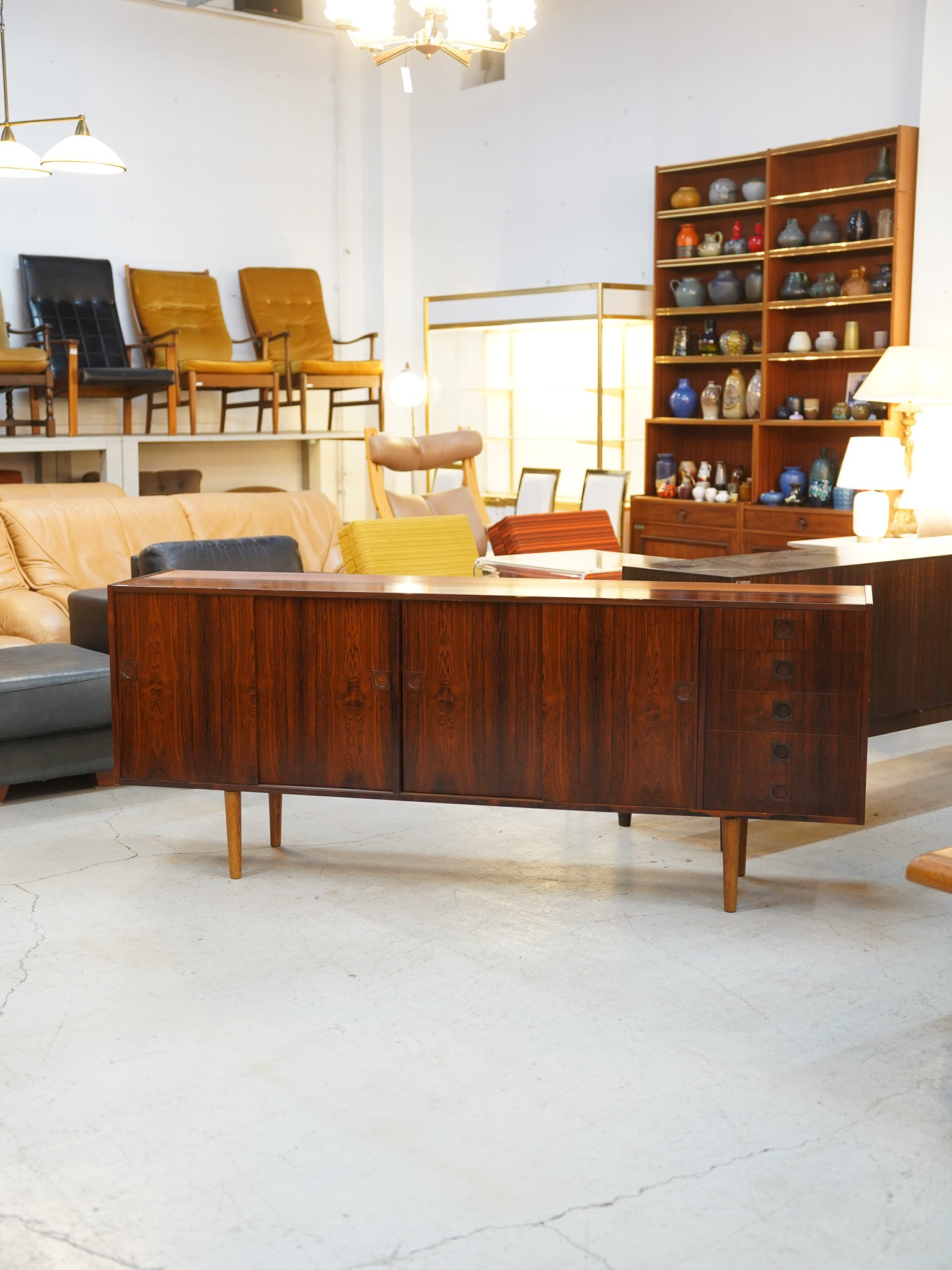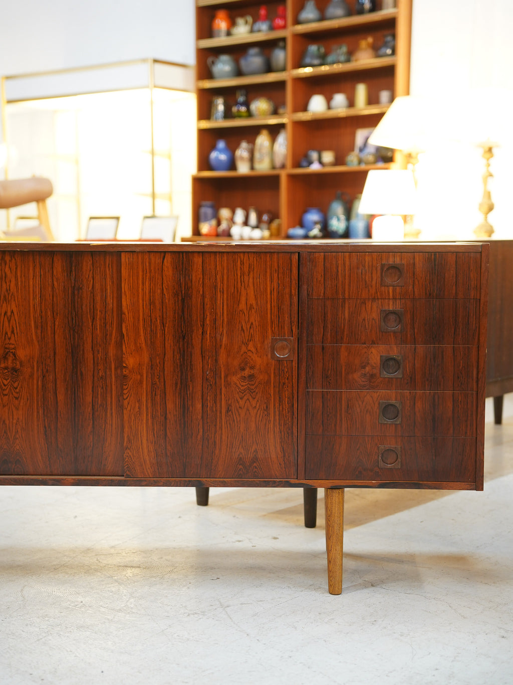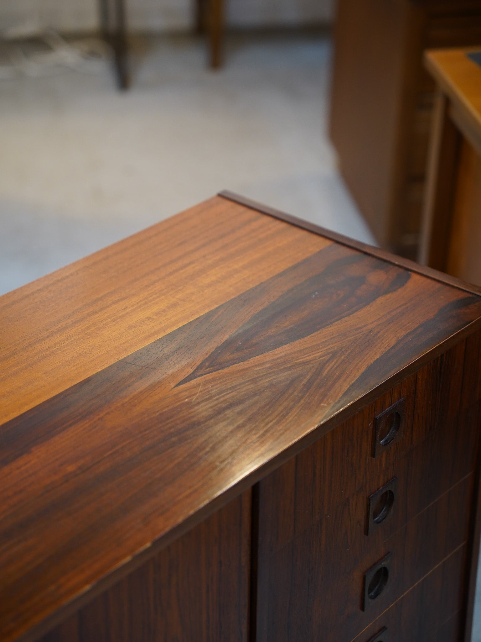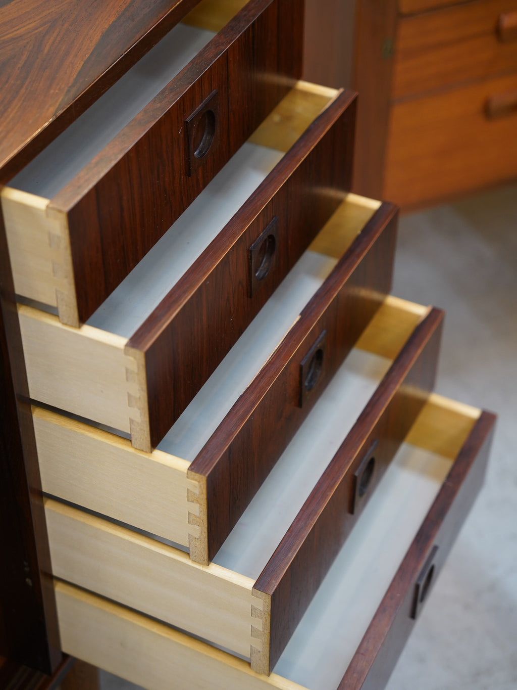 意匠のポイントは、天然木の無垢材を緻密に削り出して作られた円形の取っ手デザイン。北欧ヴィンテージらしい手仕事の温もりと、ウッド素材の重厚さが絶妙なバランスで融合しています。内部は収納力に優れた大容量の設計となっており、滑らかに開閉する引き出しの造作など、当時の熟練した職人による高い技術力が細部にまで宿っています。