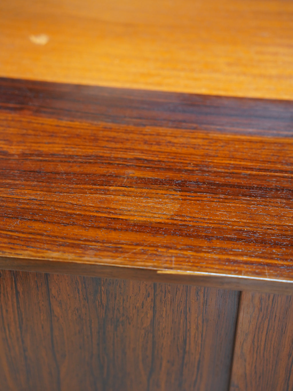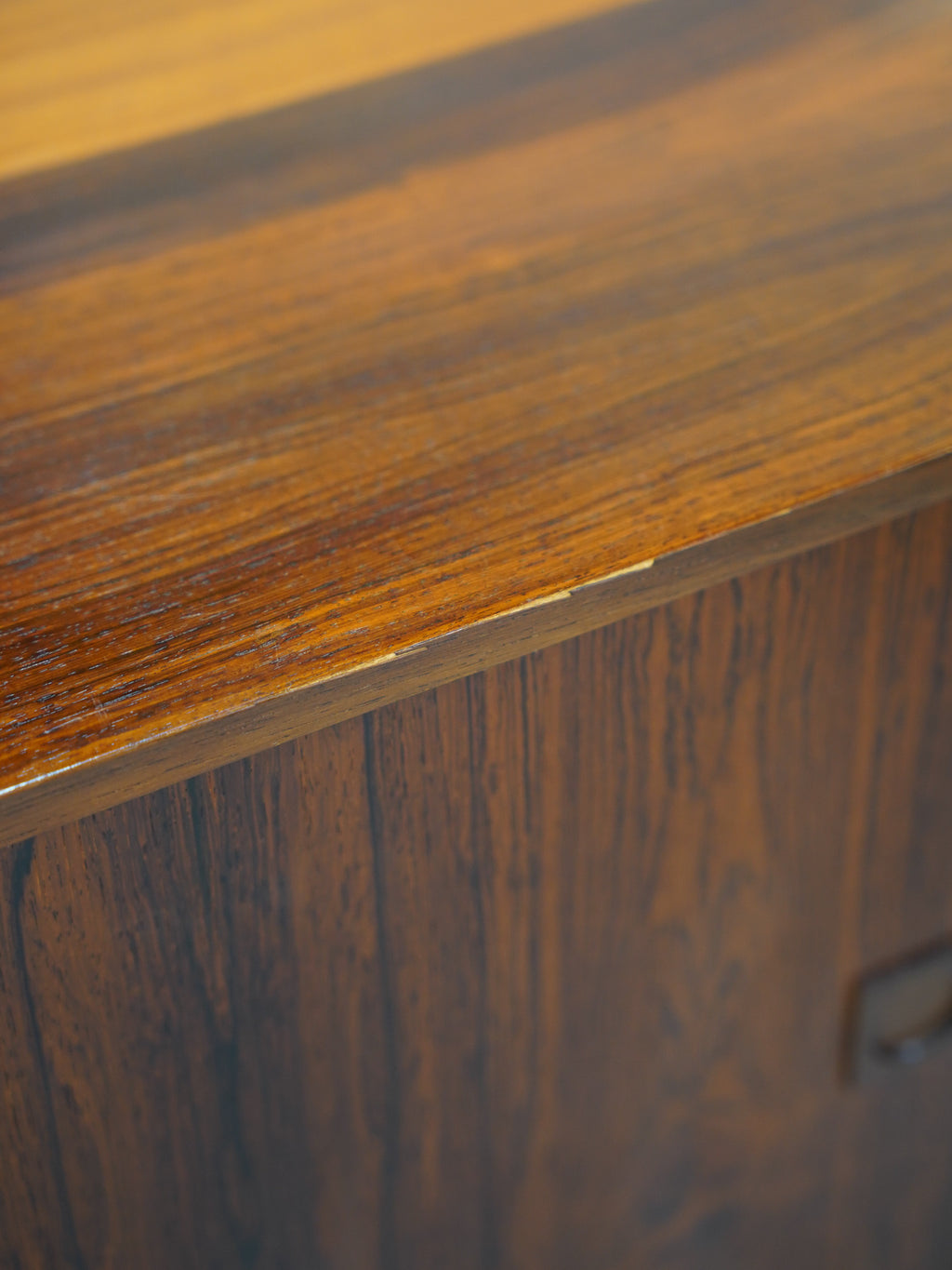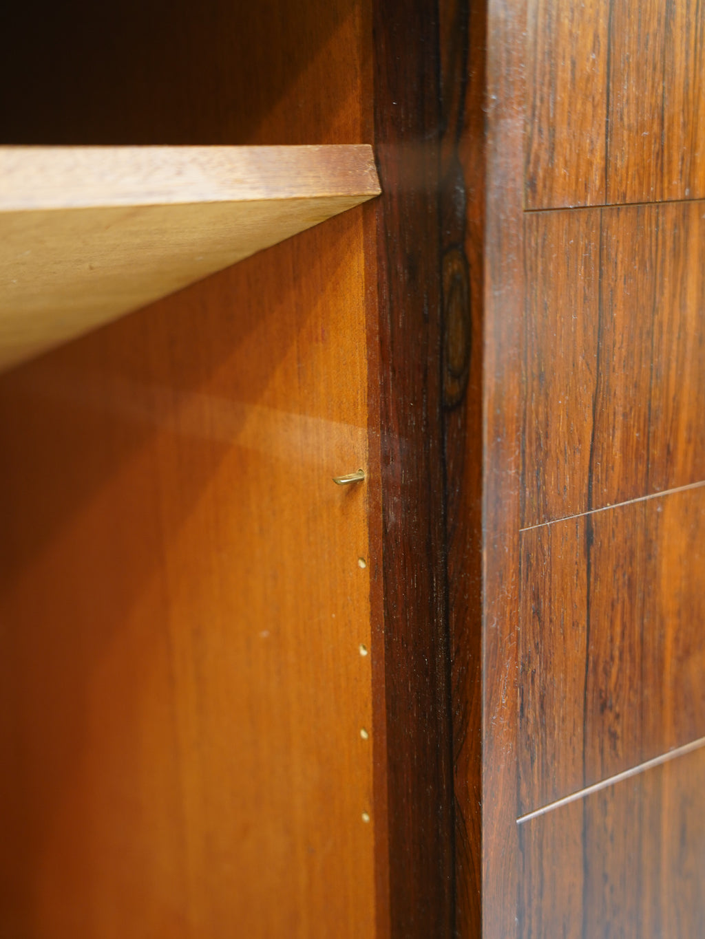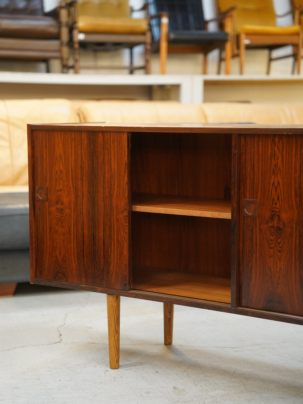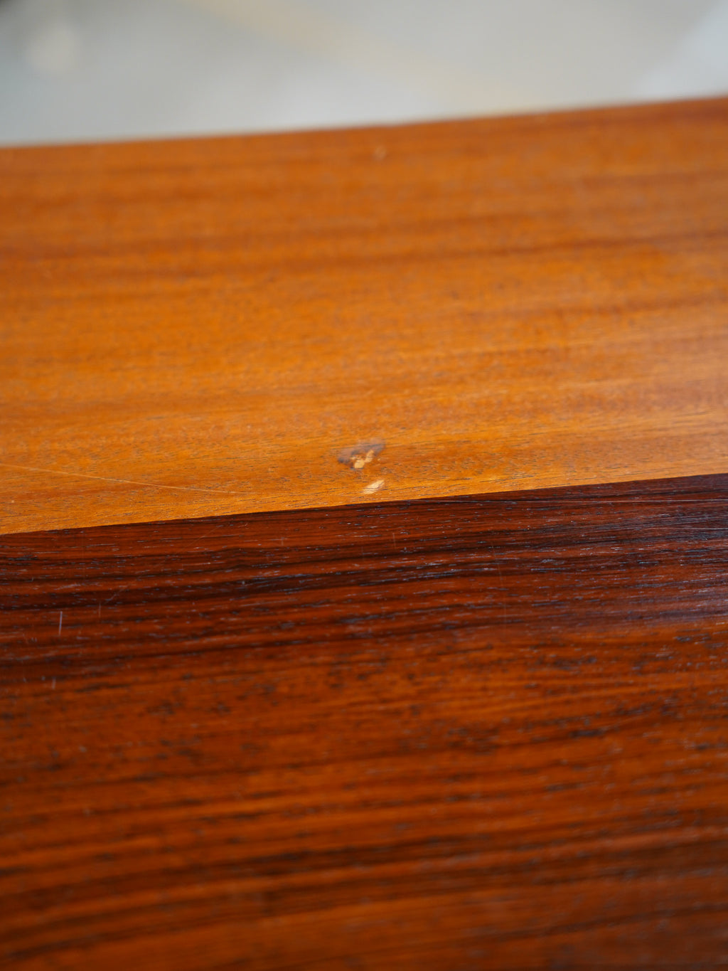 意匠のポイントは、天然木の無垢材を緻密に削り出して作られた円形の取っ手デザイン。北欧ヴィンテージらしい手仕事の温もりと、ウッド素材の重厚さが絶妙なバランスで融合しています。内部は収納力に優れた大容量の設計となっており、滑らかに開閉する引き出しの造作など、当時の熟練した職人による高い技術力が細部にまで宿っています。