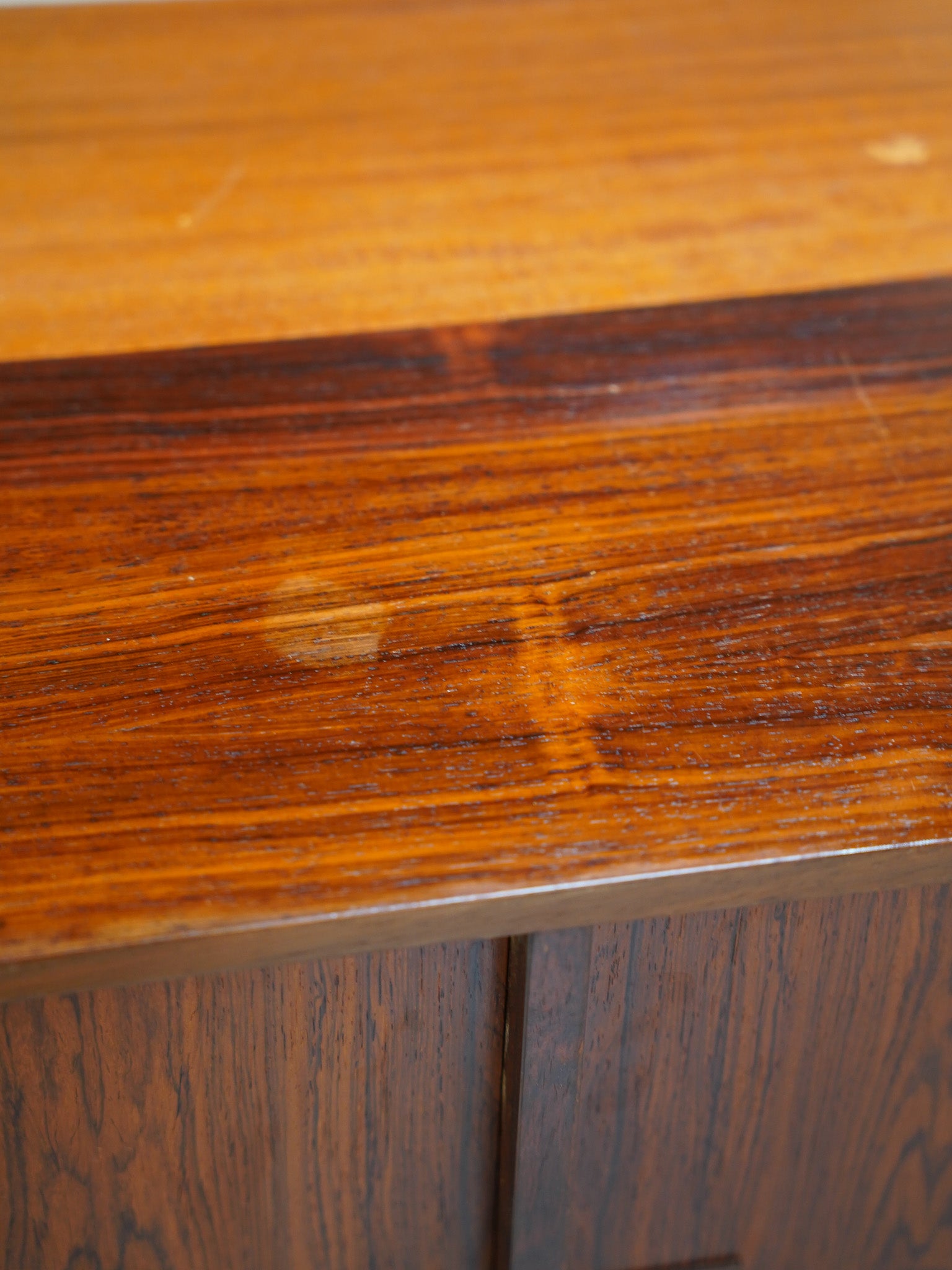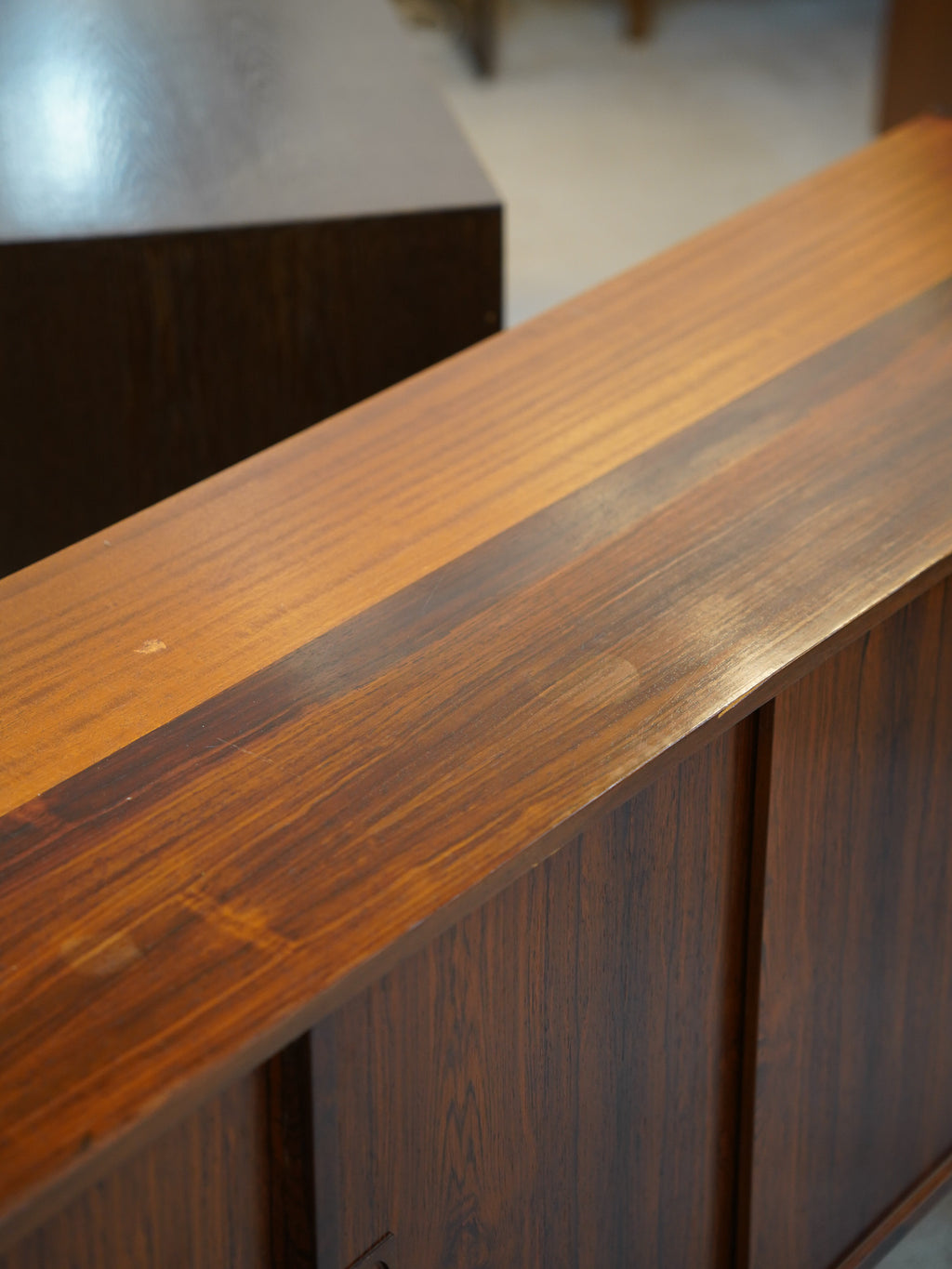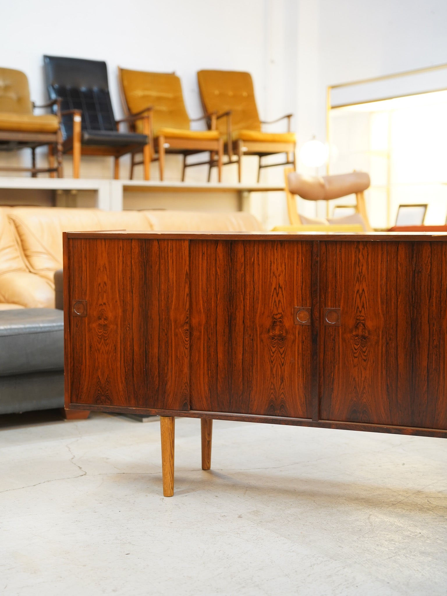 天然木ならではの力強く、深みのある木目を贅沢に活かした、1960年代デンマーク製のロングサイドボードです。正面に広がる、左右対称に配置された幻想的な木目は、さながら一幅の絵画のような圧倒的な存在感を放ちます。横幅をたっぷりと取った低く伸びやかなプロポーションは、空間に開放感をもたらしながら、住まいの中心となる確かな風格を漂わせます。