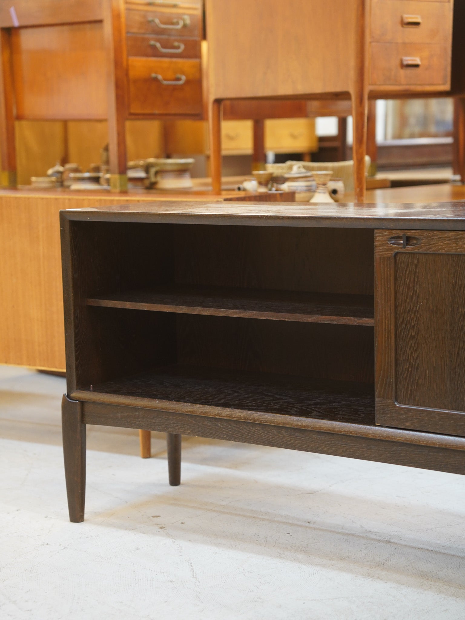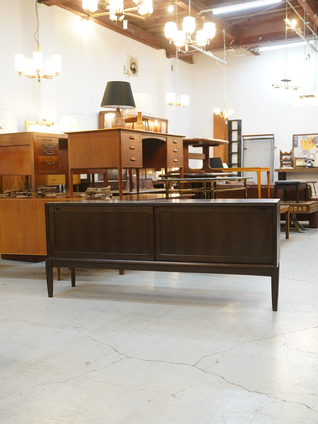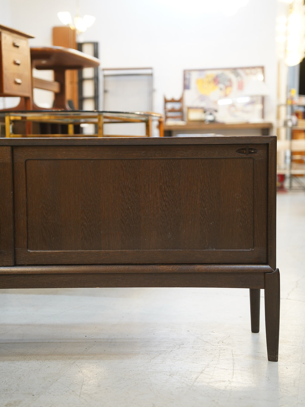 落ち着いたダークトーンのウッド素材が、空間に深い静寂と気品をもたらします。左右の引き戸には、木材を彫り込んで作られた円形の手掛けが施され、内部にはグリーンのフェルトが敷かれた小引き出しを備えるなど、細部にまで機能美が宿っています。横幅のあるロングプロポーションながら、足元に向かってスッと細くなるテーパードレッグにより、圧迫感を与えずリビングに軽やかな印象を与えます。