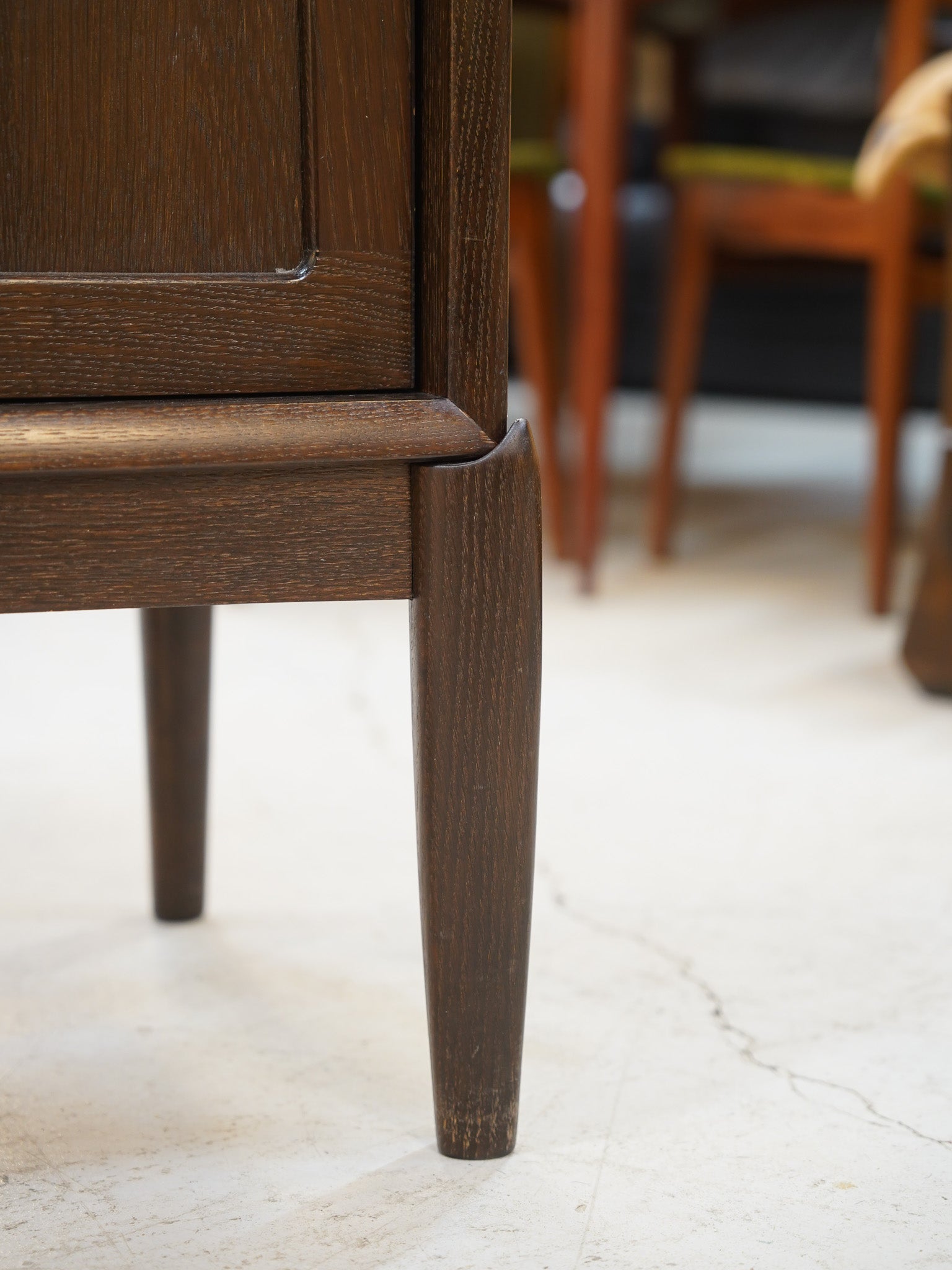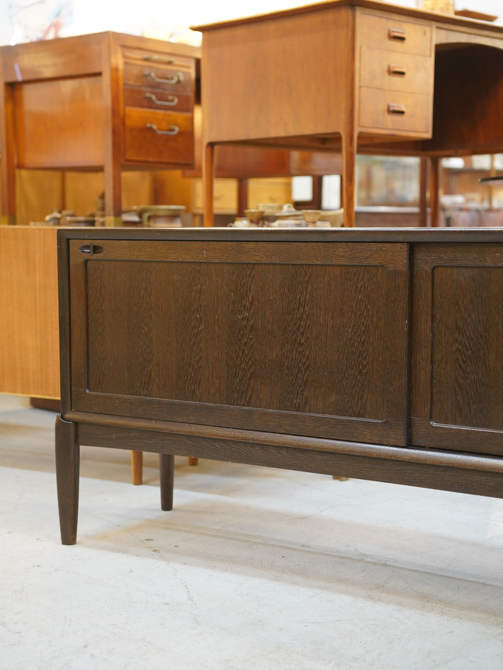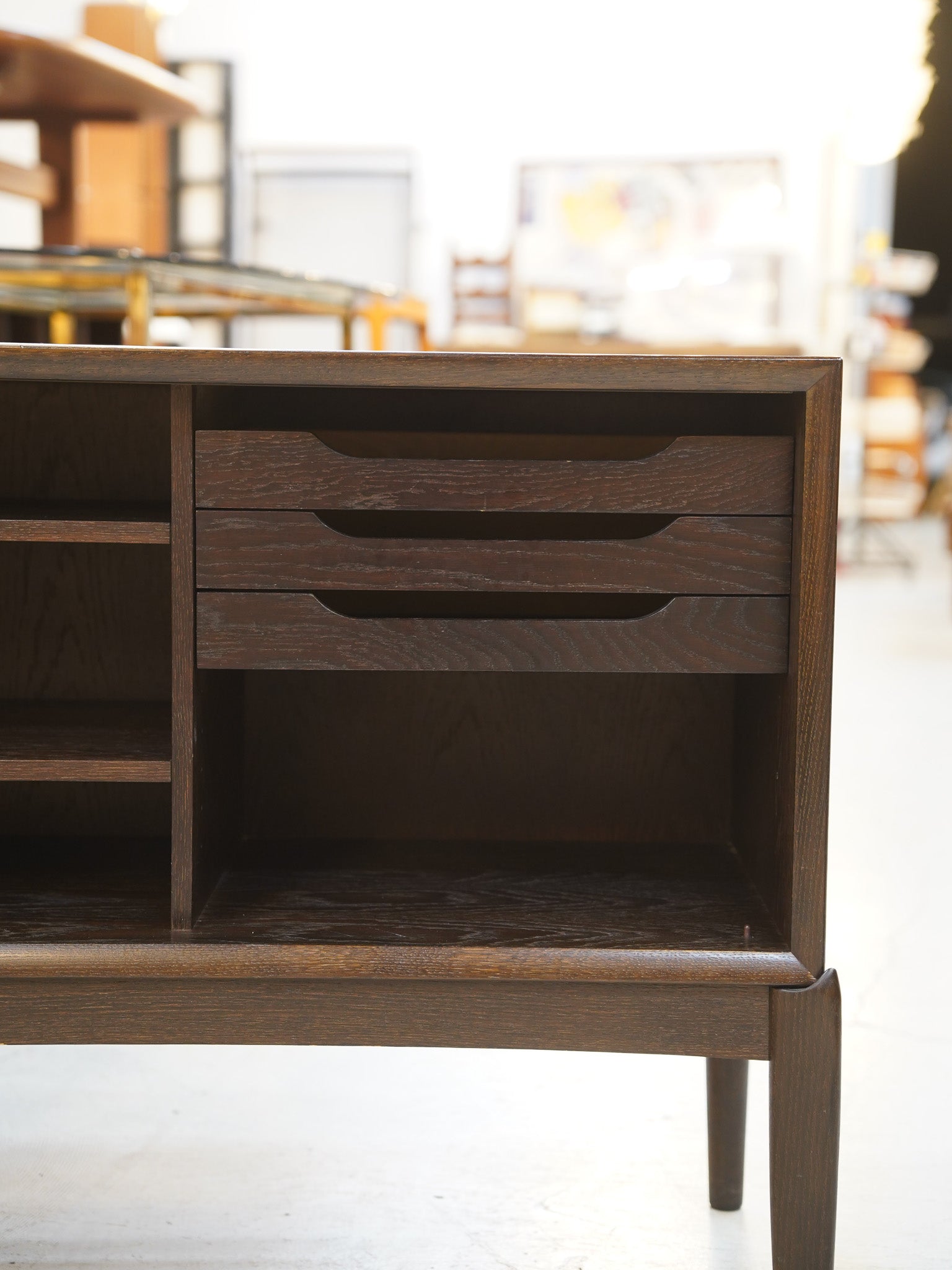 1960年代デンマークの名門BRAMIN社のために、デザイナーの H.W. Kleinが手掛けたヴィンテージ・サイドボードの傑作です。最大の魅力は、天板下の「幕板」と「脚」の接合部です。強固な構造を作り上げると同時に、流れるような曲線美を描くこのディテールは、当時のデンマークが誇る極めて高度な木工技術の結晶と言えます。