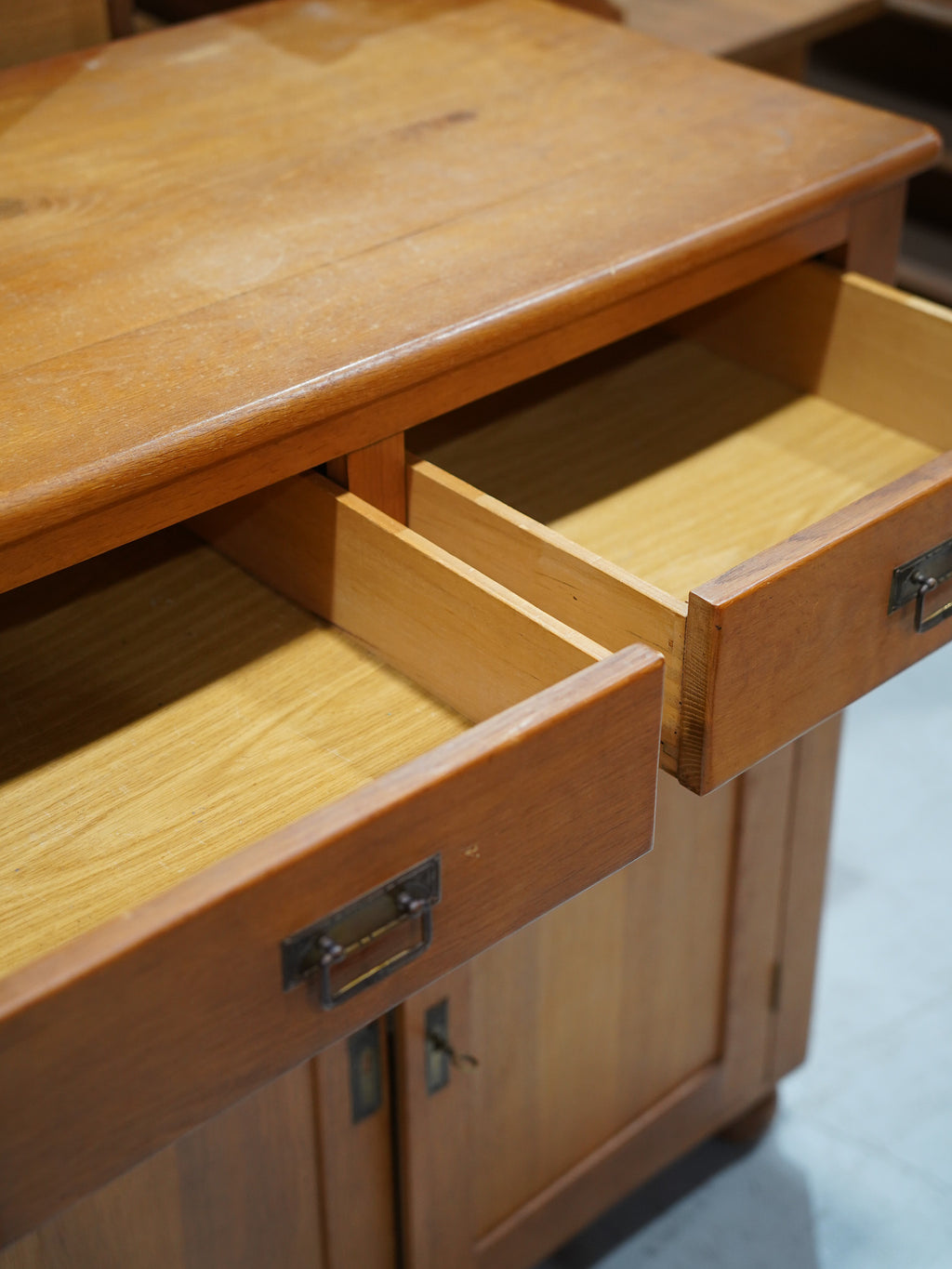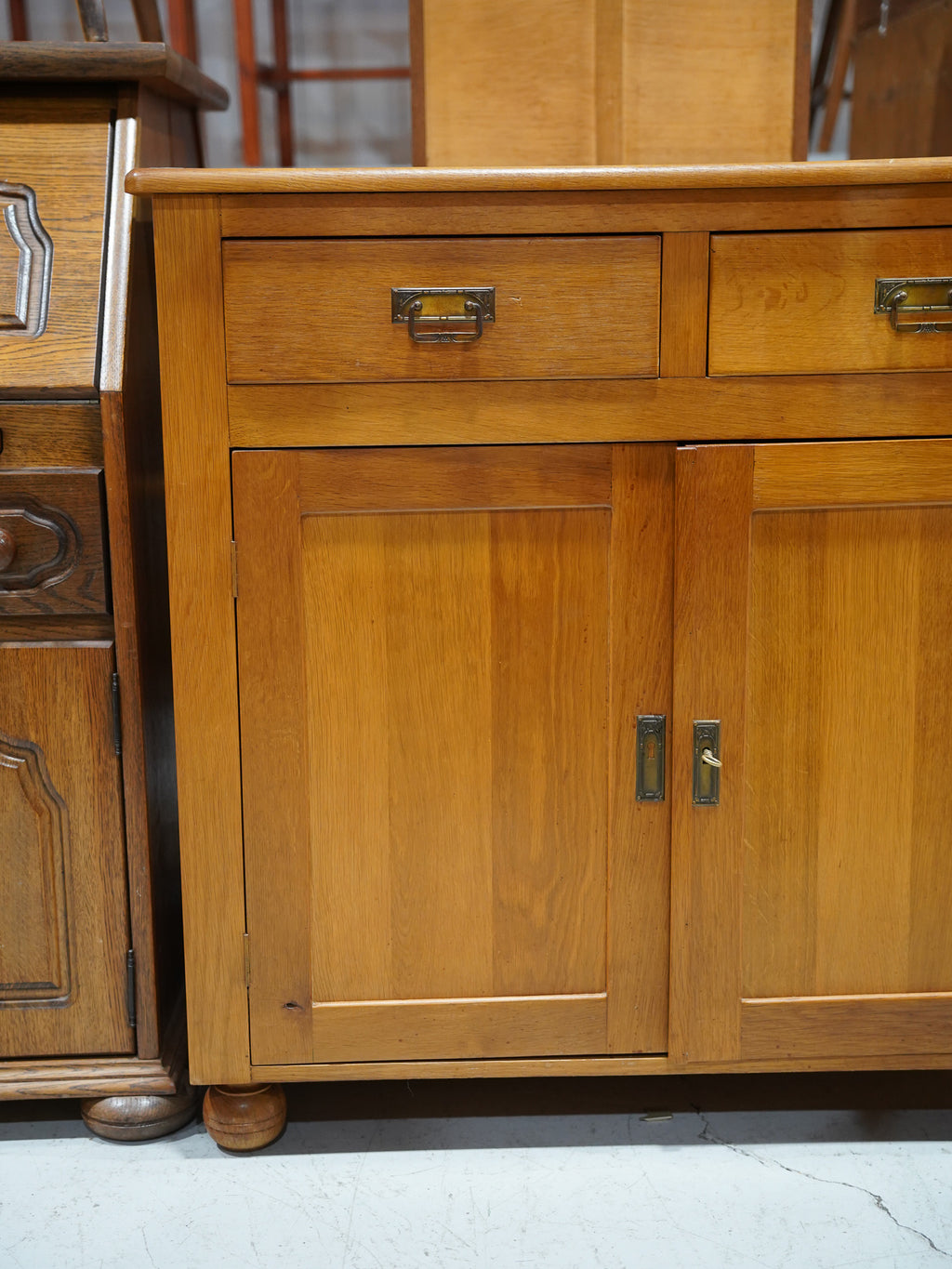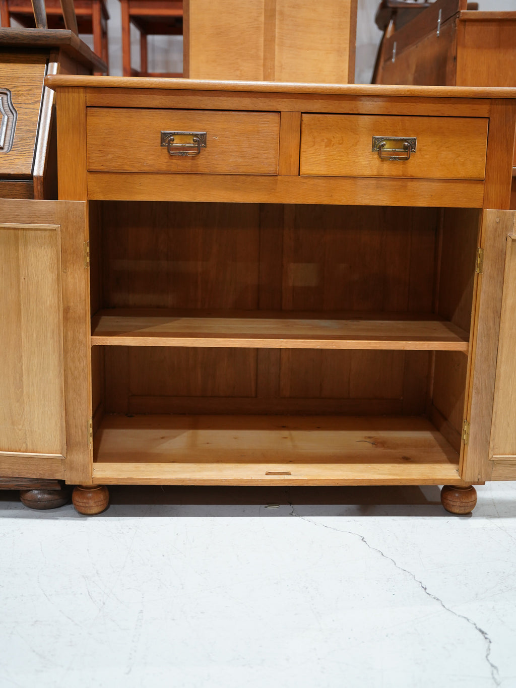 【ヴィンテージキャビネット】オークウッドの温もりが感じられる、引き出しと扉収納を備えたクラシカルサイドボード