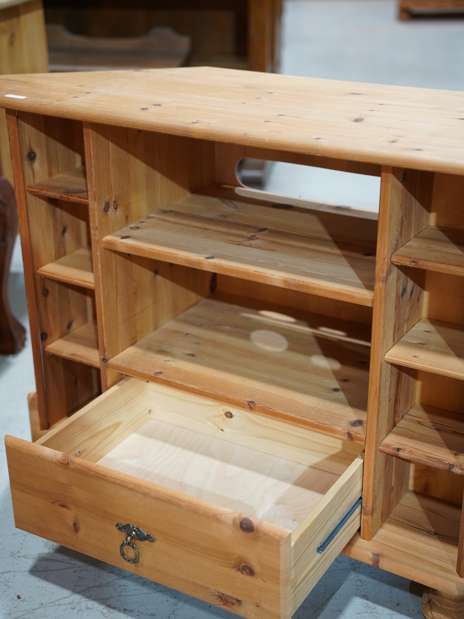 上部には真鍮製の引き手が付いたドロワー、下部には観音開きの収納扉があり、実用的な収納力を持ちます。