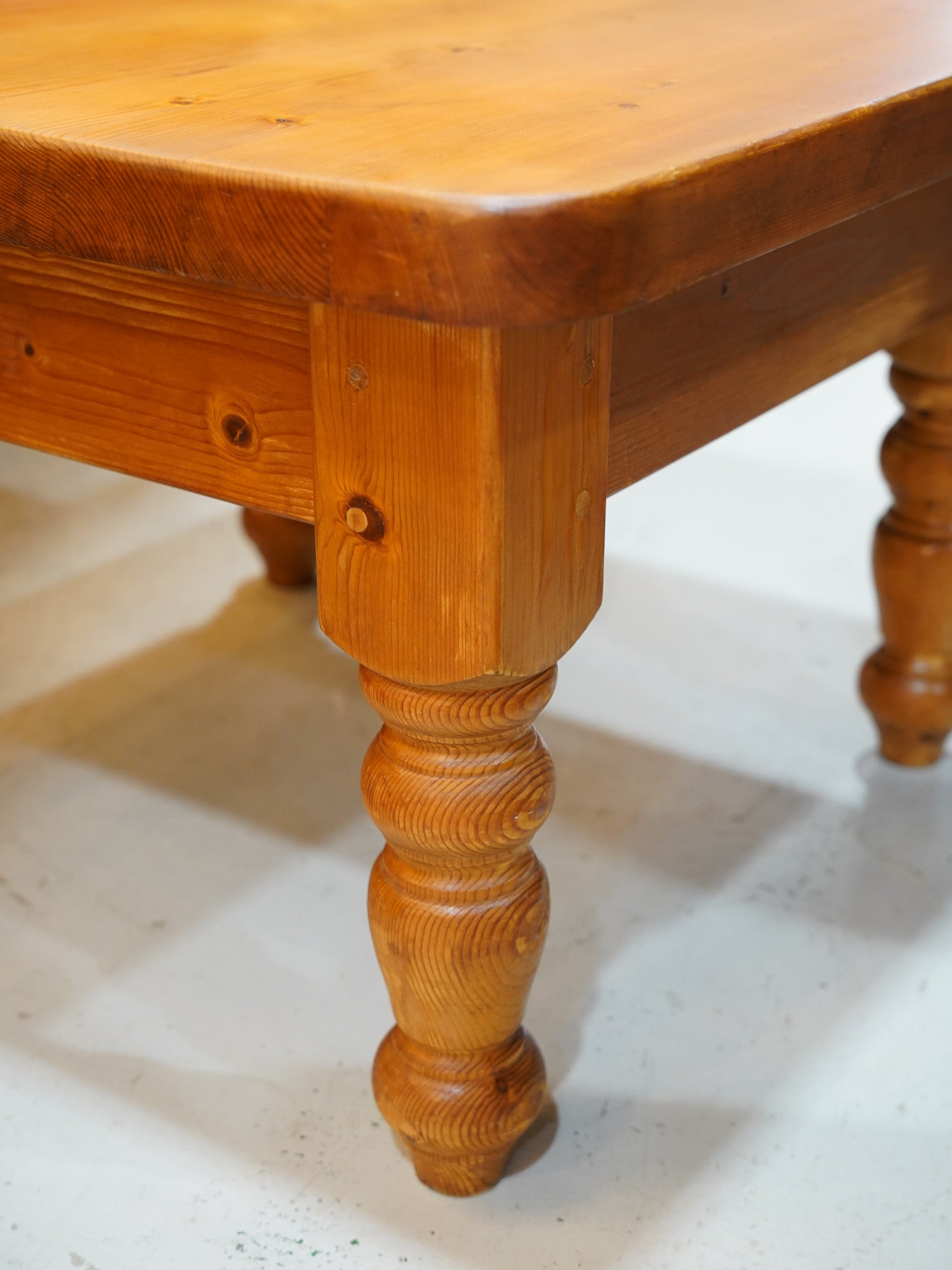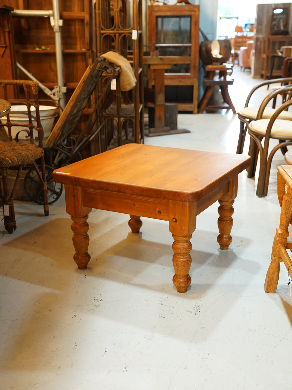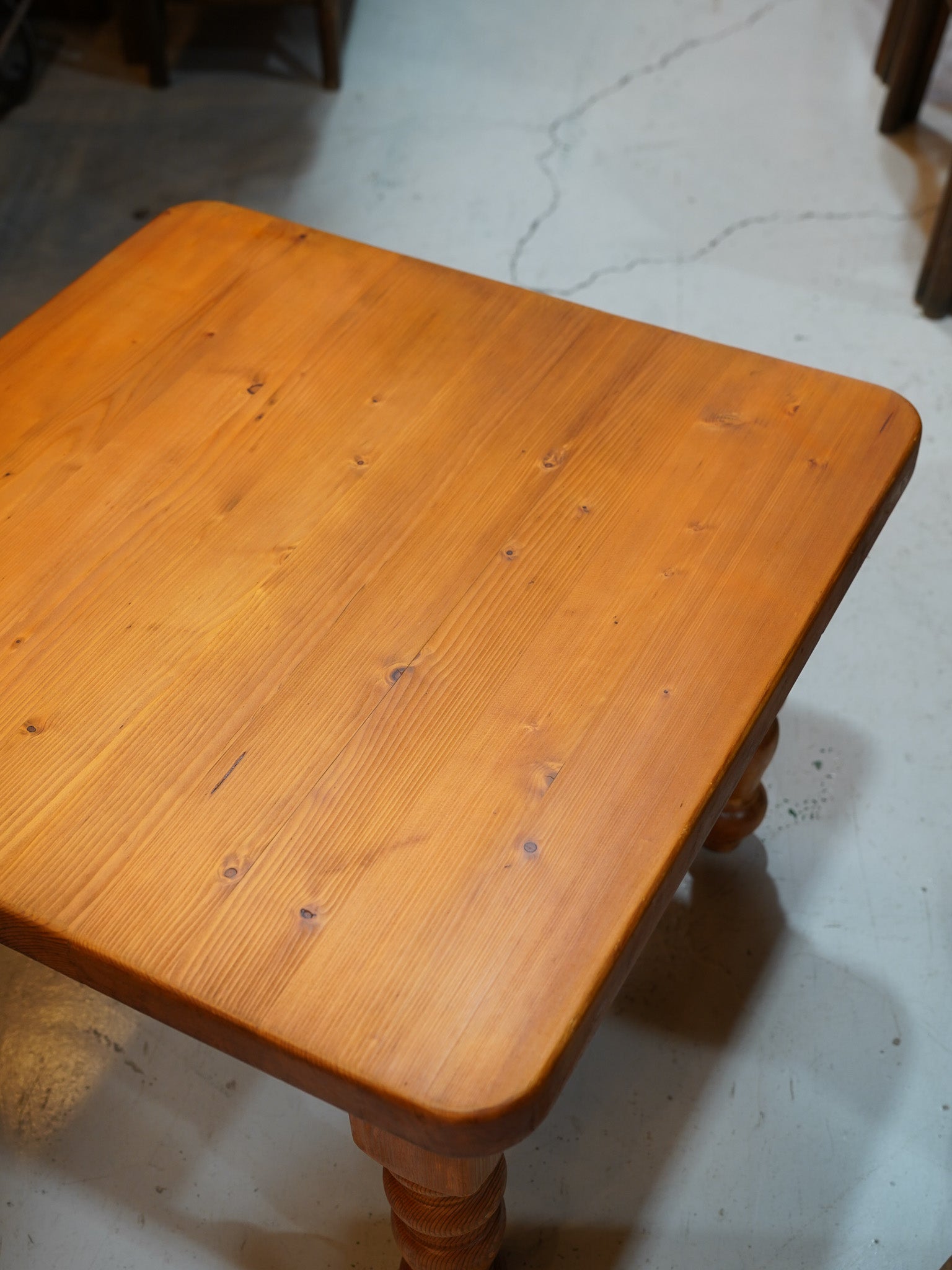 【カントリーヴィンテージ】ろくろ脚が愛らしいパインウッドの温かいスクエアローテーブル