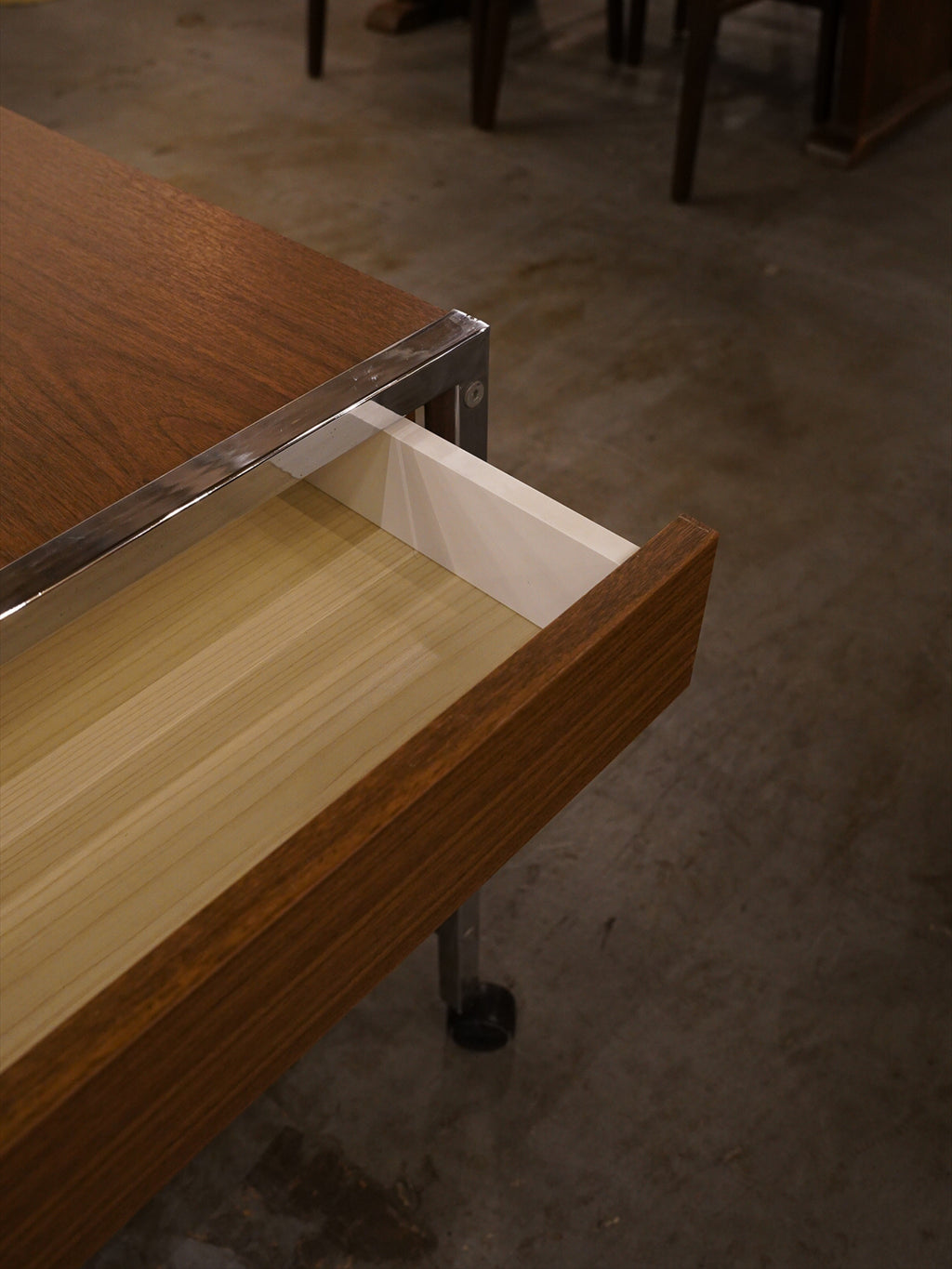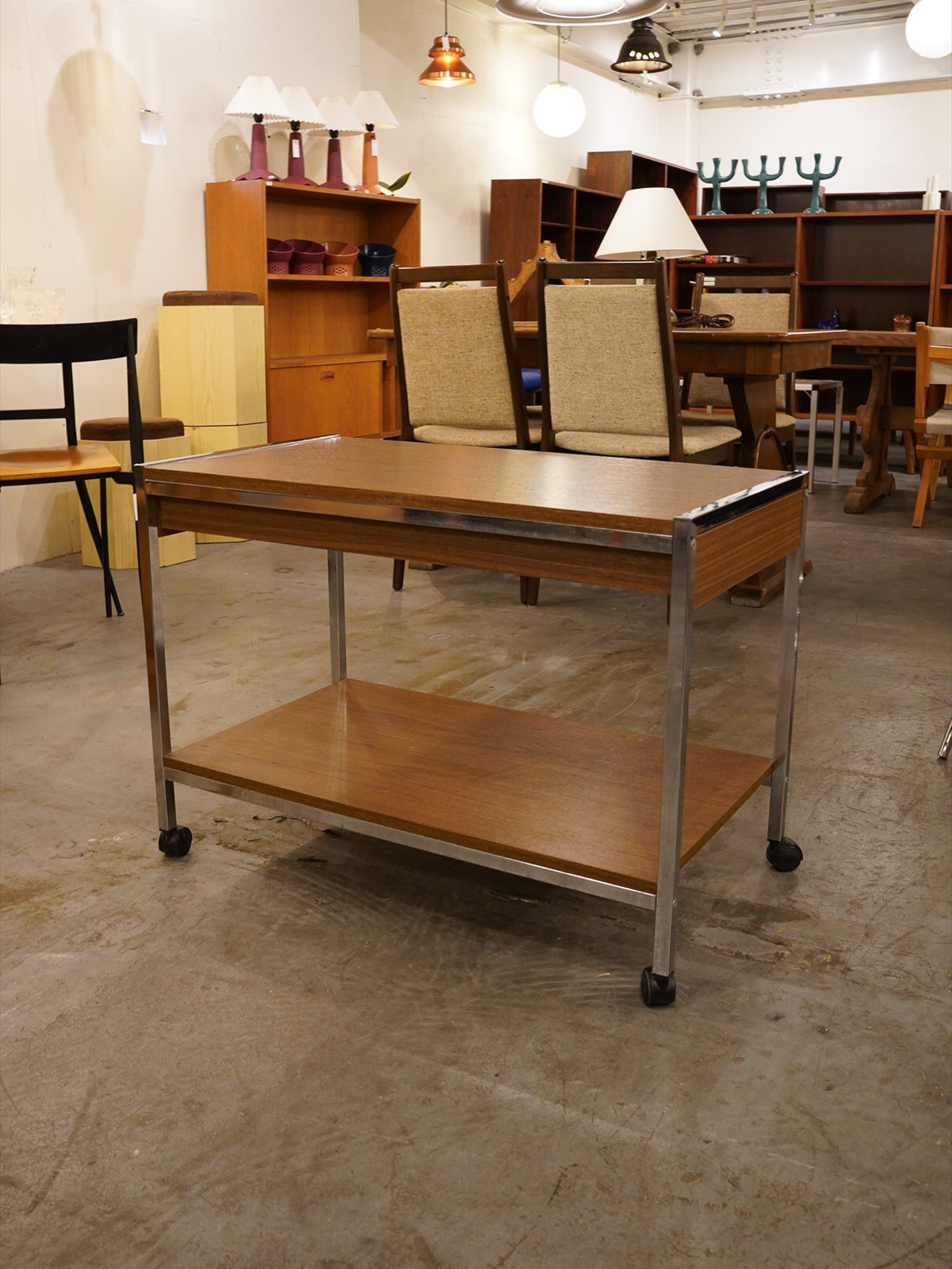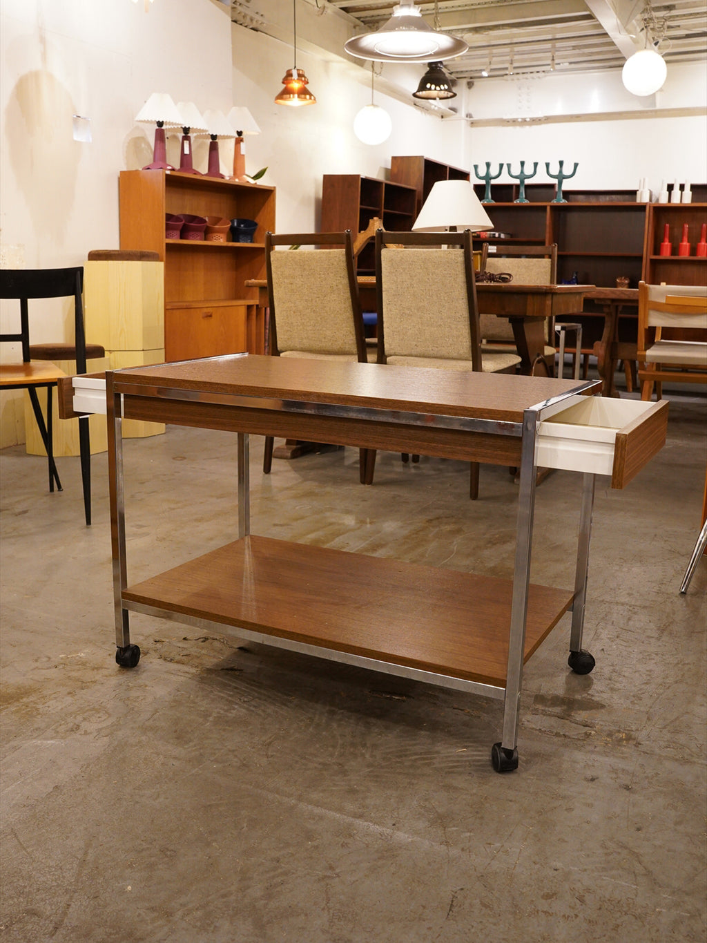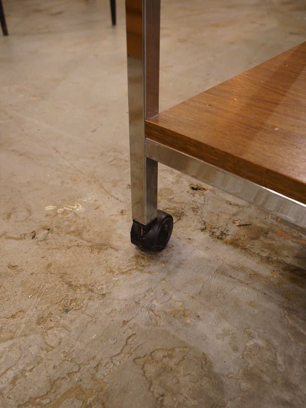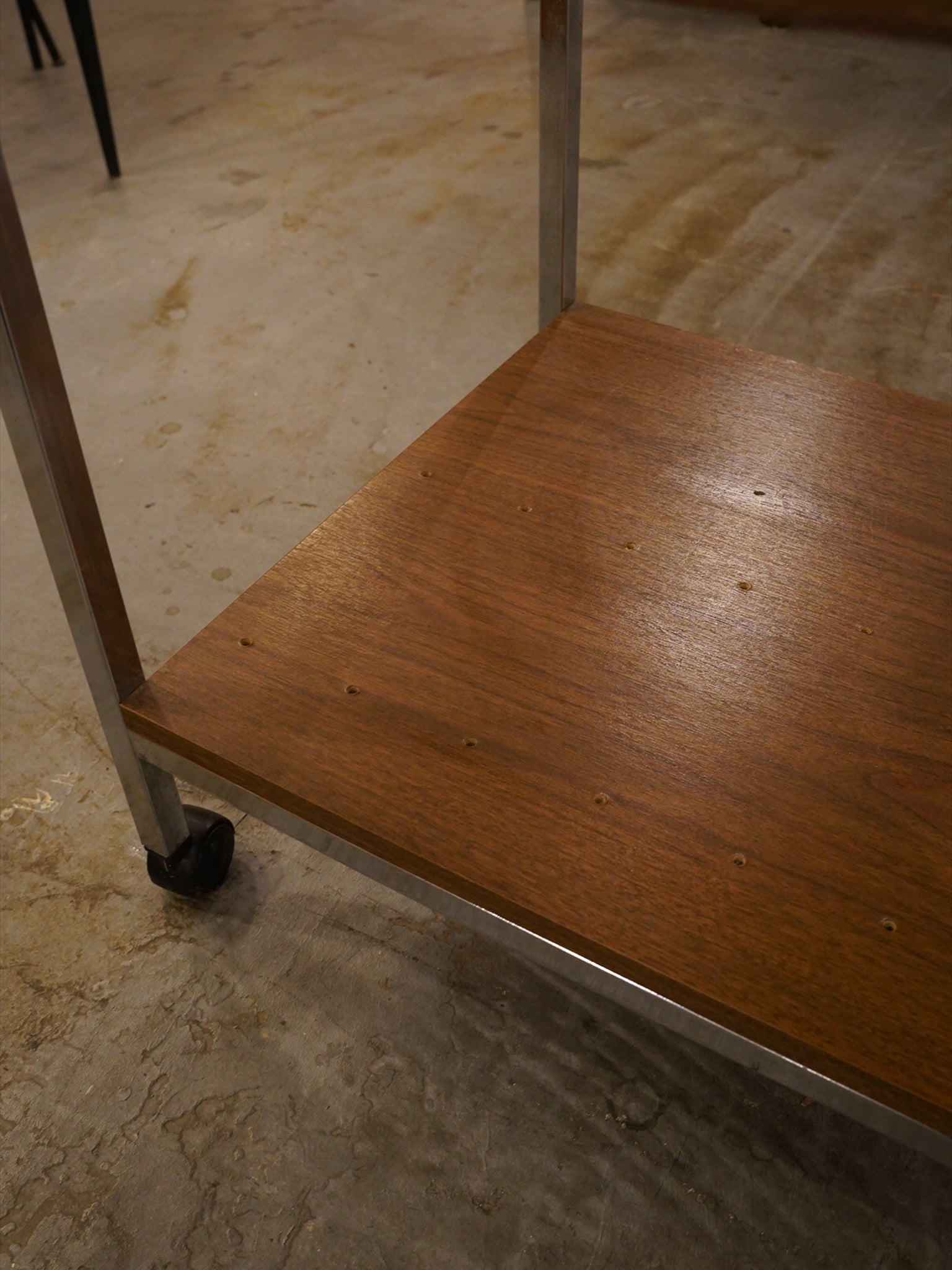 角張ったクロムメッキのフレームと、温かみのある木材の棚板・天板のコントラストが、1960〜70年代らしいモダンで洗練された雰囲気を醸し出しています。