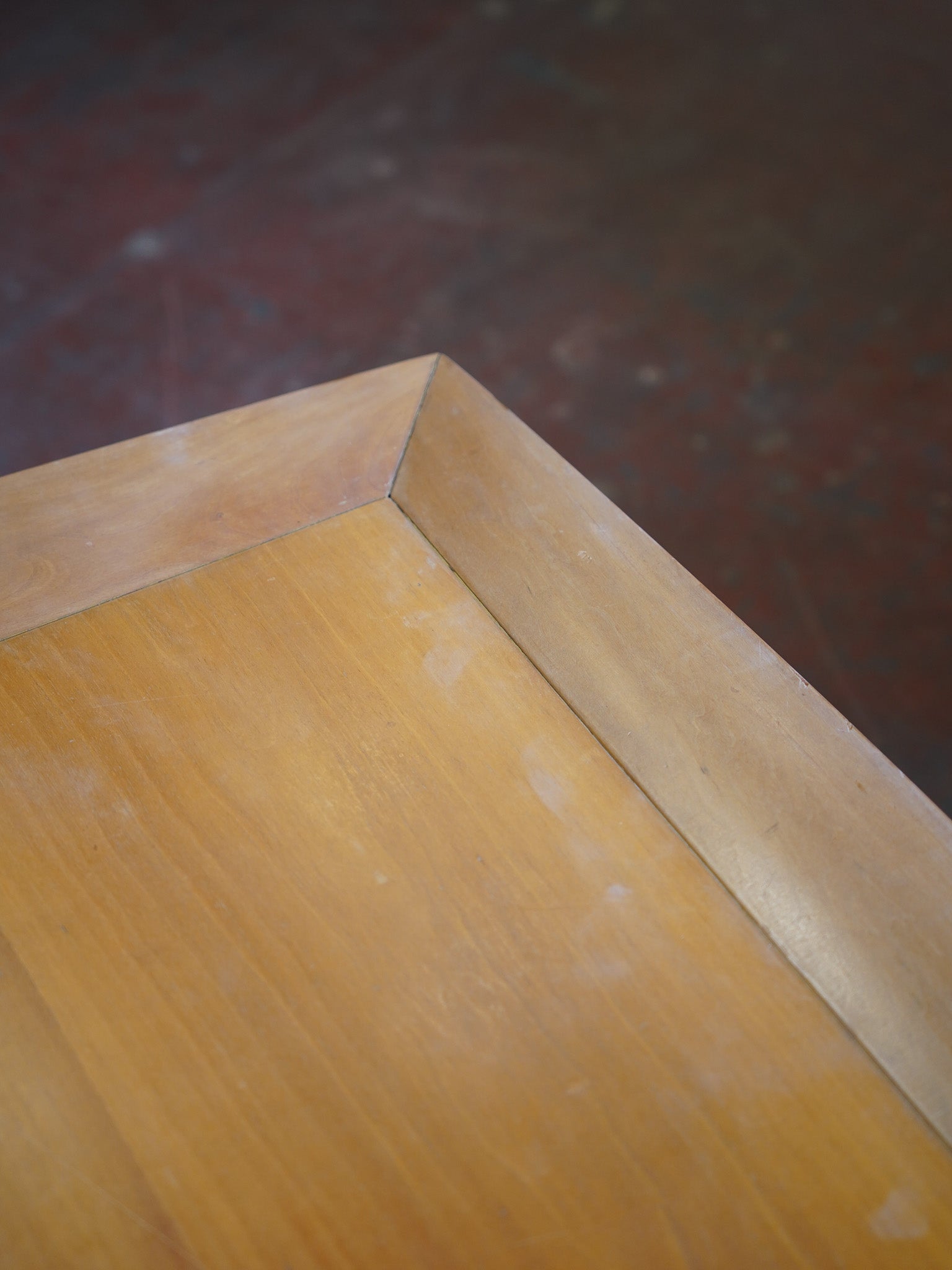 天板は縁が立ち上がったトレー状の構造となっており、実用性も兼ね備えます。彫刻的なフォルムと機能性が融合した、リビングの主役となるヴィンテージテーブルです。