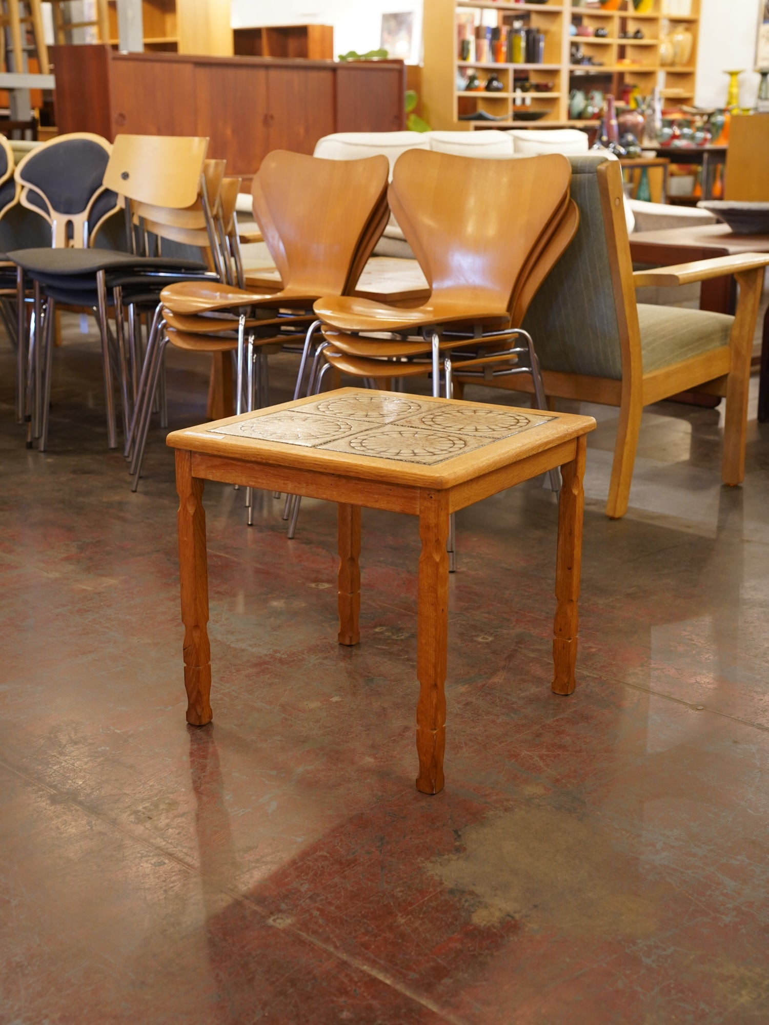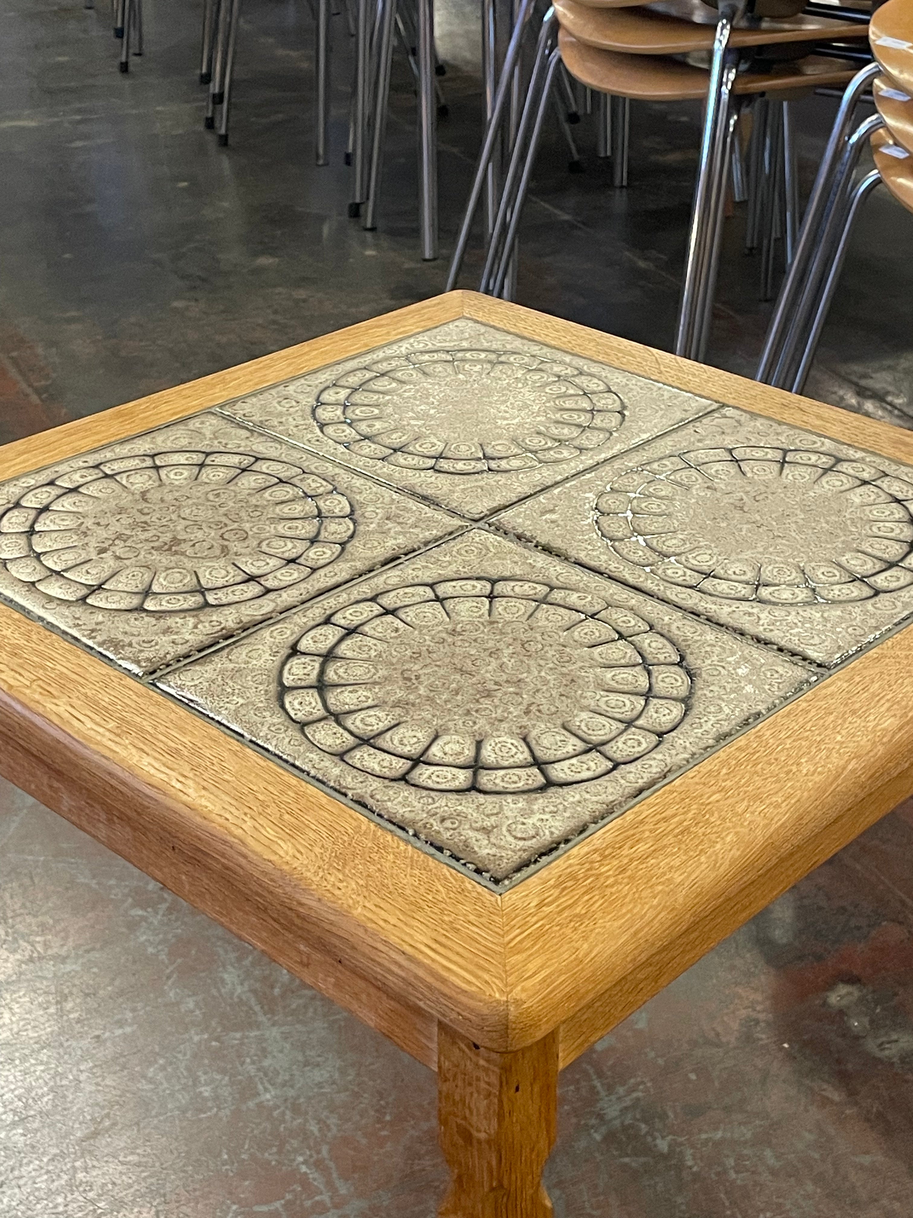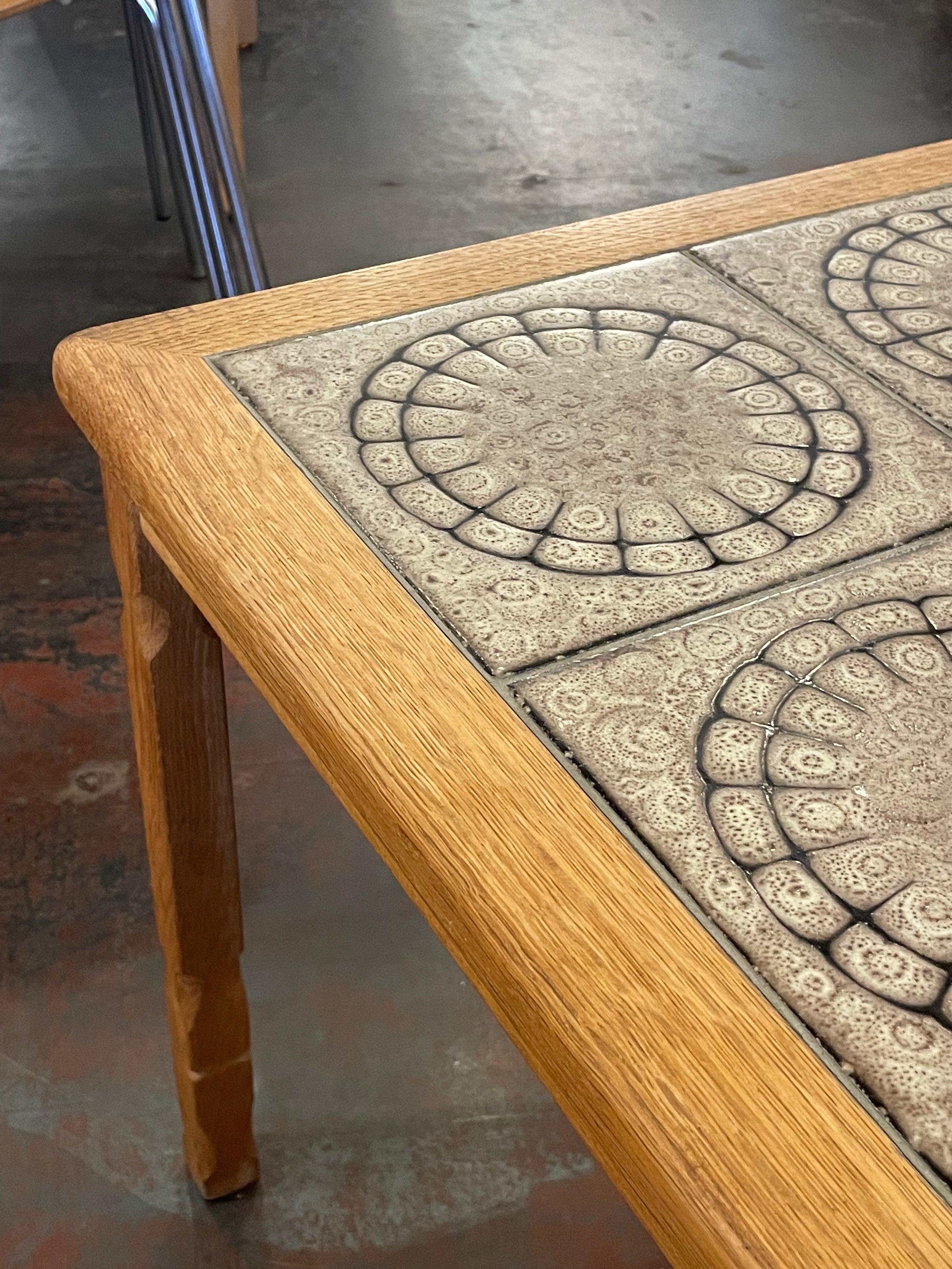 オークウッドのフレームに、精緻な幾何学模様の陶器タイルをはめ込んだヴィンテージタイルトップテーブル。