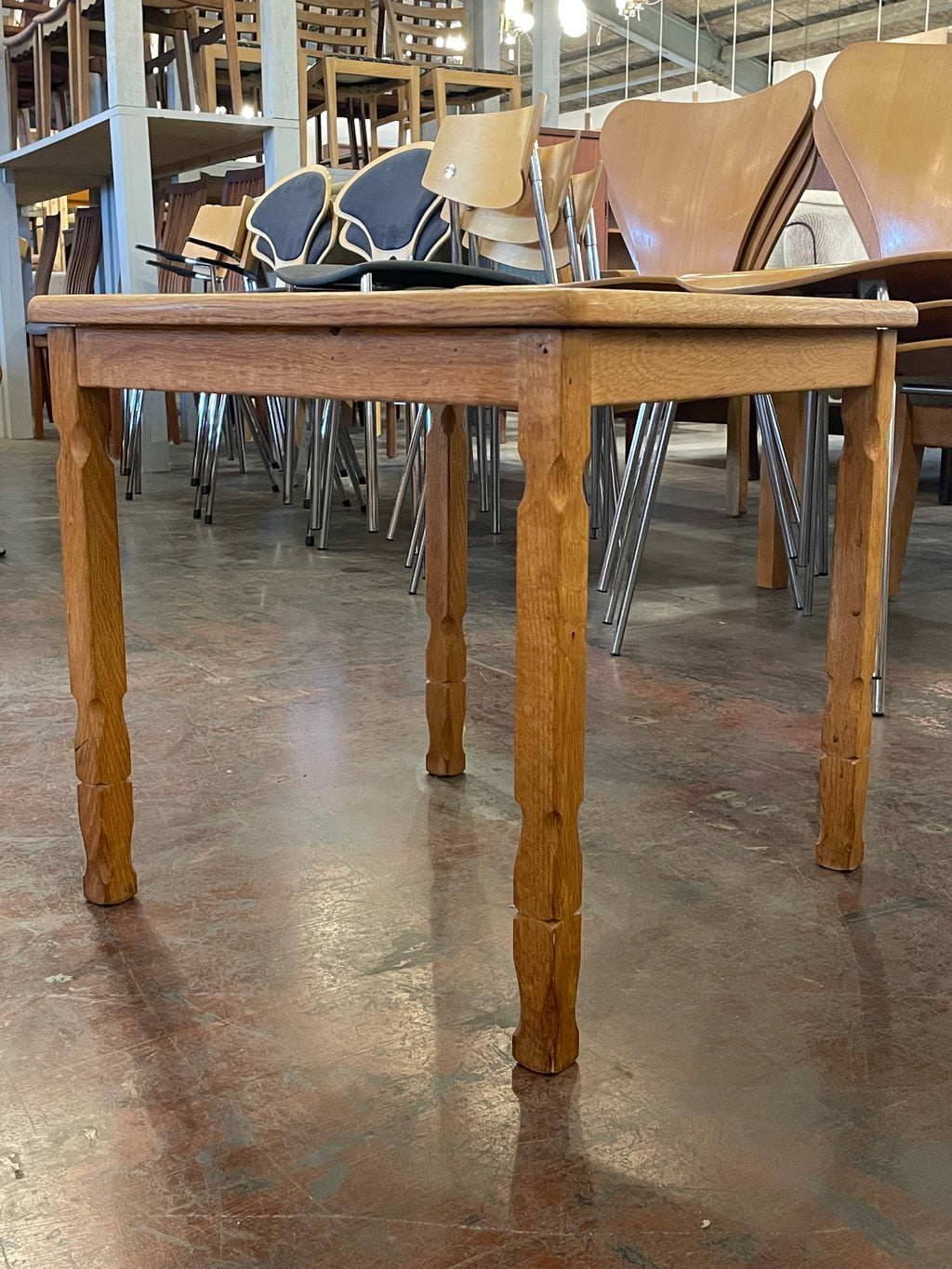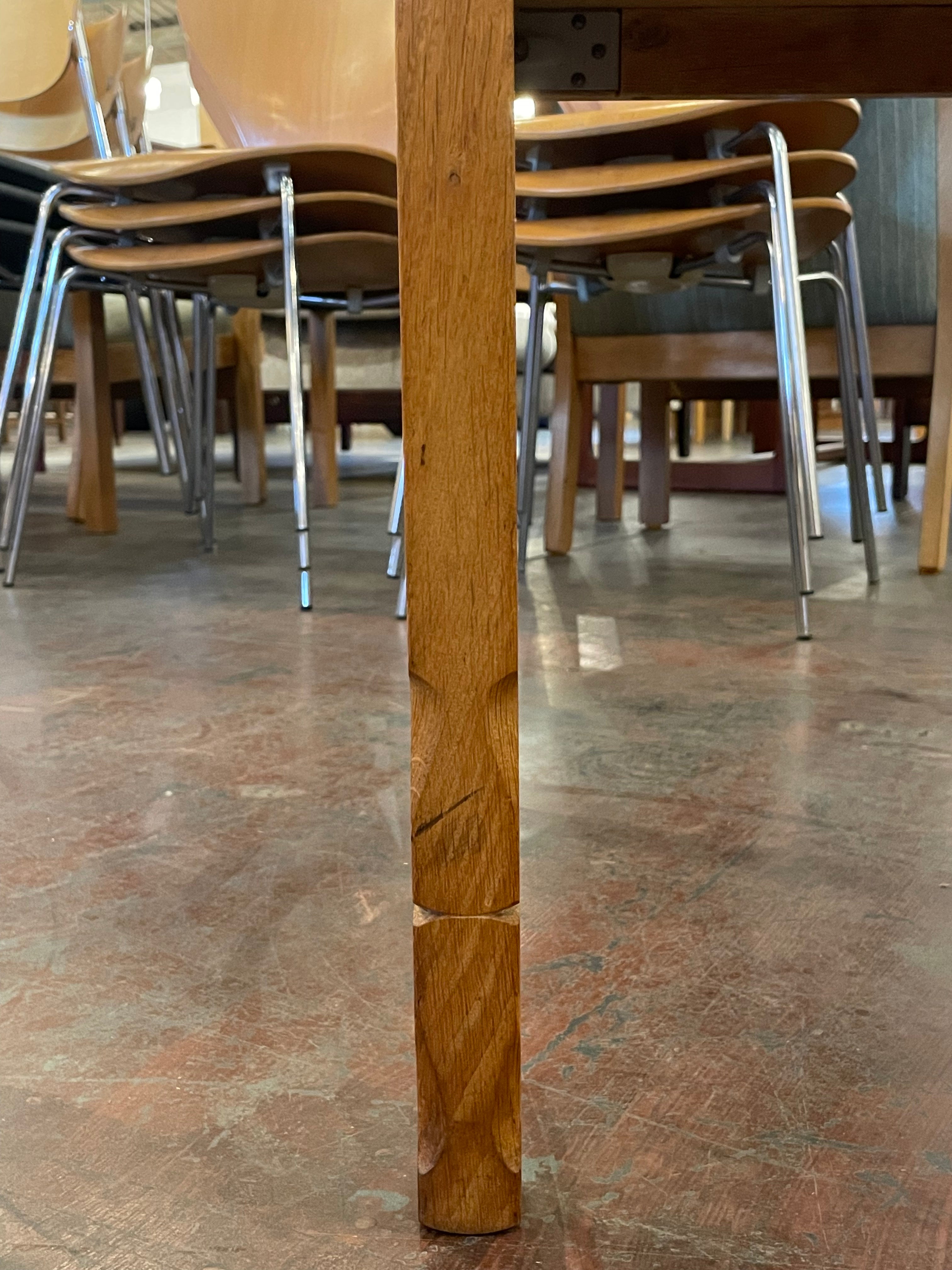 脚部にはオークウッドの素朴な木目を活かしつつ、わずかな削り出しの装飾が施され、デザインに奥行きを与えています。